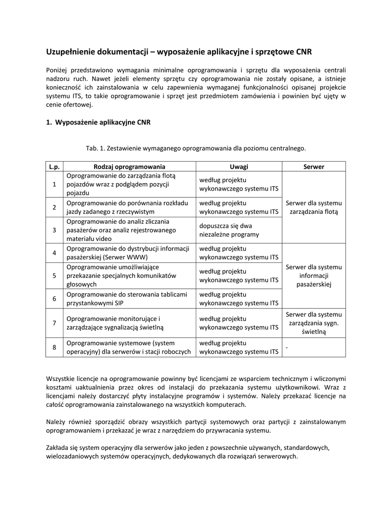 Uzupełnienie dokumentacji – wyposażenie aplikacyjne i sprzętowe CNR Poniżej przedstawiono wymagania minimalne oprogramowania i sprzętu dla wyposażenia centrali nadzoru ruch. Nawet jeżeli elementy sprzętu czy oprogramowania nie zostały opisane, a istnieje koniecznośd ich zainstalowania w celu zapewnienia wymaganej funkcjonalności opisanej projekcie systemu ITS, to takie oprogramowanie i sprzęt jest przedmiotem zamówienia i powinien byd ujęty w cenie ofertowej. 1. Wyposażenie aplikacyjne CNR Tab. 1. Zestawienie wymaganego oprogramowania dla poziomu centralnego. L.p. 1 2 3 4 5 6 Rodzaj oprogramowania Oprogramowanie do zarządzania flotą pojazdów wraz z podglądem pozycji pojazdu Oprogramowanie do porównania rozkładu jazdy zadanego z rzeczywistym Oprogramowanie do analiz zliczania pasażerów oraz analiz rejestrowanego materiału video Oprogramowanie do dystrybucji informacji pasażerskiej (Serwer WWW) Oprogramowanie umożliwiające przekazanie specjalnych komunikatów głosowych Oprogramowanie do sterowania tablicami przystankowymi SIP Uwagi Serwer według projektu wykonawczego systemu ITS według projektu wykonawczego systemu ITS Serwer dla systemu zarządzania flotą dopuszcza się dwa niezależne programy według projektu wykonawczego systemu ITS według projektu wykonawczego systemu ITS Serwer dla systemu informacji pasażerskiej według projektu wykonawczego systemu ITS 7 Oprogramowanie monitorujące i zarządzające sygnalizacją świetlną według projektu wykonawczego systemu ITS Serwer dla systemu zarządzania sygn. świetlną 8 Oprogramowanie systemowe (system operacyjny) dla serwerów i stacji roboczych według projektu wykonawczego systemu ITS - Wszystkie licencje na oprogramowanie powinny byd licencjami ze wsparciem technicznym i wliczonymi kosztami uaktualnienia przez okres od instalacji do przekazania systemu użytkownikowi. Wraz z licencjami należy dostarczyd płyty instalacyjne programów i systemów. Należy przekazad licencje na całośd oprogramowania zainstalowanego na wszystkich komputerach. Należy również sporządzid obrazy wszystkich partycji systemowych oraz partycji z zainstalowanym oprogramowaniem i przekazad je wraz z narzędziem do przywracania systemu. Zakłada się system operacyjny dla serwerów jako jeden z powszechnie używanych, standardowych, wielozadaniowych systemów operacyjnych, dedykowanych dla rozwiązao serwerowych. 2. Wyposażenie sprzętowe informatyczne CNR Tab. 2. Zestawienie wymaganego sprzętu informatycznego dla poziomu centralnego. L.p. Rodzaj wyposażenia Uwagi ilośd sztuk 1 Serwer dla systemu zarządzania flotą według specyfikacji oprogramowania jednak nie gorszy niż wymagania poniżej 1 2 Serwer dla systemu informacji pasażerskiej według specyfikacji oprogramowania jednak nie gorszy niż wymagania poniżej 1 3 Serwer dla systemu monitorowania i zarządzania sygnalizacją świetlną według specyfikacji oprogramowania jednak nie gorszy niż wymagania poniżej 1 4 Stacje robocze operatorskie wraz z klawiaturą, myszą i okablowaniem 3 5 Monitory LCD dla operatorów 6 Ekrany LCD do montażu na ścianie 7 8 9 Urządzenie biurowe wielofunkcyjne (drukarka – kopiarka -skaner) Okablowanie strukturalne lokalnej sieci komputerowej wraz z urządzeniami układ zasilania awaryjnego UPS Monitory o przekątnej 22 cale Ekrany o przekątnej 52 cale wraz z elementami mocującymi 6 wymagania poniżej 1 według wymagao oprogramowania 1 wymagania poniżej 1 2 Serwery Parametry serwerów (moc obliczeniowa, ilośd procesorów, pojemnośd macierzy) należy dobrad z uwzględnieniem właściwości wybranego rozwiązania zarówno w zakresie doboru systemu operacyjnego, oprogramowania przetwarzającego dane jak i kompresji danych. Wymogiem zamawiającego jest zapewnienie na macierzy minimum 100 % więcej przestrzeni niż wymagana pojemnośd dla potrzeb systemów. Dotyczy to każdej z macierzy niezależnie. Charakterystyka serwerów: umożliwiające instalację w szafie serwerowej 19”; możliwośd wyposażenia w co najmniej 16 GB pamięci RAM; wyposażone w procesory co najmniej dwu- lub czterordzeniowe klasy serwer; wyposażone w macierze dyskowe; wyposażone w system backupu danych systemu. Wymagania dotyczące stacji roboczych - operatorskich. Windows VISTA Ultimate PL (lub porównywalny) Procesor: Intel Core2 Quad Extreme QX9650 3,00 GHz (lub porównywalny) Płyta główna: Asus Rampage Extreme Intel X48 (lub porównywalny) Pamięd RAM: 2x DDR3 2x 2GB 1333MHz CL9 DHX (lub porównywalny) Karta graficzna: Radeon 4870 X2 Asus 2GB 2xDVI (lub porównywalny) Dysk twardy: 1TB Serial ATA II (32 MB ciche) (lub porównywalny) Napęd optyczny: LG Blu-ray (DVD+/-RW + HD-DVD) black (lub porównywalny) Obudowa: CoolerMaster Cosmos 1000 Black-Silver (lub porównywalny) Zasilacze ATX: Be-quiet Dark Power P7-PRO-850W (lub porównywalny) 2 Monitory LCD dla każdej stacji - 22" iiyama ProLite E2200(lub porównywalny) Ekrany LCD do montażu na ścianie minimalna przekątnej: 52 cale; minimalna rozdzielczośd: 1920x1080; wraz z elementami mocującymi do ściany. Urządzenie biurowe wielofunkcyjne (drukarka – kopiarka -skaner) Wymaga się wielofunkcyjnego urządzenia pełniące rolę skanera, kopiarki i kolorowej drukarki laserowej. Parametry: minimalna rozdzielczośd 2400 x 600 dpi; drukowanie z prędkością minimalną 24 str./min; dla skanera minimalna rozdzielczośd optyczną 1200 x 2400 dpi; złącze Ethernet; automatyczny tryb druku dwustronnego; automatyczny podajnik dokumentów na min. 35 arkuszy. Okablowanie strukturalne lokalnej sieci komputerowej wraz z urządzeniami sieciowymi Okablowanie i urządzenia sieciowe należy zaprojektowad i wykonad według wymagao zaproponowanego systemu. Należy wykonad podłączenie do sieci Internet w celu zapewnienia komunikacji do urządzeo terenowych stałych i mobilnych przez APN. Zgodnie z projektem systemu ITS. Wybór operatora dla połączenia Internetowego i GPRS uzgodnid z Zamawiającym. Wymagani