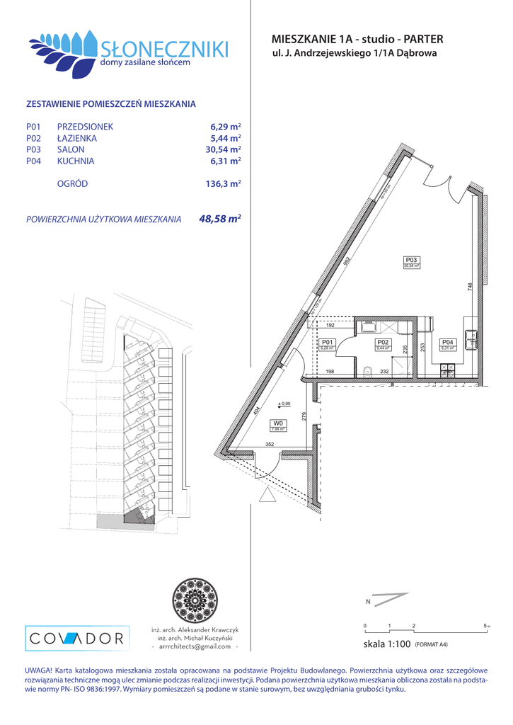 MIESZKANIE 1A - studio - PARTER ul. J. Andrzejewskiego 1/1A Dąbrowa 6,29 m2 5,44 m2 30,54 m2 6,31 m2 OGRÓD 136,3 m2 90 c PRZEDSIONEK ŁAZIENKA SALON KUCHNIA hp = P01 P02 P03 P04 m ZESTAWIENIE POMIESZCZEŃ MIESZKANIA 48,58 m2 P03 99 2 POWIERZCHNIA UŻYTKOWA MIESZKANIA hp =1 20 cm 748 30,54 m² P02 5,44 m² 198 232 235 P01 6,29 m² 253 192 P04 6,31 m² 250 W0 279 40 4 ± 0,00 7,99 m² 352 N inż. arch. Aleksander Krawczyk inż. arch. Michał Kuczyński - [email protected] - 0 1 skala 1:100 2 5m (FORMAT A4) UWAGA! Karta katalogowa mieszkania została opracowana na podstawie Projektu Budowlanego. Powierzchnia użytkowa oraz szczegółowe rozwiązania techniczne mogą ulec zmianie podczas realizacji inwestycji. Podana powierzchnia użytkowa mieszkania obliczona została na podstawie normy PN- ISO 9836:1997. Wymiary pomieszczeń są podane w stanie surowym, bez uwzględniania grubości tynku.