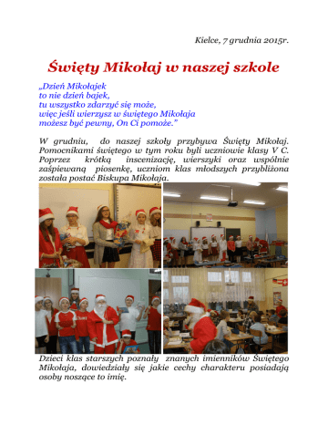 Kielce, 7 grudnia 2015r. Święty Mikołaj w naszej szkole „Dzień Mikołajek to nie dzień bajek, tu wszystko zdarzyć się może, więc jeśli wierzysz w świętego Mikołaja możesz być pewny, On Ci pomoże.” W grudniu, do naszej szkoły przybywa Święty Mikołaj. Pomocnikami świętego w tym roku byli uczniowie klasy V C. Poprzez krótką inscenizację, wierszyki oraz wspólnie zaśpiewaną piosenkę, uczniom klas młodszych przybliżona została postać Biskupa Mikołaja. Dzieci klas starszych poznały znanych imienników Świętego Mikołaja, dowiedziały się jakie cechy charakteru posiadają osoby noszące to imię. Przybyły gość zachęcił klasy starsze do czytania książek o przygodach Mikołajka, złożył wszystkim świąteczne życzenia: ,,Prezentów bez liku i choinki do sufitu, czyli świąt na 102 – tego życzę ja”. Każdy uczeń otrzymał słodki upominek ufundowany przez Radę Rodziców. Dziękujemy za wizytę, z niecierpliwością będziemy czekać na świętego Mikołaja za rok. Do zobaczenia!