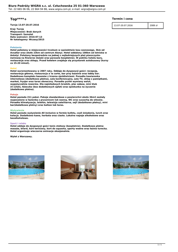 Biuro Podróży WIGRA s.c. ul. Człuchowska 25 01-360 Warszawa Tel. 22 665 06 06, 22 664 94 86, www.wigra.com.pl, e-mail: [email protected] Top****+ Turcja 13.07-20.07.2016 Termin i cena 13.07-20.07.2016 2089 zł Kraj: Turcja Miejscowość: Brak danych Transport: Samolot Data ważności: 2016-07-13 Nr katalogowy: Wczasy/2015 Położenie Hotel położony w miejscowości Incekum w sąsiedztwie lasu sosnowego, 3km od Avsallar oraz około 23km od centrum Alanyi. Hotel oddalony 100km od lotniska w Antalyi. Położony bezpośrednio na jednej z najładniejszych plaż piaszczystożwirowej na Riwierze (leżaki oraz parasole bezpłatnie). W pobliżu hotelu bary, restauracje oraz sklepy. Przed hotelem znajduje się przystanek autobusowy (kursy co 15-20 minut). Hotel Hotel wyremontowany w 2007 roku. Oddaje do dyspozycji gości: recepcję, restauracja główna, restauracja a`la carte, bar przy basenie oraz lobby bar. Dodatkowo kompleks basenów z trzema zjeżdżalniami. Ponadto kawiarenka internetowa (dodatkowo płatna), sala konferencyjna, sala TV, sklep z pamiątkami, market, fryzjer oraz taras słoneczny. Ponadto punkt wymiany walut, wypożyczalnia rowerów. Dla najmłodszych brodzik, plac zabaw, mini klub (4-12lat), łóżeczko (bez dodatkowych opłat) oraz opiekunka na życzenie (dodatkowo płatna). Pokoje Hotel posiada 211 pokoi. Pokoje standardowe o powierzchni około 36m2 zostały wyposażone w łazienkę z prysznicem lub wanną, WC oraz suszarką do włosów. Ponadto klimatyzacja, telefon, telewizja satelitarna, sejf (dodatkowo płatny), mini bar(dodatkowo płatny) oraz balkon lub taras. Wyżywienie Hotel posiada wyżywienie All inclusive w formie bufetu, czyli śniadania, lunch oraz kolacja. Dodatkowo kawa, herbata oraz ciasto. Lokalne napoje alkoholowe oraz bezalkoholowe. Sport i relaks Hotel oddaje do dyspozycji gości tenis stołowy (bezpłatnie). Dodatkowo płatne masaże, bilard, kort tenisowy, kort do squasha, sporty wodne oraz łaźnia turecka. Hotel organizuje wieczorne animacje okazjonalnie. Wylot z Warszawy. 1/1 Powered by TCPDF (www.tcpdf.org)