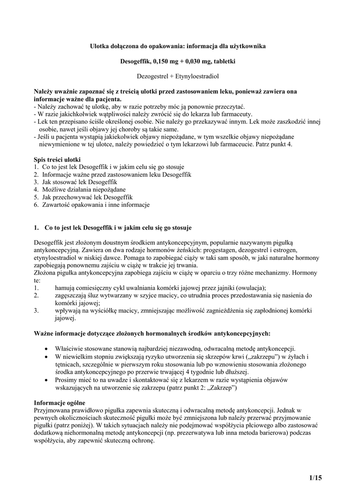 Ulotka dołączona do opakowania: informacja dla użytkownika Desogeffik, 0,150 mg + 0,030 mg, tabletki Dezogestrel + Etynyloestradiol Należy uważnie zapoznać się z treścią ulotki przed zastosowaniem leku, ponieważ zawiera ona informacje ważne dla pacjenta. - Należy zachować tę ulotkę, aby w razie potrzeby móc ją ponownie przeczytać. - W razie jakichkolwiek wątpliwości należy zwrócić się do lekarza lub farmaceuty. - Lek ten przepisano ściśle określonej osobie. Nie należy go przekazywać innym. Lek może zaszkodzić innej osobie, nawet jeśli objawy jej choroby są takie same. - Jeśli u pacjenta wystąpią jakiekolwiek objawy niepożądane, w tym wszelkie objawy niepożądane niewymienione w tej ulotce, należy powiedzieć o tym lekarzowi lub farmaceucie. Patrz punkt 4. Spis treści ulotki 1. Co to jest lek Desogeffik i w jakim celu się go stosuje 2. Informacje ważne przed zastosowaniem leku Desogeffik 3. Jak stosować lek Desogeffik 4. Możliwe działania niepożądane 5. Jak przechowywać lek Desogeffik 6. Zawartość opakowania i inne informacje 1. Co to jest lek Desogeffik i w jakim celu się go stosuje Desogeffik jest złożonym doustnym środkiem antykoncepcyjnym, popularnie nazywanym pigułką antykoncepcyjną. Zawiera on dwa rodzaje hormonów żeńskich: progestagen, dezogestrel i estrogen, etynyloestradiol w niskiej dawce. Pomaga to zapobiegać ciąży w taki sam sposób, w jaki naturalne hormony zapobiegają ponownemu zajściu w ciążę w trakcie jej trwania. Złożona pigułka antykoncepcyjna zapobiega zajściu w ciążę w oparciu o trzy różne mechanizmy. Hormony te: 1. hamują comiesięczny cykl uwalniania komórki jajowej przez jajniki (owulacja); 2. zagęszczają śluz wytwarzany w szyjce macicy, co utrudnia proces przedostawania się nasienia do komórki jajowej; 3. wpływają na wyściółkę macicy, zmniejszając możliwość zagnieżdżenia się zapłodnionej komórki jajowej. Ważne informacje dotyczące złożonych hormonalnych środków antykoncepcyjnych: • • • Właściwie stosowane stanowią najbardziej niezawodną, odwracalną metodę antykoncepcji. W niewielkim stopniu zwiększają ryzyko utworzenia się skrzepów krwi („zakrzepu”) w żyłach i tętnicach, szczególnie w pierwszym roku stosowania lub po wznowieniu stosowania złożonego środka antykoncepcyjnego po przerwie trwającej 4 tygodnie lub dłuższej. Prosimy mieć to na uwadze i skontaktować się z lekarzem w razie wystąpienia objawów wskazujących na utworzenie się zakrzepu (patrz punkt 2: „Zakrzep”) Informacje ogólne Przyjmowana prawidłowo pigułka zapewnia skuteczną i odwracalną metodę antykoncepcji. Jednak w pewnych okolicznościach skuteczność pigułki może być zmniejszona lub należy przerwać przyjmowanie pigułki (patrz poniżej). W takich sytuacjach należy nie podejmować współżycia płciowego albo zastosować dodatkową niehormonalną metodę antykoncepcji (np. prezerwatywa lub inna metoda barierowa) podczas współżycia, aby zapewnić skuteczną ochronę. 1/15 Nie należy stosować metody kalendarzykowej ani metody termicznej. Metody te mogą nie być skuteczne, ponieważ lek Desogeffik powoduje zmiany temperatury ciała i śluzu szyjkowego podczas cyklu miesięcznego. Należy pamiętać, że złożone doustne środki antykoncepcyjne takie jak Desogeffik nie chronią przed chorobami przenoszonymi drogą płciową (np. AIDS). Jedynie stosowanie prezerwatywy ma działanie ochronne. 2. Informacje ważne przed zastosowaniem leku Desogeffik Uwagi ogólne Przed rozpoczęciem stosowania leku Desogeffik należy uważnie przeczytać informacje dotyczące zakrzepów krwi zawarte w punkcie 2. Szczególnie ważne jest zapoznanie się z objawami wskazujących na utworzenie się zakrzepu – patrz punkt 2 „Zakrzep”. Przed rozpoczęciem stosowania leku Desogeffik lekarz prowadzący zada pacjentce kilka pytań dotyczących historii chorób pacjentki oraz jej bliskich krewnych. Ponadto lekarz zmierzy pacjentce ciśnienie krwi oraz może przeprowadzić również inne badania, zależne od stanu zdrowia pacjentki. Kiedy nie stosować leku Desogeffik Leku Desogeffik nie należy stosować, jeśli u pacjentki występuje którekolwiek z zaburzeń wymienionych poniżej. Jeśli u pacjentki występuje którekolwiek z poniższych zaburzeń, należy poinformować o tym lekarza. Lekarz omówi z pacjentką inne, bardziej stosowne metody antykoncepcji. • jeśli u pacjentki występuje lub występował w przeszłości zakrzep w naczyniach krwionośnych nóg (zakrzepica żył głębokich), płuc (czop zatorowy) lub innych narządów; • jeśli pacjentka wie, że występuje u niej zaburzenie krzepliwości krwi – na przykład niedobór białka C, niedobór białka S, niedobór antytrombiny III, czynnik V Leidena lub przeciwciała antyfosfolipidowe; • jeśli wymagane jest przeprowadzenie zabiegu chirurgicznego lub unieruchomienie przez dłuższy czas (patrz punkt „Zakrzep”); • jeśli u pacjentki kiedykolwiek wystąpił zawał serca lub udar mózgu; • jeśli u pacjentki występuje (lub występowała w przeszłości) dusznica bolesna (choroba, która powoduje silny ból w klatce piersiowej i może być zwiastunem ataku serca) lub przemijający atak niedokrwienny (przejściowe objawy udaru); • jeśli u pacjentki występuje którakolwiek z następujących chorób mogących zwiększać ryzyko wystąpienia zakrzepu w tętnicy: - ciężka cukrzyca z uszkodzeniem naczyń krwionośnych, - bardzo wysokie ciśnienie krwi, - bardzo wysoki poziom tłuszczów we krwi (cholesterol lub triglicerydy), - zaburzenie zwane hiperhomocysteinemią; • jeśli u pacjentki występuje (lub występował w przeszłości) rodzaj migreny zwany „migreną z aurą”; • jeśli u pacjentki występuje (lub występował w przeszłości) stan zapalny trzustki (zapalenie trzustki); • jeśli u pacjentki występuje lub występowała w przeszłości choroba wątroby i jeszcze nie d