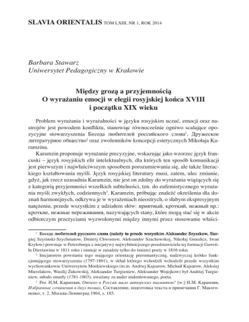 SLAVIA ORIENTALIS tom lxIII, nr 1, rok 2014 Barbara Stawarz Uniwersytet Pedagogiczny w Krakowie Między grozą a przyjemnością O wyrażaniu emocji w elegii rosyjskiej końca XVIII i początku XIX wieku Problem wyrażania i wyrażalności w języku rosyjskim uczuć, emocji oraz nastrojów jest powodem konfliktu, stanowiąc równocześnie ogniwo scalające opozycyjne stowarzyszenia Беседa любителей российского слова1, Дружескоe литературноe обществo2 oraz zwolenników koncepcji estetycznych Mikołaja Karamzina. Karamzin proponuje wyrażanie precyzyjne, wskazując jako wzorzec język francuski – język rosyjskich elit intelektualnych, dla których ten sposób komunikacji jest pierwszym i najwłaściwszym sposobem porozumiewania się, ale także literackiego kształtowania myśli. Język rosyjskiej literatury musi, zatem, ulec zmianie, gdyż, jak rzecz uzasadnia Karamzin, nie jest on zdolny do wyrażania wiążących się z kategorią przyjemności wszelkich subtelności, tzn. do eufemistycznego wyrażania myśli zwykłych, codziennych3. Karamzin, próbując znaleźć określenia dla doznań harmonijnych, odkrywa je w wyrażeniach nieostrych, o słabym ekspresyjnym natężeniu, przede wszystkim z udziałem słów: приятный, кроткий, нежный np.: кроткие, нежные переживания, nazywających stany, które mogą stać się w akcie odbiorczym przeżyciami wyzwolonymi między innymi przez stosowanie właści �������������������������������������������������������������������������������������� Беседа�������������������������������������������������������������������������������� любителей���������������������������������������������������������������������� ������������������������������������������������������������������������������� русского������������������������������������������������������������� ��������������������������������������������������������������������� слова������������������������������������������������������� ������������������������������������������������������������ (należy tu przede wszystkim Aleksander Szyszkow, Siergiej Szyrinski-Szychmatow, Dmitrij Chwostow, Aleksander Szachowskoj, Nikołaj Gniedicz, Iwan Kryłow) powstaje w Petersburgu z inicjatywy najwybitniejszego przedstawiciela tej formacji Gawriiła Dierżawina w 1811 roku i istnieje w zasadzie tylko do śmierci poety w 1816 roku. 2 Inicjatorem powstania tego mającego orientację preromantyczną, nadzwyczaj krótko funkcjonującego stowarzyszenia (1797-1801), w skład którego wchodzili wchodzili przede wszystkim wychowankowie Uniwersytetu Moskiewskiego (m.in. Andriej Kajsarow, Michaił Kajsarow, Aleksiej Mierzlakow, Wasilij Żukowskij, Aleksander Turgieniew, Aleksander Wojejkow) był Andriej Turgieniew, młodo zmarły (1781-1803), uważany za nader utalentowanego, poeta. 3 Por. Н.М. Карамзин, Отчего в России мало авторских талантов? [w:] Н.М. Карамзин, Избранные сочинения в двух томах, Составление, подготовка текста и примечания Г. Макогоненко, т. 2, Москва-Ленинград 1964, s. 185. 1 20 Barbara Stawarz wej, tzn. sterowanej emocjonalnie, powstałej pod wpływem doznania indywidualnego, kombinacji dźwięków, zapachów i barw, czemu daje wyraz w całej swojej twórczości, również o charakterze metapoetyckim (np. Протей или несогласия стихотворца), w tekstach teoretycznych (О богатстве языка, Что нужно автору? Нечто о науках, искусствах и просвещении) i w korespondencji prywatnej. Tak sformułowana w karamzinowskich pracach reforma spotka się ze zdecydowanym sprzeciwem ze strony admirała Aleksandra Szyszkowa, który w traktacie z 1803 roku Рассуждение о старом и новом слоге российского языка (znajdzie, jak mu się wydaje, adekwatną nazwę dla takiego postawienia sprawy przez Karamzina, określając ją jako чужебесие) powoła się na rdzennie słowiańskie korzenie języka rosyjskiego, języka ksiąg cerkiewnych, który scharakteryzuje przy pomocy takich pojęć i kategorii jak piękno, bogactwo i siła. Szyszkow jednak, podobnie jak Karamzin, będzie kładł nacisk na jasność i prostotę wyrażania4, postulując postępowanie czy też pracę nad językiem, mające doprowadzić do takiego uchwycenia jego pierwotnego, zadomowionego w kulturze cerkiewnej sensu, który będzie konsolidacją wyrażania wzniosłego i przedmiotu, bez względu na jego jakość, wagę czy też trywialność5 oraz sposób postrzegania przez twórcę6. W swoim daleko idącym żądaniu autonomizacji języka rosyjsk