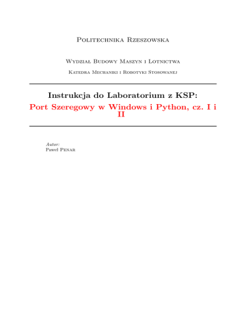 Politechnika Rzeszowska Wydział Budowy Maszyn i Lotnictwa Katedra Mechaniki i Robotyki Stosowanej Instrukcja do Laboratorium z KSP: Port Szeregowy w Windows i Python, cz. I i II Autor: Paweł Penar 1 Cel ćwiczenia Celem ćwiczenia jest: • zapoznanie studentów obsługą portu COM w systemie Windows • zapoznanie studentów z podstawami języka Python • zapoznanie studentów z obsługą portu COM w języku Python. 2 Zapoznanie z emulatorem połączenia typu null-modem Celem tego podpunktu jest zapoznanie się z portem COMx, który reprezentuje RS232 z interfejsem UART (o nim na kolejnych ćwiczeniach). Z pomocą prowadzącego zrealizuj następujące zadania • Sprawdź w Menadżerze urządzeń połączona w parę jaka para portów COMx i COMy jest (wirtualnie) • Sprawdź czy zainstalowano program putty. Jeśli nie, to zainstaluj go pobierając z: http: //www.chiark.greenend.org.uk/~sgtatham/putty/download.html • Z użyciem dwóch instancji programu putty prześlij swoje imię i nazwisko pomiędzy terminalami połączonymi z portami COMxi COMy zidentyfikowanymi w wcześniej. • Odpowiedz na pytanie: Dlaczego na konsoli, w której wprowadzamy tekst nie jest on widoczny ? • Do portu COMx podłącz program monitorujący Com Port Monitor (jeśli potrzeba to pobierz (http://www.awavo.com/serial-port-monitor/) i zainstaluj ) a do portu COMy konsole putty. • Jak należy interpretować liczby które są widoczne w monitorze, gdy na port COMy (podłączony do putty) wysyłane są informacje ? 3 Wstęp do języka Python 3.1 Python - odnośniki do zasobów internetowych Należy zapoznać się z następującymi stronami internetowymi • https://www.python.org/ strona domowa języka Python • http://winpython.github.io/ Paczka pod system Windows zawierający kompilator Pythona, zbiór pakietów (bibliotek) (m.in numpy, scipy, pyserial) w tym bibliotekę QT z programem QtDesigner oraz narzędzia do zarządzania pakietami (bibliotekami) • http://www.learnpython.org/pl/ samouczek Python’a • http://www.python.rk.edu.pl/w/p/podstawy/ Kurs Python’a Uwaga: Stosujemy Python w wersji 2.7 1 3.2 Python - Hello World W tym punkcie należy napisać swój pierwszy skrypt w Pythonie. Jednak nim to zostanie zrobione należy poczytać o wcięciach w Pythonie, np. tu: http://pl.wikibooks.org/wiki/Zanurkuj_ w_Pythonie Następnie, używając dowolnego edytora tekstu, w wybranym przez siebie miejscu (jednak najlepiej tam, gdzie umieszczono program WinPython Command Prompt) utworzyć plik skrypt1.py w którym powinien znaleźć się kod: x=2 i f x==2: p r i n t ”To j e s t dwa” else : p r i n t ”To n i e j e s t dwa” By wykonać skrypt zapisany w pliku skrypt.py należy wykorzystać terminal WinPython Command Prompt i wywołać polecenie python skrypt.py. Uwaga: Jeśli skrypt jest w innym folderze niż WinPython Command Prompt, należy w konsoli zmienić aktualny folder, korzystając z komendy cd, np. cd c: Drugim sposobem na utworzenie pliku skrypt1.py jest użycie narzędzia IDLE, które koloruje składnie i pozwala na łatwe wykonywanie skryptów w nim stworzonych. Po jego uruchomieniu należy wybrać File → New File by stworzyć nowy plik skryptu. Po jego napisaniu i zapisaniu, wybierając z menu edytora tekstu Run → Run Module (skrót: F5), wykonamy program w konsoli. 3.3 Zadania do wykonania Korzystając z zasobów strony http://www.learnpython.org/pl/ napisać: • Pętle for która wypisze liczby od 0 do 10 • Napisać dwie instrukcje warunkowe wykorzystujące trzy dowolne funkcje logiczne • Napisać funkcje, która dla podanych współczynników równania kwadratowego wyznaczy wyróżnik kwadratowy, tj. tzw. Deltę. 4 Pakiet pyserial Pakiet pyserial oferuje API do Python’a które pozwala na łatwy dostęp do portu szeregowego w różnych systemach operacyjnych. Więcej informacji o pakiecie znajduje się na stronie domowej projektu, tj. http://pyserial.sourceforge.net/. Co więcej, pakiet jest domyślnie zainstalowany w pakiecie WinPython. Dodatkowo, pod adresem http://pyserial. sourceforge.net/shortintro.html, znajduje się krótki wstęp do pakietu pokazujący API oraz podstawowe metody klasy Serial, która odpowiada za połączenie z portem COM. Korzystanie z pakietu należy rozpocząć od importu pakietu do pliku skryptu, tj.: import s e r i a l Następnie do zmiennej port, przypiszemy nową instancje klasy Serial, która zostanie podłączona do portu COM1. p o r t=s e r i a l . S e r i a l ( ’COM1’ ) 2 Dokładny opis klasy i dokumentacja konstruktora (wraz z domyślnymi parametrami połączenia z portem COM) znajduje się na stronie http://pyserial.sourceforge.net/pyserial_api. html Poprawność połączenia z portem COM można sprawdzić za pomocą metody isOpen, np.: p r i n t p o r t . isOpen ( ) By wypisać nazwę portu, z którym został połączona instancja klasy Serial, zapisana pod zmienną port, należy wypisać pole name klasy Serial, tj.: p r i n t p o r t . name Jeśli zaś chcemy wysłać ciąg liter na port szeregowy należy skorzystać z metody write p o r t . w r i t e ( ’KSP’ ) Funkcją odwrotną do funkcji wysyłania, jest funkcja czytania, która występuje z różnymi parametrami. Najprostsza jej wersja jest bezparametrowa, a jej użycie jest następujące: x=p o r t . r e a d ( ) W tym wypadku metoda read odczytuje jeden bajt danych, który może zostać wypisany przez print. Należy dodać, że metoda read blokuje program, dlatego często za jej wykonanie odpowiada osobny wątek. Zamknięcie połączenia z portem COM jest realizowane przez metodę close port . c l o s e () Podsumowując, prosty skrypt używający pakietu pyserial prezentuje poniższy listing: import s e r i a l p o r t = s e r i a l . S e r i a l ( ’COM7’ ) i f p o r t . isOpen ( ) : port . write ( ’ hello ’ ) x=p o r t . r e a d ( ) print x port . c l o s e () 4.1 Przydatne uwagi Poniżej znajdują się dwie uwagi dotyczące przesyłania za pomocą pakietu pys