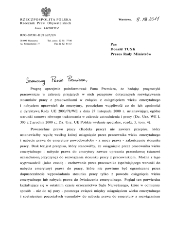 R Z E C Z P O S P O L I T A POLSKA Rzecznik Praw Obywatelskich Irena LIPOWICZ RPO-687391-I1I/11/JP/LN 00-090 Warszawa Al. Solidarności 77 Tel. centr. 22 551 77 00 Fax 22 827 64 53 Pan Donald TUSK Prezes Rady Ministrów Pragnę uprzejmie poinformować Pana Premiera, że badając pragmatyki pracownicze w zakresie przyjętych w nich przepisów dotyczących rozwiązywania stosunków pracy z pracownikami w związku z osiągnięciem wieku emerytalnego i nabyciem uprawnień do emerytury, powzięłam wątpliwość co do ich zgodności z dyrektywą Rady UE 2000/78/WE z dnia 27 listopada 2000 r. ustanawiającą ogólne warunki ramowe równego traktowania w zakresie zatrudnienia i pracy (Dz. Urz. WE L 303 z 2 grudnia 2000 r.; Dz. Urz. UE Polskie wydanie specjalne, rozdz. 5, tom. 4). Powszechne prawo pracy (Kodeks pracy) nie zawiera przepisu, który ustanawiałby regułę według której osiągnięcie przez pracownika wieku emerytalnego i nabycie prawa do emerytury powodowałoby - z mocy prawa - zakończenie stosunku pracy. Brak też jest przepisu, który stanowiłby, że osiągnięcie przez pracownika wieku emerytalnego i nabycie prawa do emerytury zawsze uprawnia pracodawcę (stanowi uzasadnioną przyczynę) do rozwiązania stosunku pracy z pracownikiem. Można z tego wyprowadzić -jako zasadę - zachowanie przez pracownika (spełniającego warunki do nabycia emerytury) prawa do pracy, które nie powinno być ograniczane przez dopuszczalność wypowiadania stosunku pracy tylko z powodu osiągnięcia wieku emerytalnego lub nabycia prawa do świadczenia emerytalnego. Pogląd ten potwierdza kształtujące się w ostatnim czasie orzecznictwo Sądu Najwyższego, które w odmienny sposób - niż do tej pory - postrzega związek między osiągnięciem wieku emerytalnego i spełnieniem pozostałych warunków do nabycia prawa do emerytury a rozwiązaniem 2 stosunku pracy z pracownikiem. W uchwale składu siedmiu sędziów z dnia 19 listopada 2008r., I PZP 4/08 (OSNP 2009/13-14/165) Sąd Najwyższy stwierdził, że „wypowiedzenie umowy o pracę na czas nieokreślony pracownicy wyłącznie z powodu nabycia przez nią prawa do emerytury na podstawie art. 40 w związku z art. 50 ustawy z dnia 17 grudnia 1998 r. o emeryturach i rentach z Funduszu Ubezpieczeń Społecznych (Dz. U. z 2004 r. Nr 39, poz. 353 ze zra.) stanowi dyskryminację ze względu na płeć (art. 11 Kp)". W podjętej na wniosek Rzecznika uchwale składu siedmiu sędziów z dnia 21 stycznia 2009 r., II PZP 13/08, Sąd Najwyższy przyjął, że „osiągnięcie wieku emerytalnego i nabycie prawa do emerytury nie może stanowić wyłącznej przyczyny wypowiedzenia umowy o pracę przez pracodawcę (art. 45 § 1 Kp)". W ocenie Sądu Najwyższego, „wypowiedzenie umowy o pracę pracownikowi, który nabył prawo do świadczeń emerytalnych, tylko z powodu osiągnięcia wieku emerytalnego i nabycia tego prawa, nie stanowi uzasadnionej przyczyny wypowiedzenia, gdyż nie pozostaje w żadnym związku z wykonywaną przez niego pracą, ani z sytuacją ekonomiczną pracodawcy, ani z żadnym innym zdarzeniem lub zdarzeniami, które wskazywałyby na nieprzydatność pracownika lub istnienie interesu pracodawcy w rozwiązaniu stosunku pracy... Osiągnięcie wieku emerytalnego i nabycie prawa do emerytury nie uzasadnia wypowiedzenia stosunku pracy, ponieważ zdarzenia te nie wiążą się bezpośrednio z pracą - w szczególności ani nie przesądzają o nieprzydatności pracownika do wykonywania dotychczasowych obowiązków pracowniczych, ani nie dowodzą istnienia, związanego z racjonalizacją zatrudnienia interesu pracodawcy w rozwiązaniu stosunku pracy. Uzasadnienie wypowiedzenia stosunku pracy pracownikowi w wieku emerytalnym, posiadającemu prawo obiektywnych, indywidualnie skonkretyzowanych, przyczyn pracownika lub pracodawcy do związanych emerytury, z musi wykonywaniem się odwoływać leżących po pracy, do stronie takich jak np. niewłaściwe wykonywanie obowiązków pracowniczych, obniżenie wydajności, długotrwałe nieobecności w pracy spowodowane chorobami, brak zdolności dostosowania się pracownika do procesów modernizacyjnych, ograniczenie zakresu działalności zakładu pracy, zmiana profilu działalności produkcyjnej lub usługowej wymuszająca zatrudnienie pracowników o innych kwalifikacjach, itp. Wprawdzie pragmatyki pracownicze nie dotyczą ogółu pracowników i rządzą się swoimi prawami, niemniej zachodzi każdorazowo potrzeba rozważenia, czy określona grupa zawodowa, której dotyczy dana pragmatyka, powinna mieć wyznaczoną górną 3 granicę wieku (wówczas jednak jednakową dla mężczyzn i kobiet), przekroczenie której może stanowić zagrożenie dla właściwego wykonywania obowiązków służbowych, czy też należałoby w ogóle zrezygnować z zapisu zezwalającego pracodawcy (nie mówiąc już o formie nakazowej) na rozwiązanie stosunku pracy z pracownikiem, który nabył prawo do emerytury. Przywołana na wstępie dyrektywa 2000/78 zakazuje w art. 1 dyskryminacji, między innymi, ze względu na wiek. W art. 6 ust. 1 dyrektywy dopuszczona została jednak możliwość uznania przez państwa członkowskie, że odmienne traktowanie ze względu na wiek nie stanowi dyskryminacji, jeżeli w ramach prawa krajowego zostanie to obiektywnie i racjonalnie uzasadnione celem zgodnym z przepisami, w szczególności celami polityki zatrudnienia, rynku pracy i kształcenia zawodowego, i jeżeli środki mające służyć realizacji tego celu są właściwe i konieczne. Takie odmienne traktowanie może polegać, między innymi, na wprowadzeniu specjalnych warunków dostępu do zatrudnienia i kształcenia zawodowego, zatrudnienia i pracy, włącznie z warunkami zwalniania i wynagradzania, dla ludzi młodych, pracowników starszych i osób mających na utrzymaniu inne osoby, w celu wspierania ich integracji zawodowej lub zapewnienia im ochrony. Wykładając ten przepis, Europejski Trybunał Sprawiedliwości w wyroku z 16 paźdz