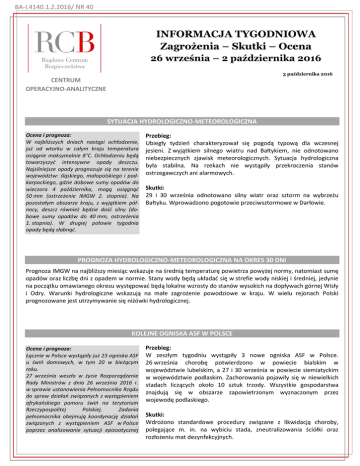 BA-I.4140.1.2.2016/ NR 40 INFORMACJA TYGODNIOWA Zagrożenia – Skutki – Ocena Y się Ło podpisanie 26 września – 2 października 2016 3 października 2016 CENTRUM OPERACYJNO-ANALITYCZNE SYTUACJA HYDROLOGICZNO-METEOROLOGICZNA Ocena i prognoza: W najbliższych dniach nastąpi ochłodzenie, już od wtorku w całym kraju temperatura osiągnie maksymalnie 8°C. Ochłodzeniu będą towarzyszyć intensywne opady deszczu. Najsilniejsze opady prognozuje się na terenie województw: śląskiego, małopolskiego i podkarpackiego, gdzie dobowe sumy opadów do wieczora 4 października, mogą osiągnąć 50 mm (ostrzeżenie IMGW 2. stopnia). Na pozostałym obszarze kraju, z wyjątkiem północy, deszcz również będzie dość silny (dobowe sumy opadów do 40 mm, ostrzeżenia 1. stopnia). W drugiej połowie tygodnia opady będą słabnąć. Przebieg: Ubiegły tydzień charakteryzował się pogodą typową dla wczesnej jesieni. Z wyjątkiem silnego wiatru nad Bałtykiem, nie odnotowano niebezpiecznych zjawisk meteorologicznych. Sytuacja hydrologiczna była stabilna. Na rzekach nie wystąpiły przekroczenia stanów ostrzegawczych ani alarmowych. Skutki: 29 i 30 września odnotowano silny wiatr oraz sztorm na wybrzeżu Bałtyku. Wprowadzono pogotowie przeciwsztormowe w Darłowie. PROGNOZA HYDROLOGICZNO-METEOROLOGICZNA NA OKRES 30 DNI Prognoza IMGW na najbliższy miesiąc wskazuje na średnią temperaturę powietrza powyżej normy, natomiast sumę opadów oraz liczbę dni z opadem w normie. Stany wody będą układać się w strefie wody niskiej i średniej, jedynie na początku omawianego okresu występować będą lokalne wzrosty do stanów wysokich na dopływach górnej Wisły i Odry. Warunki hydrologiczne wskazują na małe zagrożenie powodziowe w kraju. W wielu rejonach Polski prognozowane jest utrzymywanie się niżówki hydrologicznej. KOLEJNE OGNISKA ASF W POLSCE Ocena i prognoza: Łącznie w Polsce wystąpiły już 23 ogniska ASF u świń domowych, w tym 20 w bieżącym roku. 27 września weszło w życie Rozporządzenie Rady Ministrów z dnia 26 września 2016 r. w sprawie ustanowienia Pełnomocnika Rządu do spraw działań związanych z wystąpieniem afrykańskiego pomoru świń na terytorium Rzeczypospolitej Polskiej. Zadania pełnomocnika obejmują koordynację działań związanych z wystąpieniem ASF w Polsce poprzez analizowanie sytuacji epizootycznej i jej wpływu na gospodarkę. Pełnomocnik ma także inicjować działania, w tym natury legislacyjnej, zmierzające do zwalczania choroby. Funkcję pełnomocnika rządu pełni sekretarz stanu w Ministerstwie Rolnictwa i Przebieg: W zeszłym tygodniu wystąpiły 3 nowe ogniska ASF w Polsce. 26 września chorobę potwierdzono w powiecie bialskim w województwie lubelskim, a 27 i 30 września w powiecie siemiatyckim w województwie podlaskim. Zachorowania pojawiły się w niewielkich stadach liczących około 10 sztuk trzody. Wszystkie gospodarstwa znajdują się w obszarze zapowietrzonym wyznaczonym przez wojewodę podlaskiego. Skutki: Wdrożono standardowe procedury związane z likwidacją choroby, polegające m. in. na wybiciu stada, zneutralizowania ściółki oraz rozłożeniu mat dezynfekcyjnych. INFORMACJA TYGODNIOWA 26.09 – 2.10.2016 Ocena i prognoza cd.: i jej wpływu na gospodarkę. Pełnomocnik ma także inicjować działania, w tym natury legislacyjnej, zmierzające do zwalczania choroby. Funkcję pełnomocnika rządu pełni sekretarz stanu w Ministerstwie Rolnictwa i Rozwoju Wsi. PROTESTY PRZECIWKO ZAOSTRZENIU USTAWY ANTYABORCYJNEJ Ocena i prognoza: 23 września Sejm odrzucił w pierwszym czytaniu obywatelski projekt ustawy o prawach kobiet i świadomym rodzicielstwie, który zawierał liberalizację przepisów aborcyjnych. Do dalszych prac w Komisji Sprawiedliwości i Praw Człowieka skierowano natomiast obywatelski projekt zmiany ustawy o planowaniu rodziny, ochronie płodu ludzkiego i warunkach dopuszczalności przerywania ciąży oraz o zmianie Kodeksu karnego, który przewiduje całkowity zakaz aborcji. 3 października na terenie całego kraju planowane są zgromadzenia publiczne w ramach tzw. „Czarnego Protestu” przeciwko planowanym zaostrzeniom przepisów aborcyjnych. Według szacunków policji liczba uczestników sięgać będzie 29 tys. osób. Przebieg: 1 października (sobota) w Warszawie przed gmachem Sejmu odbyła się demonstracja przeciwko zaostrzeniu ustawy antyaborcyjnej. W zgromadzeniu udział wzięło około 5 tys. osób. W Łodzi demonstracja licząca około 4 tys. osób została zorganizowana w niedzielę 2 października. Skutki: Nie odnotowano zakłóceń porządku publicznego. OSUNIĘCIE ZIEMI W KOPALNI WĘGLA BRUNATNEGO TURÓW Ocena i prognoza: Kopalnia Węgla Brunatnego Turów rocznie wydobywa 12 mln ton węgla, a powierzchnia odkrywki wynosi prawie 2 500 ha. Sąsiadująca z kopalnią Elektrownia Turów dysponuje 6 blokami o łącznej mocy prawie 1 500 MW zasilanymi węglem z kopalni. Spadek mocy Elektrowni Turów do 500 MW nie spowoduje negatywnych skutków dla pracy Krajowego Systemu Elektroenergetycznego. W razie potrzeb moc elektrowni może zostać czasowo zwiększona. Straty finansowe dla kopalni mogą być poważne, jednak precyzyjne dane będą mogły zostać uzyskane po całkowitym opanowaniu sytuacji geologicznej (zatrzymaniu przesuwania się czoła osuwiska), co powinno nastąpić w najbliższych dniach. Przebieg: 27 września rano nastąpiło osunięcie części zwałowiska wewnętrznego w odkrywkowej Kopalni Węgla Brunatnego Turów. Osuwisko uszkodziło infrastrukturę kopalni, w tym ciągi zwałowe oraz stacje napędowe. Skutki: Nie było ofiar w ludziach. Przesuwające się masy ziemi uszkodziły sprzęt wydobywczy i spowodowały ograniczenie wydobycia węgla. Ze względu na priorytetowe dostawy do sąsiadującej z kopalnią Elektrowni Turów, 28 września wstrzymano dostawy węgla dla innych odbiorców. Rezerwy z tzw. zasobnika oraz bieżące dostawy z kopalni pozwalają na prac