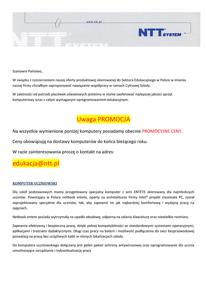 Szanowni Państwo, W związku z rozszerzeniem naszej oferty produktowej skierowanej do Sektora Edukacyjnego w Polsce w imieniu naszej firmy chciałbym zaproponować nawiązanie współpracy w ramach Cyfrowej Szkoły. W zależności od potrzeb placówek oświatowych jesteśmy w stanie zaoferować najlepszej jakości sprzęt komputerowy wraz z całym wymaganym oprogramowaniem edukacyjnym. Uwaga PROMOCJA Na wszystkie wymienione poniżej komputery posiadamy obecnie PROMOCYJNE CENY. Ceny obowiązują na dostawy komputerów do końca bieżącego roku. W razie zainteresowania proszę o kontakt na adres: [email protected] KOMPUTER UCZNIOWSKI Dla szkół podstawowych mamy przygotowany specjalny komputer z serii ENTETE skierowany dla najmłodszych uczniów. Powstający w Polsce netbook entete, oparty na architekturze Firmy Intel® projekt classmate PC, został zaprojektowany specjalnie dla uczniów, tak, aby zapewnić im jak najbardziej komfortową i wydajną pracę na zajęciach. Netbook entete posiada wytrzymałą na upadki obudowę, odporną na zalanie klawiaturę oraz niewielkie rozmiary. Zapewnia efektywną i bezpieczną pracę, dzięki pełnej kompatybilności ze standardowymi systemami operacyjnymi, aplikacjami i treściami dydaktycznymi. Długi czas pracy na baterii i możliwość podłączenia do sieci bezprzewodowej pozwalają na pracę bez uciążliwych kabli w różnych lokalizacjach szkoły. Do komputera uczniowskiego dołączany jest pełen pakiet ochrony antywirusowej oraz oprogramowanie dla ucznia umożliwiające zarządzanie i indywidualizację pracy a) Netbook 10.1” Procesor: Intel® Atom N2600 1.6GHz Chipset: Intel® NM10 Express System operacyjny: oryginalny Windows® 7 starter; Karta bezprzewodowa: Intel® Wi-Fi 802.11 b/g/n; Wyświetlacz: 10.1" LCD HD (1366 x 768); Pamięć operacyjna: 2GB DDR3; Dysk twardy: 250GB; Złącza: 3 x USB, 1x VGA, 1 x Czytnik kart SD/MMC, 1xLAN, 2 x Złącze słuchawkowe, 1x Złącze mikrofonowe Karta graficzna: zintegrowana; Karta dźwiękowa: wbudowana z głośnikami i mikrofonem.; Bateria: 6 komorowa (5200 mAh); Wymiary, waga: 269 mm x 210,4 x 25,82/34,24; 1,5kg Gwarancja 24 miesiące, gwarancja na panel LCD – 12 miesięcy, gwarancja na baterię: 6 miesięcy Netbook 10.1” TABLET Procesor: Intel® Atom N2600 1.6GHz Chipset: Intel® NM10 Express Chipset; System operacyjny: oryginalny Windows® 7 starter; Karta bezprzewodowa: Intel® Wi-Fi 802.11 b/g/n; Wyświetlacz dotykowy: 10.1" LCD HD (1366 x 768) Pojemnościowy, dotykowe piórko; Pamięć operacyjna: 2GB DDR3; Dysk twardy: 250GB; Złącza: 2 x USB, 1 x HDMI, 1x VGA, 1 x Czytnik kart SD/MMC, 1xLAN, 2 x Złącze słuchawkowe, 1x Złącze mikrofonowe Kamera: wbudowana obracana kamera 1,3MPix Karta graficzna: zintegrowana; Karta dźwiękowa: wbudowana z głośnikami i mikrofonem.; Bateria: 6 komorowa (5200mAh cell); Wymiary, waga: 269 x 208,5 x 36,1 [mm]; 1.6kg Gwarancja: 24 miesiące, gwarancja na panel LCD – 12 miesięcy, gwarancja na baterię: 6 miesięcy PRACOWNIA STACJONARNA Z myślą o bardziej wymagających szkołach przygotowaliśmy także wysokowydajne pracownie na nowoczesnych komputerach typu All In One, które zapewnią wydajną i szybką pracę. a) Komputer Nauczycielski AIO 21,5” Procesor: PENTIUM 2.60GHz "G620" SOC. LGA. 1155 [3M CACHE] BOX Płyta główna: Gigabyte GA-H61M-DS2 Porty: 6 x USB 2.0, 1 x wejście mikrofonowe, 1 x wyjście słuchawkowe Pamięć operacyjna: 2 x DIMM 2GB DDR3 1333Mhz, z możliwością rozbudowy do 8GB Dysk twardy: HDD 500GB 7200RPM SATA Karta graficzna: Zintegrowana Napęd optyczny: NAGRYWARKA DVD -/+ R/RW SLIM DL z oprogramowaniem Karta sieciowa: zintegrowana z płytą główną 10/100/1000 RJ-45 Karta dźwiękowa: zintegrowana z płytą główną zgodna z HD 2 wewnętrzne głośniki w obudowie Klawiatura USB Mysz optyczna z rolką, 3 klawisze z rolką, USB Obudowa: typu AIO, wyświetlacz 21,5” LCD w technologii LED, 16: 9, matowa, Full HD, kamera 1,3 Mpx, wbudowany czytnik kart pamięci Zasilacz: 300W, 80plus Bronze, umożliwiający spełnienie wymogów normy ES 5.0 System operacyjny: MS Windows 7 Home Premium PL OEM 64bit (licencja + nośnik) TABLICE MULTIMEDIALNE 1) Tablica interaktywna rezystywno-dotykowa IQ Board PS v 7.0 80" Parametry: Przekątna tablicy (obszar roboczy) Obszar roboczy Wymiary zewnętrzne Format tablicy Technologia Sposób obsługi Sposób podłączenia Waga tablicy Powierzchnia Rozdzielczość Prędkość śledzenia Dołączone akcesoria Inne funkcje Wsparcie systemów operacyjnych ~80” 1610 x 1191 mm (przekątna 2000 mm) 1689 x 1279 mm 4:3 Rezystywna (dotykowa) Bez konieczności dedykowanego narzędzia (technologia dotykowa umożliwia obsługę w sposób dowolny: palcem, wskaźnikiem, piórem, rysikiem itp.) USB 20,65 kg Matowa, odporna na uszkodzenia, umożliwiająca wykorzystywanie jak zwykłą tablicę sucho-ścieralną 9600 x 9600 8 m / sek. (prędkość przesyłu dla pisania/klikania 480 pkt./sek.) Dwa piórka (bez elementów elektronicznych), 10 m kabel USB, zestaw do powieszenia na ścianie, płyta ze sterownikami, oprogramowanie, instrukcja. Wybór kolorów za pomocą przycisków skrótowych. Przyciski funkcyjne: 14 przycisków z lewej strony i 14 z prawej. Możliwość wykorzystania podstawy jezdnej tego samego producenta Windows XP/2003/Vista/7; Linux; Mac 10.X