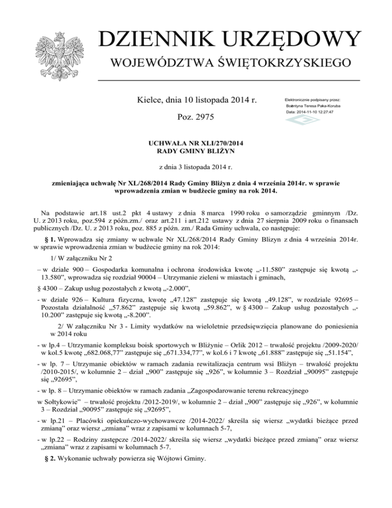 DZIENNIK URZĘDOWY WOJEWÓDZTWA ŚWIĘTOKRZYSKIEGO Kielce, dnia 10 listopada 2014 r. Elektronicznie podpisany przez: Bożentyna Teresa Pałka-Koruba Poz. 2975 Data: 2014-11-10 12:27:47 UCHWAŁA NR XLI/270/2014 RADY GMINY BLIŻYN z dnia 3 listopada 2014 r. zmieniająca uchwałę Nr XL/268/2014 Rady Gminy Bliżyn z dnia 4 września 2014r. w sprawie wprowadzenia zmian w budżecie gminy na rok 2014. Na podstawie art.18 ust.2 pkt 4 ustawy z dnia 8 marca 1990 roku o samorządzie gminnym /Dz. U. z 2013 roku, poz.594 z późn.zm./ oraz art.211 i art.212 ustawy z dnia 27 sierpnia 2009 roku o finansach publicznych /Dz. U. z 2013 roku, poz. 885 z późn. zm./ Rada Gminy uchwala, co następuje: § 1. Wprowadza się zmiany w uchwale Nr XL/268/2014 Rady Gminy Blizyn z dnia 4 września 2014r. w sprawie wprowadzenia zmian w budżecie gminy na rok 2014: 1/ W załączniku Nr 2 – w dziale 900 – Gospodarka komunalna i ochrona środowiska kwotę „-11.580” zastępuje się kwotą „13.580”, wprowadza się rozdział 90004 – Utrzymanie zieleni w miastach i gminach, § 4300 – Zakup usług pozostałych z kwotą „-2.000”, - w dziale 926 – Kultura fizyczna, kwotę „47.128” zastępuje się kwotą „49.128”, w rozdziale 92695 – Pozostała działalność „57.862” zastępuje się kwotą „59.862”, w § 4300 – Zakup usług pozostałych „10.200” zastępuje się kwotą „-8.200”. 2/ W załączniku Nr 3 - Limity wydatków na wieloletnie przedsięwzięcia planowane do poniesienia w 2014 roku - w lp.4 – Utrzymanie kompleksu boisk sportowych w Bliżynie – Orlik 2012 – trwałość projektu /2009-2020/ w kol.5 kwotę „682.068,77” zastępuje się „671.334,77”, w kol.6 i 7 kwotę „61.888” zastępuje się „51.154”, - w lp. 7 – Utrzymanie obiektów w ramach zadania rewitalizacja centrum wsi Bliżyn – trwałość projektu /2010-2015/, w kolumnie 2 – dział „900” zastępuje się „926”, w kolumnie 3 – Rozdział „90095” zastępuje się „92695”, - w lp. 8 – Utrzymanie obiektów w ramach zadania „Zagospodarowanie terenu rekreacyjnego w Sołtykowie” – trwałość projektu /2012-2019/, w kolumnie 2 – dział „900” zastępuje się „926”, w kolumnie 3 – Rozdział „90095” zastępuje się „92695”, - w lp.21 – Placówki opiekuńczo-wychowawcze /2014-2022/ skreśla się wiersz „wydatki bieżące przed zmianą” oraz wiersz „zmiana” wraz z zapisami w kolumnach 5-7, - w lp.22 – Rodziny zastępcze /2014-2022/ skreśla się wiersz „wydatki bieżące przed zmianą” oraz wiersz „zmiana” wraz z zapisami w kolumnach 5-7. § 2. Wykonanie uchwały powierza się Wójtowi Gminy. Dziennik Urzędowy Województwa Świętokrzyskiego –2– Poz. 2975 § 3. Uchwała wchodzi w życie z dniem podjęcia i podlega ogłoszeniu w Dzienniku Urzędowym Województwa Świętokrzyskiego. Przewodniczący Rady Jerzy Rams