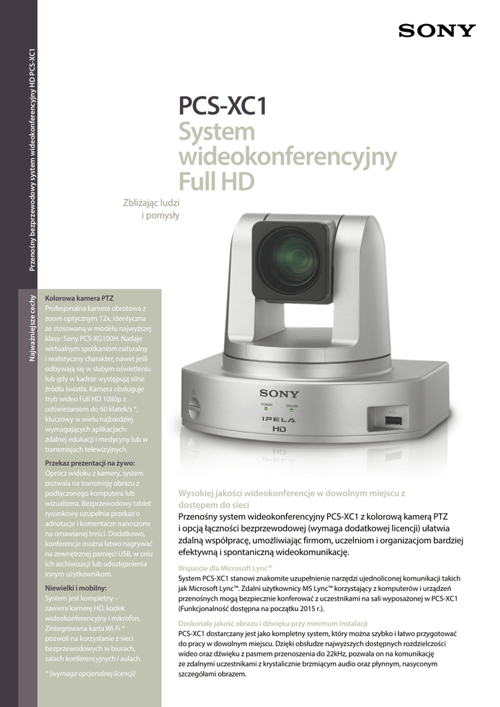 Przenośny bezprzewodowy system wideokonferencyjny HD PCS-XC1 Najważniejsze cechy PCS-XC1 System wideokonferencyjny Full HD Zbliżając ludzi i pomysły Kolorowa kamera PTZ Profesjonalna kamera obrotowa z zoom optycznym 12x, identyczna ze stosowaną w modelu najwyższej klasy: Sony PCS-XG100H. Nadaje wirtualnym spotkaniom naturalny i realistyczny charakter, nawet jeśli odbywają się w słabym oświetleniu lub gdy w kadrze występują silne źródła światła. Kamera obsługuje tryb wideo Full HD 1080p z odświeżaniem do 60 klatek/s *, kluczowy w wielu najbardziej wymagających aplikacjach: zdalnej edukacji i medycyny lub w transmisjach telewizyjnych. Przekaz prezentacji na żywo: Oprócz widoku z kamery, system pozwala na transmisję obrazu z podłączonego komputera lub wizualizera. Bezprzewodowy tablet rysunkowy uzupełnia przekaz o adnotacje i komentarze nanoszone na omawianej treści. Dodatkowo, konferencje można łatwo nagrywać na zewnętrznej pamięci USB, w celu ich archiwizacji lub udostępnienia innym użytkownikom. Niewielki i mobilny: System jest kompletny – zawiera kamerę HD, kodek wideokonferencyjny i mikrofon. Zintegrowana karta Wi-Fi * pozwoli na korzystanie z sieci bezprzewodowych w biurach, salach konferencyjnych i aulach. * (wymaga opcjonalnej licencji) Wysokiej jakości wideokonferencje w dowolnym miejscu z dostępem do sieci Przenośny system wideokonferencyjny PCS-XC1 z kolorową kamerą PTZ i opcją łączności bezprzewodowej (wymaga dodatkowej licencji) ułatwia zdalną współpracę, umożliwiając firmom, uczelniom i organizacjom bardziej efektywną i spontaniczną wideokomunikację. Wsparcie dla Microsoft Lync™ System PCS-XC1 stanowi znakomite uzupełnienie narzędzi ujednoliconej komunikacji takich jak Microsoft Lync™. Zdalni użytkownicy MS Lync™ korzystający z komputerów i urządzeń przenośnych mogą bezpiecznie konferować z uczestnikami na sali wyposażonej w PCS-XC1 (Funkcjonalność dostępna na początku 2015 r.). Doskonała jakość obrazu i dźwięku przy minimum instalacji PCS-XC1 dostarczany jest jako kompletny system, który można szybko i łatwo przygotować do pracy w dowolnym miejscu. Dzięki obsłudze najwyższych dostępnych rozdzielczości wideo oraz dźwięku z pasmem przenoszenia do 22kHz, pozwala on na komunikację ze zdalnymi uczestnikami z krystalicznie brzmiącym audio oraz płynnym, nasyconym szczegółami obrazem. Przenośny bezprzewodowy system wideokonferencyjny HD PCS-XC1 Funkcje Pakiety PrimeSupport Lekki, kompaktowy i w pełni mobilny Wyraźny i czysty dźwięk Wideokonferencje można organizować nawet w niewielkich pomieszczeniach, gdzie każdy skrawek przestrzeni jest cenny. Zintegrowana konstrukcja umożliwia szybkie przenoszenie i podłączanie urządzenia w nowym miejscu bez posiadania specjalistycznej wiedzy. Zestaw PCS-XC1 dostarczany jest z mikrofonem PCS-A1, stosowanym we wszystkich wideoterminalach grupowych firmy Sony. Mikrofon pozwala na zebranie dźwięku w małych i średnich pomieszczeniach konferencyjnych. Układ kasacji echa i redukcji szumów wbudowane w wideoterminal zapewniają czysty i wyraźny dźwięk od każdego z uczestników, w całym obsługiwanym paśmie przenoszenia. Obraz HD w wysokiej jakości, nawet przy słabym oświetleniu Zastosowany w kamerze przetwornik obrazu CMOS Exmor rejestruje szczegółowy i płynny obraz rozdzielczości HD720p nawet w słabo oświetlonych pomieszczeniach. Opcjonalne rozszerzenie do obsługi rozdzielczości Full HD 1080p zapewni jakość obrazu niezbędną w najbardziej wymagających zastosowaniach, przy zachowaniu wysokiej szybkości odświeżania do 60 klatek/s. Kamera PTZ z szerokim polem widzenia Kamerą główną, wyposażoną w funkcje obracania, przechylania i przybliżania, można sterować zdalnie za pomocą radiowego pilota, bez konieczności celowania w stronę wideoterminala. Duży kąt widzenia oraz zoom optyczny i cyfrowy dają pewność, że każdy uczestnik konferencji będzie dobrze widoczny. Wyraźny obraz w każdych warunkach oświetlenia Kamera główna systemu PCS-XC1 wyposażona jest w unikalne funkcje automatycznej redukcji szumów, wzmocnienia oraz kontrastowania obrazu osobno dla każdego piksela. Opracowana przez Sony zaawansowana technologia View-DR poszerza zakres dynamiki obrazu, właściwie oddając skrajne różnice kontrastu występujące w kadrze, na przykład gdy prezenter występuje na tle okna. Wydajne kodowanie i inteligentny mechanizm QoS System PCS-XC1 obsługuje protokół kodowania obrazu H.264 High Profile, wymagający dla przekazu tej samej jakości aż o połowę mniejszego pasma niż standardowy H.264. Inteligentne funkcje QoS (Quality of Service) pozwalają na automatyczną adaptację do zmiennych warunków sieciowych przy zachowaniu maksymalnej dostępnej jakości przekazu. Skutecznie ograniczają liczbę pominiętych klatek i blokowanie się obrazu nawet wtedy, gdy prędkość transmisji w sieci odczuwalnie spada. Łatwe włączanie do sieci bezprzewodowych Wbudowana obsługa Wi-Fi * umożliwia podłączenie do każdej lokalnej sieci bezprzewodowej (WLAN) — w pomieszczeniach konferencyjnych, aulach wykładowych, salach operacyjnych i dowolnych innych pomieszczeniach pozostających w zasięgu sieci. Równoczesne udostępnianie danych SSystem umożliwia wzbogacanie wideokonferencji o obraz na żywo z podłączonego komputera lub innego źródła wideo, przekazywany w wysokiej rozdzielczości. Dane oraz wideo z kamery wyświetlane są na telewizorze jednocześnie, według wybranej przez użytkowników aranżacji podziału ekranu. Nagrywanie wideokonferencji na pamięci USB Rejestracja spotkań nie wymaga żadnego Program PrimeSupport zapewnia spokój System PCS-XC1 jest standardowo objęty 3-letnim programem PrimeSupport, który gwarantuje, że twoje rozwiązanie będzie zawsze sprawne. Obejmuje on naprawę lub wymianę urządzenia w razie awarii oraz bezpłatną telefoniczną pomoc techniczną w wielu 