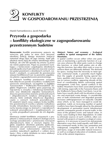 2 7 KONFLIKTY W GOSPODAROWANIU PRZESTRZENIĄ Marek Furmankiewicz, Jacek Potocki Przyroda a gospodarka – konflikty ekologiczne w zagospodarowaniu przestrzennym Sudetów Streszczenie: Konflikt przestrzenny pojawia się wówczas, gdy jedna ze stron chce utrzymać określoną funkcję danego terytorium (miejsca) natomiast druga dąży do jego zmiany, bądź gdy obydwie strony dążą do zmiany określonego stanu (funkcji), ale cele lub sposoby tej zmiany są przez nie różnie pojmowane. Popyt na przestrzeń wynikający z konieczności zaspokajania określonych potrzeb społecznych jest obecnie znacznie wyższy niż podaż przestrzeni o określonych cechach, walorach i zasobach, co prowadzi do powstawania sytuacji konfliktowych już na poziomie uzgadniania planów zagospodarowania przestrzennego. W Sudetach konflikty przestrzenne związane były dotychczas przede wszystkim z wydobyciem surowców mineralnych, szczególnie w Zagłębiu Turoszowskim i Wałbrzysko-Noworudzkim Zagłębiu Węglowym. Lokalnie spory pojawiają się najczęściej w związku z lokalizacją kamieniołomów oraz składowisk odpadów komunalnych. Znaczna powierzchnia terenów przekształconych i zdegradowanych zwiększa antropopresję na obszary, które uniknęły dotychczas degradacji, często o cennych walorach przyrodniczych. W ostatnich latach coraz większa liczba konfliktów przestrzennych wynika z planów rozbudowy trwałej infrastruktury turystycznej i zwiększania ruchu turystycznego na terenach o największych walorach przyrodniczych i krajobrazowych, co w wielu przypadkach prowadzi do ich degradacji. Eliminacja źródeł konfliktów związanych z projektami o niekorzystnych skutkach ekologicznych wymaga poszukiwania i promowania rozwiązań alternatywnych, które w równym stopniu mogłyby zaspokoić określone potrzeby społeczne. Konieczne jest promowanie i powszechne stosowanie zasad wykorzystania odnawialnych zasobów naturalnych zgodnych z cyklem życia fauny i flory a także działania na rzecz edukacji ekologicznej mieszkańców. Abstract: Nature and economy – Ecological conflicts in spatial management of the Sudety Mountains. A spatial conflict occurs either when one party aims at maintaining a particular function of a given area whereas the other party wants to change this function, or when both parties aim at altering this function, but either their ends or ways to achieve them are differently defined. The demand for space, issuing from the necessity to meet specific communal needs, is presently much higher than the supply of grounds having special features, qualities and resources. This, in turn, gives rise to various conflicts, appearing already on the level of coordinating details concerning spatial management. Until now, spatial conflicts in the Sudety Mountains have been associated primarily with mining, especially in the Turoszów Basin and the Wałbrzych-Nowa Ruda Coal Basin. Local debates have usually dealt with localization of quarries and municipal waste dumps. A considerable area of both transformed and degraded grounds increases anthropopressure on naturally valuable areas which, so far, have managed to avoid degradation. Lately an increasing number of spatial conflicts have been brought about by the planned development of permanent tourist infrastructure and the consequent growth of tourist traffic in the areas of the greatest scenic and natural value, in many cases leading to their degradation. In order to eliminate sources of such conflicts, often connected with projects of negative ecological consequences, it is necessary to search for and promote alternative ways that could equally well fulfil certain communal needs. In this case, promotion and widespread, compatible with life cycle of flora and fauna, usage of renewable natural resources, as well as ecological education of residents, seem to be of the utmost importance. 8 MAREK FURMANKIEWICZ, JACEK POTOCKI Słowa kluczowe: Sudety, konflikty ekologiczne, planowanie przestrzenne Key words: the Sudety Mountains, ecological conflicts, spatial planning dr Marek Furmankiewicz, Katedra Planowania i Urządzania Terenów Wiejskich, Akademia Rolnicza we Wrocławiu, ul. Grunwaldzka 53, 50-357 Wrocław, e-mail: [email protected] dr Jacek Potocki, Akademia Ekonomiczna we Wrocławiu, Katedra Gospodarki Przestrzennej, ul. Nowowiejska 3, 58-500 Jelenia Góra, e-mail: [email protected] 1. Wstęp Sudety należą do gór silnie przekształconych przez człowieka. Bogate zasoby naturalne (zarówno odnawialne jak i nieodnawialne) sprzyjały działalności gospodarczej i ich wczesnemu zaludnieniu od okresu średniowiecza. Pomimo znaczących zmian antropogenicznych do dziś zachowały one jednak wiele niezaprzeczalnie cennych przyrodniczo terenów, których zachowanie powinno być jednym z celów gospodarki przestrzennej na tym obszarze. Traktowanie środowiska jako dobra do prowadzenia działalności gospodarczej musi współcześnie uwzględniać fakt, iż nie jest już ono dobrem powszechnym. Posiada ono ograniczoną pojemność i ściśle określone, a zarazem ograniczone możliwości wykorzystania. Z tego powodu jego użytkowanie musi odbywać się z narzuceniem ostrych reguł samoograniczenia (PARYSEK 1996, DOMAŃSKI 2002). Podstawowym celem gospodarki przestrzennej jest zarówno zaspokajanie potrzeb osób zamieszkujących dany system terytorialny jak i potrzeb mieszkańców innych systemów. Należą do nich potrzeby biofizyczne, psychospołeczne i techniczno-produkcyjne (PARYSEK 1996). W określonych środowiskach lokalnych lub niepowiązanych terytorialnie grupach społecznych poszczególne typy potrzeb mogą być bardziej reprezentowane, co w planowaniu przestrzennym prowadzić może do różnego typu konfliktów. Celem niniejszej pracy jest wskazanie najważniejszych istniejących i potencjalnych konfliktów pomiędzy koniecznością ochrony przyrody i potrzebami gospodarczego wykorzystania terenu w polskiej części Sudetów. Przedmiotem z