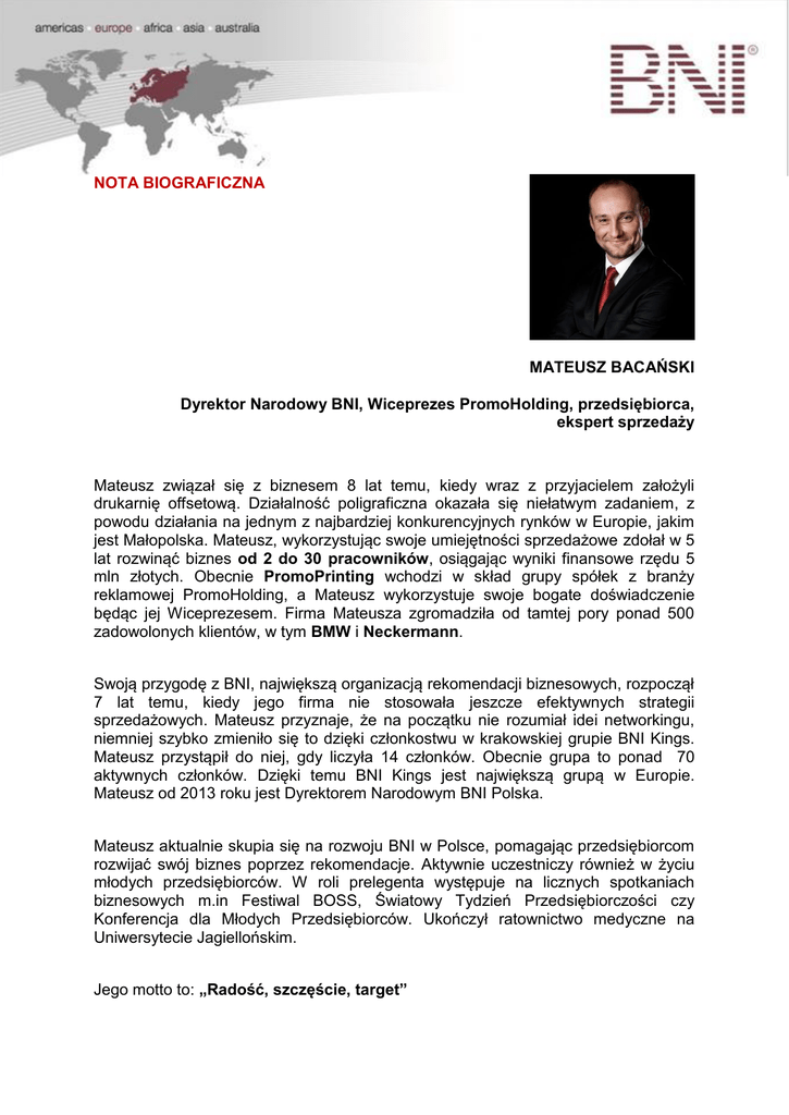 NOTA BIOGRAFICZNA MATEUSZ BACAŃSKI Dyrektor Narodowy BNI, Wiceprezes PromoHolding, przedsiębiorca, ekspert sprzedaży Mateusz związał się z biznesem 8 lat temu, kiedy wraz z przyjacielem założyli drukarnię offsetową. Działalność poligraficzna okazała się niełatwym zadaniem, z powodu działania na jednym z najbardziej konkurencyjnych rynków w Europie, jakim jest Małopolska. Mateusz, wykorzystując swoje umiejętności sprzedażowe zdołał w 5 lat rozwinąć biznes od 2 do 30 pracowników, osiągając wyniki finansowe rzędu 5 mln złotych. Obecnie PromoPrinting wchodzi w skład grupy spółek z branży reklamowej PromoHolding, a Mateusz wykorzystuje swoje bogate doświadczenie będąc jej Wiceprezesem. Firma Mateusza zgromadziła od tamtej pory ponad 500 zadowolonych klientów, w tym BMW i Neckermann. Swoją przygodę z BNI, największą organizacją rekomendacji biznesowych, rozpoczął 7 lat temu, kiedy jego firma nie stosowała jeszcze efektywnych strategii sprzedażowych. Mateusz przyznaje, że na początku nie rozumiał idei networkingu, niemniej szybko zmieniło się to dzięki członkostwu w krakowskiej grupie BNI Kings. Mateusz przystąpił do niej, gdy liczyła 14 członków. Obecnie grupa to ponad 70 aktywnych członków. Dzięki temu BNI Kings jest największą grupą w Europie. Mateusz od 2013 roku jest Dyrektorem Narodowym BNI Polska. Mateusz aktualnie skupia się na rozwoju BNI w Polsce, pomagając przedsiębiorcom rozwijać swój biznes poprzez rekomendacje. Aktywnie uczestniczy również w życiu młodych przedsiębiorców. W roli prelegenta występuje na licznych spotkaniach biznesowych m.in Festiwal BOSS, Światowy Tydzień Przedsiębiorczości czy Konferencja dla Młodych Przedsiębiorców. Ukończył ratownictwo medyczne na Uniwersytecie Jagiellońskim. Jego motto to: „Radość, szczęście, target”