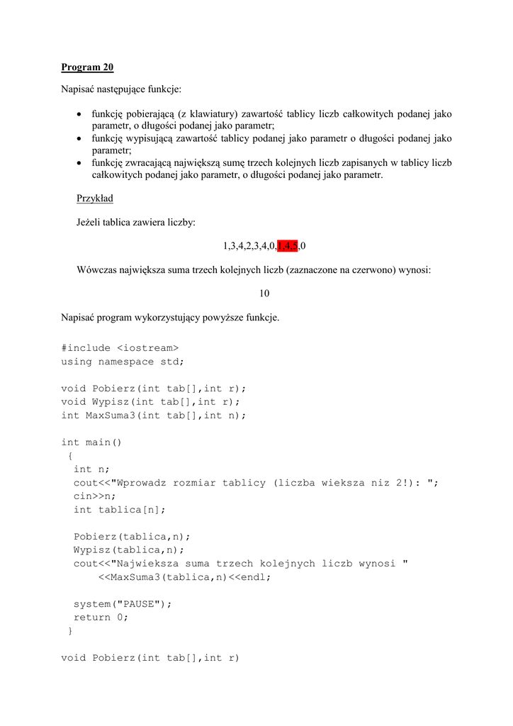 Program 20 Napisać następujące funkcje: • funkcję pobierającą (z