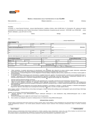 UMOWA O ŚWIADCZENIE USŁUG TELEFONICZNYCH W SIECI Data zawarcia:… … … … … … … … … … … CEKONET Miejsce zawarcia: … … … … … … … … … … … Numer Umowy: ……… … … … … … … … … Pomiędzy: CETEKOM s.c. Iwona Ryszard Karolczyk , zwanym dalej Operatorem z siedzibą w Kaliszu, adres 62-800 Kalisz, Ul. Wrocławska 102, wpisaną do rejestru przedsiębiorców prowadzonego przez Wydział Komunikacji i Ewidencji Działalności Gospodarczej pod numerami: 23939/2001 oraz 239940/2001 , numer REGON 250546461, numer NIP 618-10-14-924, w imieniu którego działa: …… … … … … … … … … … … … … … … … … … … … … … … … … … … … … … … … … … … … … … … … … … … … … … … … … … … … … … … … … … … … … … … … … oraz:… … … … … … … … … … … … … … … … … … … … … … … … … … … … … … … … … … … … … … … … … … … … … … … … … … … … … … … … … … … … … … … . ...................................zwanym dalej Klientem Dane klienta: ulica nr domu kod poczta nr lokalu miasto telefon NIP:… … … … … … … … … … Adres do korespondencji:(wypełnić tylko gdy inne niż dane klienta) REGON: ……… … … … … … … … ulica nr domu nr lokalu miasto kod poczta telefon email Operator zobowiązuje się do rozpoczęcia świadczenia usług na wiosek abonenta zgodnie z regulaminem oraz poniższą specyfikacją. Adres instalacji Identyfikator klienta: Telefon Liczba numerów Hasło klienta Numery Plan taryfowy: Usługi dodatkowe: standardowy rozszerzony Specyfikacja usług ulica nr domu nr lokalu miasto kod poczta biznesowy Umowa zostaje zawarta na okres: Termin rozpoczęcia świadczenia usługi: 24 m-cy 12 m-cy nieokreślony : … … … §1. Klient oświadcza, iż posiada tytuł prawny do nieruchomości oraz przedkłada jako załącznik do umowy pisemną zgodę właściciela, użytkownika wieczystego nieruchomości lub członka spółdzielni mieszkaniowej na przyłączenie pojedynczego zakończenia sieci. 2. Klient oświadcza, iż otrzymał Regulamin i Cennik (Regulamin Promocji*) będące integralną częścią umowy, zapoznał się z ich treścią i wyraża zgodę na ich postanowienia. 3. W szczególności Klient zobowiązuje się do: korzystania z urządzeń końcowych, zgodnie z ich przeznaczeniem, nie dokonywania jakichkolwiek zmian w instalacji i wyposażeniu stacji telefonicznej bez powiadomienia Operatora, terminowego uiszczania opłat zgodnie z otrzymanymi fakturami VAT za wszystkie usługi zrealizowane w wykonaniu niniejszej umowy niezależnie od tego kto zlecał usługę lub z niej korzystał. §2. 1. Operator zapewnia Klientowi obsługę serwisową. 2. Operator jest zobowiązany do zapłaty kar umownych albo odszkodowania w przypadku niewykonania lub nienależytego wykonania Usług. 3. Klient ma prawo składania reklamacji. W przypadku Klienta będącego konsumentem w rozumieniu stosownych przepisów, tryb postępowania reklamacyjnego uwzględnia zachowanie przepisów dotyczących możliwości rozwiązania sporu w drodze mediacji lub poddania sporu pod rozstrzygnięcie sądu polubownego. 4. Po każdorazowej zmianie Regulaminu lub Cennika Operator powiadomi o tym Klienta w terminie i w sposób określony w aktualnie obowiązującym Regulaminie. Operator zobowiązuje się do udostępniania aktualnego Regulaminu i Cennika na każde żądanie Klienta. §3. Spory mogące wynikać z niniejszej Umowy strony będą rozstrzygały w drodze mediacji albo poddają je pod rozstrzygnięcie sądu powszechnego właściwego dla siedziby Operatora. §4. Zgodnie z art. 24 ustawy o Ochronie Danych Osobowych: 1. Operator informuje, iż jest administratorem danych osobowych zbieranych w celu świadczenia usług telekomunikacyjnych oraz w celach marketingowych. 2. Klientowi przysługuje prawo wglądu do swoich danych oraz ich poprawiania, 1. 3. Dane osobowe są niezbędne do zawarcia i realizacji umowy na świadczenie usług telekomunikacyjnych. OŚWIADCZENIA KLIENTA Wyrażam zgodę na przetwarzanie moich danych osobowych tj. imienia, nazwiska, adresu i numeru telefonu w celach marketingowych oraz celem dochodzenia przez Operatora roszczeń z tytułu nieuregulowanych płatności, w tym również poprzez przekazanie wskazanych danych osobowych firmie świadczącej profesjonalne usługi w zakresie windykacji należności data i miejsce PODPIS KLIENTA Wyrażam zgodę na przetwarzanie moich danych osobowych tj. imienia, nazwiska, nazwy miejscowości i nazwy ulicy, przy której znajduje się zakończenie łącza oraz numeru telefonu w celu publikowania i podawania ich przez służby informacyjne Operatora do wiadomości innych osób. Nie wyrażenie zgody na przetwarzanie danych do wyżej wskazanych celów jest równoznaczne z zastrzeżeniem numeru. data i miejsce PODPIS KLIENTA * niepotrzebne skreślić ------------------------------ ----------------------------- PODPIS OPERTATORA 1. 2. (a) (b) (c) (d) (e) (f) (g) (h) (i) (j) PODPIS KLIENTA Regulamin świadczenia usług telekomunikacyjnych z dnia 05 listopada 2005 r. 1. §1. POSTANOWIENIA OGÓLNE 2. Regulamin oraz Cennik stanowią integralną część Umowy. Regulamin i Umowa posługują się pojęciami, które mają następujące znaczenie: Cennik – wykaz cen stosownych przez Operatora wobec Klientów z tytułu realizacji na ich rzecz Usług oraz zasady ich naliczania w zależności od wybranego planu taryfowego. Okres Rozliczeniowy – przedział czasu, w ciągu którego zrealizowane Usługi rozliczane są w tym samym terminie płatności; Opłata abonamentowa – opłata okresowa za stały dostęp do Usług; Opłata aktywacyjna – opłata jednorazowa za rozpoczęcie świadczenia Usług. Połączenie telefoniczne - połączenie ustanowione za pomocą publicznie dostępnej usługi