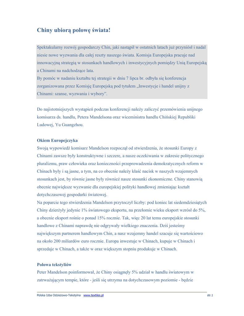 Chiny ubiorą połowę świata! Spektakularny rozwój gospodarczy Chin, jaki nastąpił w ostatnich latach juŜ przyniósł i nadal niesie nowe wyzwania dla całej reszty naszego świata. Komisja Europejska pracuje nad innowacyjną strategią w stosunkach handlowych i inwestycyjnych pomiędzy Unią Europejską a Chinami na nadchodzące lata. By pomóc w nadaniu kształtu tej strategii w dniu 7 lipca br. odbyła się konferencja zorganizowana przez Komisję Europejską pod tytułem „Inwestycje i handel unijny z Chinami: szanse, wyzwania i wybory”. Do najistotniejszych wystąpień podczas konferencji naleŜy zaliczyć przemówienia unijnego komisarza ds. handlu, Petera Mandelsona oraz wiceministra handlu Chińskiej Republiki Ludowej, Yu Guangzhou. Okiem Europejczyka Swoją wypowiedź komisarz Mandelson rozpoczął od stwierdzenia, Ŝe stosunki Europy z Chinami zawsze były konstruktywne i szczere, a nasze oczekiwania w zakresie politycznego pluralizmu, praw człowieka oraz konieczności przeprowadzenia demokratycznych reform w Chinach były i są jasne, a tym, na co obecnie naleŜy kłaść nacisk w naszych wzajemnych stosunkach jest, by równie jasne były równieŜ nasze stosunki ekonomiczne. Chiny stanowią obecnie największe wyzwanie dla europejskiej polityki handlowej zmieniając kształt dotychczasowej gospodarki światowej. Na poparcie tego stwierdzenia Mandelson przytoczył liczby: pod koniec lat siedemdziesiątych Chiny dzierŜyły jedynie 1% światowego eksportu, na przełomie wieku eksport wzrósł do 5%, a obecnie eksport rośnie o ponad 15% rocznie. Tak, więc 20 lat temu europejskie stosunki handlowe z Chinami naprawdę nie odgrywały wielkiego znaczenia. Dziś jesteśmy największym partnerem handlowym Chin, a nasz wzajemny handel szacuje się wartościowo na około 200 miliardów euro rocznie. Europa inwestuje w Chinach, kupuje w Chinach i sprzedaje w Chinach, a takŜe w oraz większym stopniu produkuje w Chinach. Połowa tekstyliów Peter Mandelson poinformował, Ŝe Chiny osiągnęły 5% udział w handlu światowym w zatrwaŜającym tempie, które - jeśli się utrzyma na dotychczasowym poziomie - będzie Polska Izba OdzieŜowo-Tekstylna www.textiles.pl str.1 oznaczać, Ŝe Chiny będą producentem połowy światowej produkcji tekstyliów. Chiny juŜ są największym odbiorcą stali, miedzi, węgla i cementu. Te wszystkie fakty w jasny sposób prowadzą do wniosku, Ŝe XXI wiek naleŜeć będzie do Chin oraz innych azjatyckich gospodarek. Czy jednak rozwój Chin moŜna określić jako zrównowaŜony? Czy moŜe on stanowić właściwą bazę do tworzenia długofalowych planów: politycznych, społecznych i w zakresie ochrony środowiska? Jeśli odpowiedź na tak zadane pytanie byłaby twierdząca, to czy światowy system handlowy zniesie ciągły i gwałtowny rozwój tego rodzaju? Wysyłać za chiński mur… Zbyt często biznes europejski napotyka raczej na chiński mur niŜ otwarte drzwi. Chiny są członkiem WTO od pięciu lat, i śmiało moŜna zadać pytanie jak dalece wychodzą one na przeciw oczekiwaniom WTO. Chiny, bowiem w dalszym ciągu „mówią” tak jakby stały na uboczu jedynie przyglądając się systemowi, nie przyjmując do wiadomości faktu, Ŝe juŜ w tym systemie funkcjonują. Chiny to takŜe ciągle rosnący rynek zbytu produktów, które mogłaby produkować Unia Europejska. 50 milionów Chińczyków osiągnęło juŜ standard Ŝycia równy europejskiej klasie średniej. JednakŜe, na kaŜde cztery kontenery załadowane w Shenzen i wysłane do Europy, trzy ciągle wracają puste. Ta sytuacja nie ma nic wspólnego z europejskim brakiem przedsiębiorczości. Kontenery pozostają puste w drodze powrotnej, bo prawa europejskiego biznesu nie są właściwie chronione w Chinach lub, poniewaŜ Europejczycy nie mają właściwego dostępu do chińskiego rynku. Chiński punkt widzenia Chiński punkt widzenia na zaprezentowane przez Komisarza Petera Mandelsona kwestie przedstawił chiński wiceminister Handlu - Yu Guangzhou stwierdzając na wstępie, Ŝe gospodarki Chin i Unii Europejskiej nawzajem się uzupełniają i jedna bez drugiej z całą pewnością nie mogłyby się właściwie rozwijać. Chiny eksportują głównie produkty wymagające duŜego nakładu pracy, na przykład tekstylia oraz maszyny i elektronikę. Z Europy Chiny importują głównie kapitał, technologię i półprodukty do handlu przerobowego. W oparciu o porównywalne moŜliwości Chiny i Unia Europejska osiągnęły wzrost handlu, wzrost nakładów na inwestycje, zaawansowanie technologii oraz wzrost liczby miejsc pracy. Polska Izba OdzieŜowo-Tekstylna www.textiles.pl str.2 Rozwijając temat wzrostu handlu minister stwierdził, Ŝe Unia Europejska przesunęła się z pozycji numer cztery na pozycję numer jeden, największego obecnego partnera handlowego Chin, a pozycja Chin w rankingu z Unią równieŜ zmieniła się z dwunastej na drugą. Lukratywne kontrakty Rozwój Chin spowodował takŜe lukratywne profity dla inwestorów na świecie. Od 1990 do 2005 roku, zwrot kapitału zagranicznego zainwestowanego w przedsiębiorstwa w Chinach zamknął się liczbą 280 miliardów dolarów. Chiny są obecnie największym źródłem importu technologii z Unii Europejskiej. Chińczycy zaimportowali aŜ 23.000 technologii z Unii Europejskiej o ogólnej wartości 99 miliardów USD, co stanowi 42% wartości całego importu technologii. Wszystkie powyŜsze aspekty miały takŜe wpływ na wzrost liczby miejsc pracy. Wartość chińskiego importu ocenia się na 660 miliardów dolarów, co dało w efekcie w samej UE 1,5 miliona, a na całym świecie miliony miejsc pracy. Obecność chińskich przedsiębiorstw na rynkach europejskich ma równieŜ znaczny udział w kreowaniu nowych miejsc pracy. Obie strony odnoszą więc korzyści ze współpracy, ponad 80% towarów będących przedmiotem handlu pomiędzy Chinami i UE jest komplementarnych względem siebie, ale tylko około 10% stanowi dla sieb