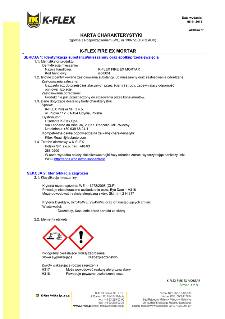Data wydania: 06.11.2015 WERSJA Nr KARTA CHARAKTERYSTYKI zgodna z Rozporządzeniem (WE) nr 1907/2006 (REACH) K-FLEX FIRE EX MORTAR SEKCJA 1: Identyfikacja substancji/mieszaniny oraz spółki/przedsięwzięcia 1.1. Identyfikator produktu Identyfikacja mieszaniny: Nazwa handlowa: K-FLEX FIRE EX MORTAR Kod handlowy: isol005f 1.2. Istotne zidentyfikowane zastosowania substancji lub mieszaniny oraz zastosowania odradzane Zastosowania zalecane: Uszczelniacz do przejść instalacyjnych przez ściany i stropy, zapewniający odporność ogniową i izolację. Zastosowania odradzane: Produkt nie jest przeznaczony do stosowania przez konsumentów. 1.3. Dane dotyczące dostawcy karty charakterystyki Spółka: K-FLEX Polska SP. z o.o. ul. Pucka 112, 81-154 Gdynia, Polska Dystrybutor: L'Isolante K-Flex SpA Via Leonardo da Vinci 36, 20877. Roncello, MB, Włochy Nr telefonu: +39 039 68 24.1 Kompetentna osoba odpowiedzialna za kartę charakterystyki: [email protected] 1.4. Telefon alarmowy w K-FLEX Polska SP. z o.o. Tel.: +48 63 288 0200 W razie wypadku należy zlokalizować najbliższy ośrodek zatruć, wykorzystując poniższy link: WHO http://apps.who.int/poisoncentres/ SEKCJA 2: Identyfikacja zagrożeń 2.1. Klasyfikacja mieszaniny Kryteria rozporządzenia WE nr 1272/2008 (CLP): Powoduje nieodwracalne uszkodzenie oczu, Eye Dam 1 H318 Może powodować reakcję alergiczną skóry, Skin Irrit 2 H 317 Kryteria Dyrektyw, 67/548/WE, 99/45/WE oraz ich następujących zmian: Właściwości: Drażniący, Uczulenie przez kontakt ze skórą 2.2. Elementy etykiety Piktogramy określające rodzaj zagrożenia: Słowa sygnalizujące Niebezpieczeństwo Zwroty wskazujące rodzaj zagrożenia H317 Może powodować reakcję alergiczną skóry H318 Powoduje poważne uszkodzenie oczu K-FLEX FIRE EX MORTAR Strona 1 z 8 Data wydania: 06.11.2015 WERSJA Nr KARTA CHARAKTERYSTYKI zgodna z Rozporządzeniem (WE) nr 1907/2006 (REACH) K-FLEX FIRE EX MORTAR Zwroty wskazujące środki ostrożności P261 Unikać wdychania pyłu P280 Stosować rękawice ochronne, odzież ochronną oraz ochronę oczu lub twarzy P302+P352 W PRZYPADKU DOSTANIA SIĘ NA SKÓRĘ: Przemyć dużą ilością wody z mydłem. P305+P351+P338 W PRZYPADKU DOSTANIA SIĘ DO OCZU: Ostrożnie płukać wodą przez kilka minut. Wyjąć soczewki kontaktowe, jeżeli są założone i jeśli można je łatwo usunąć. Nadal płukać. P310 Natychmiast skontaktować się z OŚRODKIEM ZATRUĆ lub lekarzem 2.3. Inne zagrożenia Substancje vPvB: Brak - Substancje PBT: Brak Nie zawiera azbestu, włókien, fluorowców ani innych materiałów klasyfikowanych jako niebezpieczne. SEKCJA 3: Skład/informacja o składnikach 3.1. Substancje nie dotyczy 3.2. Mieszaniny Proszę pamiętać, że tabela informuje o znanych zagrożeniach stwarzanych przez składniki w czystej postaci. Zagrożenia te zostają zredukowane lub wyeliminowane po zmieszaniu lub rozcieńczeniu. 15-20% CEMENT PORTLANDZKI Numer CAS: 65997-15-1 Numer WE: 266-043-4 Numer indeksowy: Nie dotyczy Numer rejestracyjny: Nie dotyczy Klasyfikacja: Skin Irrit 2, H315 Eye Dam 1, H318 Skin Sens 1B, H317 STOT SE 3, H335 Substancja, dla której wyznaczono wspólnotowe dopuszczalne normy narażenia w miejscu pracy: SEKCJA 4: Środki pierwszej pomocy 4.1. Opis środków pierwszej pomocy W przypadku kontaktu ze skórą: Natychmiast zdjąć całą zanieczyszczoną odzież i usunąć ją w bezpieczny sposób. Obszary na ciele, które miały kontakt - lub tylko podejrzewamy, że miały kontakt - z produktem, muszą zostać natychmiast umyte dużą ilością bieżącej wody, najlepiej z mydłem. Dokładnie umyć ciało (wziąć prysznic lub kąpiel). Nie stosować rozpuszczalników ani rozcieńczalników. Jeżeli dojdzie do utrzymującego się podrażnienia skóry należy zgłosić się do lekarza. W przypadku kontaktu z oczami: W przypadku kontaktu z oczami należy usunąć cząsteczki stałe i natychmiast i przez co najmniej 15 minut płukać oczy dużą ilością wody oraz zasięgnąć porady lekarza. W przypadku połknięcia: Wypłukać usta wodą. Wypić dużą ilość wody. W żadnym razie nie wywoływać wymiotów. Natychmiast przeprowadzić badania lekarskie. W przypadku wdychania pyłu, który powstał podczas pracy z produktem: K-FLEX FIRE EX MORTAR Strona 2 z 8 Data wydania: 06.11.2015 WERSJA Nr KARTA CHARAKTERYSTYKI zgodna z Rozporządzeniem (WE) nr 1907/2006 (REACH) K-FLEX FIRE EX MORTAR Wyprowadzić/wynieść poszkodowanego na świeże powietrze, przepłukać nos, usta i gardło wodą, zapewnić ciepło i spokój. Natychmiast przeprowadzić badania lekarskie. 4.2. Najważniejsze ostre i opóźnione objawy oraz skutki narażenia W miejscu kontaktu może wystąpić łagodne podrażnienie. 4.3. Wskazania dotyczące wszelkiej natychmiastowej pomocy lekarskiej i szczególnego postępowania z poszkodowanym W razie wypadku lub złego samopoczucia należy natychmiast zasięgnąć porady lekarza (jeśli to możliwe należy pokazać lekarzowi wskazówki dot. sposobu stosowania lub kartę charakterystyki produktu). Leczenie: Nie jest dotąd znane. SEKCJA 5: Postępowanie w przypadku pożaru 5.1. Środki gaśnicze Odpowiednie środki gaśnicze: Woda. Dwutlenek węgla (CO2). Środki gaśnicze, których nie wolno stosować ze względów bezpieczeństwa: Brak szczególnych środków. 5.2. Szczególne zagrożenia związane z substancją lub mieszaniną Nie wdychać gazów powstałych w wyniku spalania. W przypadku pożaru może powstawać gęsty dym zawierający niebezpieczne produkty spalania (tlenek i dwutlenek węgla). W przypadku niepełnego spalania powstają produkty zawierające niebezpieczne aldehydy i inne toksyczne, szkodliwe, drażniące substancje lub substancje wywierające niekorzystny wpływ na środowisko naturalne. Produkt nie stwarza zagrożenia związanego z palnością. 5.3. Informacje dla straży pożarnej Używać odpowiedniego aparatu oddechowego. Oddzielnie zebrać wodę zanieczyszczoną podczas gaszenia pożaru. Nie wol