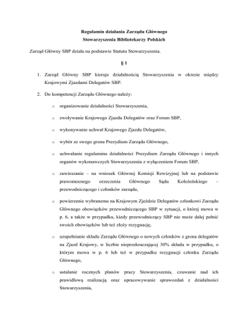 Regulamin działania Zarządu Głównego Stowarzyszenia Bibliotekarzy Polskich Zarząd Główny SBP działa na podstawie Statutu Stowarzyszenia. §1 1. Zarząd Główny SBP kieruje działalnością Stowarzyszenia w okresie między Krajowymi Zjazdami Delegatów SBP. 2. Do kompetencji Zarządu Głównego należy: o organizowanie działalności Stowarzyszenia, o zwoływanie Krajowego Zjazdu Delegatów oraz Forum SBP, o wykonywanie uchwał Krajowego Zjazdu Delegatów, o wybór ze swego grona Prezydium Zarządu Głównego, o uchwalanie regulaminu działalności Prezydium Zarządu Głównego i innych organów wykonawczych Stowarzyszenia z wyłączeniem Forum SBP, o zawieszanie – na wniosek Głównej Komisji Rewizyjnej lub na podstawie prawomocnego orzeczenia Głównego Sądu Koleżeńskiego – przewodniczącego i członków zarządu, o powierzenie wybranemu na Krajowym Zjeździe Delegatów członkowi Zarządu Głównego obowiązków przewodniczącego SBP w sytuacji, o której mowa w p. 6, a także w przypadku, kiedy przewodniczący SBP nie może dalej pełnić swoich obowiązków lub też złoży rezygnację, o uzupełnianie składu Zarządu Głównego o nowych członków z grona delegatów na Zjazd Krajowy, w liczbie nieprzekraczającej 30% składu w przypadku, o którym mowa w p. 6 lub też w przypadku rezygnacji członka Zarządu Głównego, o ustalanie rocznych planów pracy Stowarzyszenia, czuwanie nad ich prawidłową realizacją oraz opracowywanie sprawozdań z działalności Stowarzyszenia, o sprawowanie pieczy nad majątkiem Stowarzyszenia, opracowywanie budżetu i zaleceń dotyczących gospodarki składkami członków oraz zatwierdzanie bilansu rocznego, o podejmowanie uchwał o działalności gospodarczej Stowarzyszenia oraz wyrażanie zgody na podjęcie takiej działalności przez zarządy okręgów, o powoływanie okręgów, nadzór nad ich działalnością, a także zatwierdzanie wniosków zarządów okręgów o ich rozwiązanie, o rozpatrywanie odwołań od uchwał zarządów okręgów, o tworzenie i rozwiązywanie sekcji, komisji i zespołów problemowych działających przy Zarządzie Głównym, o powoływanie i zmiana składu kolegiów redakcyjnych czasopism wydawanych przez Stowarzyszenie, przedkładanie Krajowemu Zjazdowi Delegatów wniosków w sprawie nadania godności członka honorowego SBP, o przyznawanie Honorowej Odznaki Stowarzyszenia i zatwierdzanie wniosków w sprawie odznaczeń, medali, nagród, stypendiów, itp. o reprezentowanie Stowarzyszenia w kraju i za granicą, o podejmowanie uchwał o przystąpieniu do związków stowarzyszeń krajowych i zagranicznych, o podejmowanie uchwał w sprawie porozumień o współpracy z organizacjami krajowymi i zagranicznymi. o zatwierdzenie Regulaminu działania Biura Zarządu Głównego SBP. 3. Zarząd Główny, w ciągu miesiąca od dnia wyboru, zawiadamia sąd rejestrowy i organ nadzorujący o swoim składzie, miejscu zamieszkania członków Zarządu oraz o adresie swojej siedziby, a także zgłasza wszelkie zmiany w składzie Zarządu, w adresie siedziby oraz Statucie. §2 1. Zarząd Główny składa się z przewodniczącego i 14 członków wybieranych przez Krajowy Zjazd Delegatów SBP. 2. Na pierwszym posiedzeniu Zarząd Główny wybiera spośród swego grona zastępców przewodniczącego, sekretarza generalnego. Przydziela członkom Zarządu kompetencje i obowiązki. §3 1. Posiedzenia Zarządu Głównego odbywają się co najmniej dwa razy do roku w miarę możliwości w z góry ustalonych terminach. 2. W przypadku ważnych okoliczności, a także na pisemne żądanie co najmniej 1/2 członków ZG lub na żądanie GKR posiedzenia mogą być zwoływane poza planowanymi terminami. Decyzja o pozaplanowym posiedzeniu zapada na mocy uchwały Prezydium ZG SBP. 3. Raz do roku Zarząd Główny jest zobowiązany do zwołania posiedzenia ze wszystkimi przewodniczącymi zarządów okręgów, w miarę potrzeby z przewodniczącymi sekcji, komisji i zespołów problemowych. Forum może pełnić funkcję takiego posiedzenia. 4. Na posiedzeniu ZG SBP w składzie poszerzonym z udziałem osób wymienionych w pkt. 3, głos stanowiący mają wszyscy uczestnicy tego zebrania. 5. W posiedzeniach Zarządu Głównego mogą uczestniczyć (z głosem doradczym) zaproszone osoby nie będące członkami Zarządu Głównego, o ile wymaga tego tematyka poruszanych spraw. §4 1. Członkowie Zarządu Głównego i osoby zaproszone powinny otrzymywać zawiadomienia o posiedzeniach ZG co najmniej na tydzień przed wyznaczonym terminem posiedzenia wraz z informacją o proponowanym porządku obrad. 2. Miejscem posiedzeń ZG jest Warszawa. W uzasadnionych przypadkach dopuszcza się możliwość zmiany miejsca posiedzenia. Decyzję w tym względzie podejmuje przewodniczący SBP lub sekretarz generalny. §5 1. Porządek obrad ustalają przewodniczący ZG lub sekretarz generalny. Oni też prowadzą obrady. 2. Posiedzenia Zarządu Głównego są protokółowane. 3. Uchwały ZG są podejmowane zwykłą większością głosów w głosowaniu jawnym. W przypadku równowagi głosów decyduje głos przewodniczącego. 4. Na żądanie co najmniej 1/3 uczestników posiedzenia z głosem stanowiącym o utajnienie głosowania, prowadzący jest zobowiązany zarządzić głosowanie tajne. Do prawomocności uchwał Zarządu Głównego konieczna jest obecność ponad połowy członków ZG SBP. 5. Uchwały ZG SBP są publikowane w „Biuletynie Informacyjnym ZG SBP” lub czasopismach SBP. §6 1. W ramach podziału kompetencji i obowiązków, każdy członek Zarządu Głównego SBP odpowiedzialny za powierzoną mu funkcję zobowiązany jest do składania sprawozdań ze swej działalności. 2. Sprawozdania z działalności ZG SBP składa sekretarz generalny. 3. Nieusprawiedliwiona nieobecność członka ZG SBP na trzech kolejnych obowiązujących go zebraniach lub stałe nie wykonywanie zleconych mu zadań, może spowodować przedstawienie wniosku na posiedzeniu Zarządu Gł