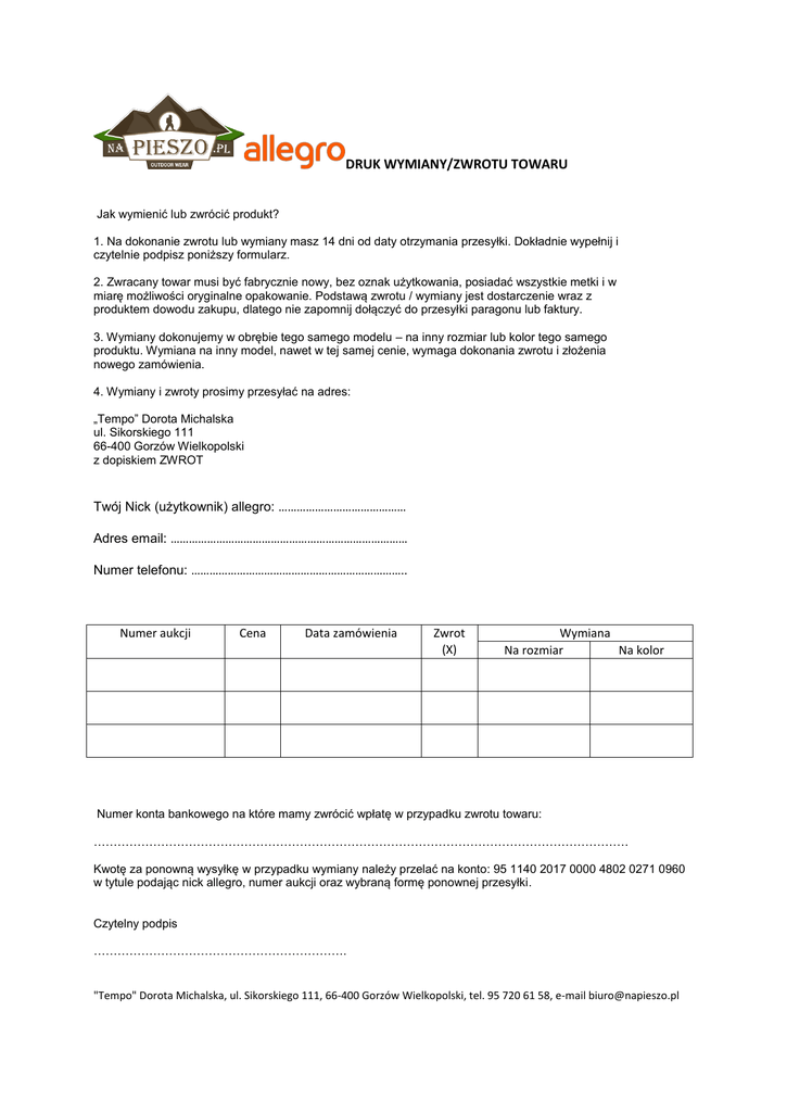 DRUK WYMIANY/ZWROTU TOWARU Jak wymienić lub zwrócić produkt? 1. Na dokonanie zwrotu lub wymiany masz 14 dni od daty otrzymania przesyłki. Dokładnie wypełnij i czytelnie podpisz poniższy formularz. 2. Zwracany towar musi być fabrycznie nowy, bez oznak użytkowania, posiadać wszystkie metki i w miarę możliwości oryginalne opakowanie. Podstawą zwrotu / wymiany jest dostarczenie wraz z produktem dowodu zakupu, dlatego nie zapomnij dołączyć do przesyłki paragonu lub faktury. 3. Wymiany dokonujemy w obrębie tego samego modelu – na inny rozmiar lub kolor tego samego produktu. Wymiana na inny model, nawet w tej samej cenie, wymaga dokonania zwrotu i złożenia nowego zamówienia. 4. Wymiany i zwroty prosimy przesyłać na adres: „Tempo” Dorota Michalska ul. Sikorskiego 111 66-400 Gorzów Wielkopolski z dopiskiem ZWROT Twój Nick (użytkownik) allegro: …………………………………… Adres email: …………………………………………………………………… Numer telefonu: …………………………………………………………….. Numer aukcji Cena Data zamówienia Zwrot (X) Wymiana Na rozmiar Na kolor Numer konta bankowego na które mamy zwrócić wpłatę w przypadku zwrotu towaru: ……………………………………………………………………………………………………………………… Kwotę za ponowną wysyłkę w przypadku wymiany należy przelać na konto: 95 1140 2017 0000 4802 0271 0960 w tytule podając nick allegro, numer aukcji oraz wybraną formę ponownej przesyłki. Czytelny podpis ………………………………………………………. "Tempo" Dorota Michalska, ul. Sikorskiego 111, 66-400 Gorzów Wielkopolski, tel. 95 720 61 58, e-mail [email protected]