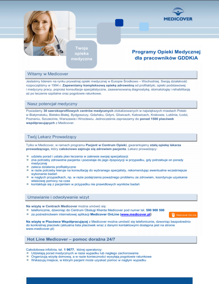 Twoja opieka medyczna Programy Opieki Medycznej dla pracowników GDDKiA Witamy w Medicover Jesteśmy liderem na rynku prywatnej opieki medycznej w Europie Środkowo – Wschodniej. Swoją działalność rozpoczęliśmy w 1994 r. Zapewniamy kompleksową opiekę zdrowotną od profilaktyki, opieki podstawowej i medycyny pracy, poprzez konsultacje specjalistyczne, zaawansowaną diagnostykę, stomatologię i rehabilitację aż po leczenie szpitalne oraz pogotowie ratunkowe. Nasz potencjał medyczny Posiadamy 30 szerokoprofilowych centrów medycznych zlokalizowanych w największych miastach Polski: w Białymstoku, Bielsko-Białej, Bydgoszczy, Gdańsku, Gdyni, Gliwicach, Katowicach, Krakowie, Lublinie, Łodzi, Poznaniu, Szczecinie, Warszawie i Wrocławiu. Jednocześnie zapraszamy do ponad 1500 placówek współpracujących z Medicover. Twój Lekarz Prowadzący Tylko w Medicover, w ramach programu Pacjent w Centrum Opieki, gwarantujemy stałą opiekę lekarza prowadzącego, który całościowo zajmuje się zdrowiem pacjenta. Lekarz prowadzący: udziela porad i ustala plan leczenia w zakresie swojej specjalizacji zna potrzeby zdrowotne pacjenta i pozostaje do jego dyspozycji w przypadku, gdy potrzebuje on porady medycznej zaleca działania profilaktyczne w razie potrzeby kieruje na konsultację do wybranego specjalisty, rekomendując ewentualne wcześniejsze wykonanie badań w nagłych przypadkach, np. w razie podejrzenia poważnego problemu ze zdrowiem, koordynuje uzyskanie właściwej pomocy na czas kontaktuje się z pacjentem w przypadku nie prawidłowych wyników badań Umawianie i odwoływanie wizyt Na wizytę w Centrach Medicover można umówić się: telefonicznie, dzwoniąc do Centrum Obsługi Klienta Medicover pod numer tel. 500 900 500 za pośrednictwem internetowej aplikacji Medicover OnLine (www.medicover.pl) Na wizytę w Placówce Współpracującej z Medicover można umówić się telefonicznie, dzwoniąc bezpośrednio do konkretnej placówki (aktualna lista placówek wraz z danymi kontaktowymi dostępna jest na stronie www.medicover.pl) Hot Line Medicover – pomoc doraźna 24/7 Całodobowa infolinia, tel. 1 9677, której operatorzy: Udzielają porad medycznych w razie wypadku lub nagłego zachorowania Organizują wizytę domową, a w razie konieczności wysyłają pogotowie ratunkowe Wskazują miejsce, w którym pacjent może uzyskać pomoc w nagłym wypadku Programy Opieki Medycznej Programy Profit Plus Podstawowy Specjalistyczny Hot Line Medicover, 24/7 Telefoniczna Konsultacja Medyczna + + + Pogotowie i Transport Sanitarny - + + Konsultacje lekarzy PODSTAWOWEJ OPIEKI ZDROWOTNEJ: internisty, pediatry, lekarza medycyny rodzinnej, ginekologa + + + Konsultacje WYBRANYCH LEKARZY SPECJALISTÓW: okulisty, laryngologa, chirurga, ortopedy, kardiologa, neurologa, dermatologa, endokrynologa + + + Kompleksowa opieka lekarzy specjalistów (67 specjalizacji) - - + Alergolog - + + Opieka psychologa, psychiatry, seksuologa, dietetyka, logopedy (w ramach limitu) - - + Podstawowa diagnostyka: badania laboratoryjne, RTG, USG, cytologia, EKG ok. 190 badań + + + + + Szeroka diagnostyka: badania laboratoryjne, RTG, USG ok. 500 badań Kompleksowa diagnostyka: specjalistyczne badania laboratoryjne, tomografia, rezonans, biopsje, endoskopia ok. 1200 badań - - + Testy alergologiczne - Podstawowe Rozszerzone Podstawowe zabiegi ambulatoryjne: chirurgiczne, ginekologiczna, laryngologiczne i urologiczne - + + Zabiegi ambulatoryjne – szeroki zakres - - + Program prowadzenia ciąży - + + Wizyty domowe - Fizjoterapia (rehabilitacja) - Specjalistyczne Procedury Ambulatoryjne (wykonywane ambulatoryjnie lub w ramach hospitalizacji jednodniowej) Opieka stomatologiczna Szczepienie przeciwko grypie Dostęp do Centrów Medycznych Damiana Zniżki na usługi nieobjęte programem (5% - poród w Szpitalu Medicover, 15% - pozostałe usługi w Szpitalu Medicover) 3 w ciągu roku/na osobę 10 w ciągu roku/na osobę 30 w ciągu roku/na osobę 15% zniżki 15% zniżki 15% zniżki 10% zniżki 10% zniżki 10% zniżki + + + - + + + + + Bez limitów Cennik Programów/miesięcznie Program pojedynczy 55 zł 69 zł 90 zł Program Partnerski (cena za pracownika + współmałżonka/partnera lub jedno dziecko) 99 zł 144 zł 162 zł Program Rodzinny (cena za pracownika + współmałżonka/partnera + nieograniczoną liczbę dzieci) 148 zł 216 zł 243 zł