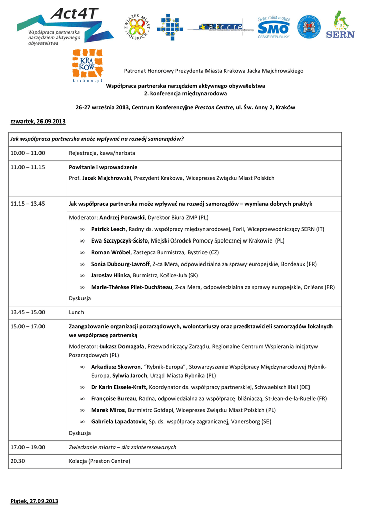 Patronat Honorowy Prezydenta Miasta Krakowa Jacka Majchrowskiego Współpraca partnerska narzędziem aktywnego obywatelstwa 2. konferencja międzynarodowa 26-27 września 2013, Centrum Konferencyjne Preston Centre, ul. Św. Anny 2, Kraków czwartek, 26.09.2013 Jak współpraca partnerska może wpływać na rozwój samorządów? 10.00 – 11.00 Rejestracja, kawa/herbata 11.00 – 11.15 Powitanie i wprowadzenie Prof. Jacek Majchrowski, Prezydent Krakowa, Wiceprezes Związku Miast Polskich 11.15 – 13.45 Jak współpraca partnerska może wpływać na rozwój samorządów – wymiana dobrych praktyk Moderator: Andrzej Porawski, Dyrektor Biura ZMP (PL) • Patrick Leech, Radny ds. współpracy międzynarodowej, Forli, Wiceprzewodniczący SERN (IT) • Ewa Szczypczyk-Ścisło, Miejski Ośrodek Pomocy Społecznej w Krakowie (PL) • Roman Wróbel, Zastępca Burmistrza, Bystrice (CZ) • Sonia Dubourg-Lavroff, Z-ca Mera, odpowiedzialna za sprawy europejskie, Bordeaux (FR) • Jaroslav Hlinka, Burmistrz, Košice-Juh (SK) • Marie-Thérèse Pilet-Duchâteau, Z-ca Mera, odpowiedzialna za sprawy europejskie, Orléans (FR) Dyskusja 13.45 – 15.00 Lunch 15.00 – 17.00 Zaangażowanie organizacji pozarządowych, wolontariuszy oraz przedstawicieli samorządów lokalnych we współpracę partnerską Moderator: Łukasz Domagała, Przewodniczący Zarządu, Regionalne Centrum Wspierania Inicjatyw Pozarządowych (PL) • Arkadiusz Skowron, “Rybnik-Europa”, Stowarzyszenie Współpracy Międzynarodowej RybnikEuropa, Sylwia Jaroch, Urząd Miasta Rybnika (PL) • Dr Karin Eissele-Kraft, Koordynator ds. współpracy partnerskiej, Schwaebisch Hall (DE) • Françoise Bureau, Radna, odpowiedzialna za współpracę bliźniaczą, St-Jean-de-la-Ruelle (FR) • Marek Miros, Burmistrz Gołdapi, Wiceprezes Związku Miast Polskich (PL) • Gabriela Lapadatovic, Sp. ds. współpracy zagranicznej, Vanersborg (SE) Dyskusja 17.00 – 19.00 Zwiedzanie miasta – dla zainteresowanych 20.30 Kolacja (Preston Centre) Piątek, 27.09.2013 Zaangażowanie młodzieży w aktywność międzynarodową samorządów 09.00 – 10.50 Jak zwiększyć zaangażowanie i włączać młodych ludzi w aktywność międzynarodową społeczności lokalnej? Moderator: Paweł Moras, Dyrektor Zarządzający, Polsko-Niemiecka Współpraca Młodzieży (PL) • Ingrid Cammerzell, Koordynatorka ds. współpracy partnerskiej, Frankfurt nad Menem (DE) • Agnieszka Chrząszcz, Kierownik Biura Strategii i Rozwoju, UM Radomska (PL) • Sona Kapicova, Decin (CZ) • Raymond Filipiak, Przewodniczący Komitetu Partnerstwa, Longueau (FR) • Gianluca Manelli, Zastępca Burmistrza, Scandiano (IT) • Anne-Sophie Motylicki, Departament Współpracy Międzynarodowej, Bordeaux (FR) Dyskusja 10.50-11.00 kawa/herbata 11.00 – 11.50 Prezentacja filmów “Współpraca międzynarodowa gminy z perspektywy młodych mieszkańców” Wyniki konkursu i ceremonia wręczenia dyplomów. 11.50 – 12.00 Wnioski i podsumowanie konferencji Marek Miros, Wiceprezes Związku Miast Polskich, Burmistrz Gołdapi 12.00 – 14.00 Wizyty studyjne: Dom Norymberski/U Pana Cogito 14.00 – 15.00 Lunch (Preston Centre)