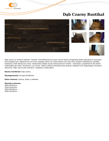 Dąb Czarny Rustikal Dąb czarny to drewno stabilne i twarde. Charakterystyczna jest czarna barwa osiągniętą dzięki specjalnym procesom technologicznym. Materiał ten nie traci swojego koloru po cyklinowaniu tak więc przy każdym odświeżaniu podłogi będziemy mieli identyczny kolor. Doskonale nadaje się do nowoczesnych wnętrz - stanowiąc uzupełnienie dla takich materiałów jak szkło, aluminium czy chrom. Klasę rustikal charakteryzuje żywsze usłojenie oraz pojawiające się jasne elementy. Dąb czarny jest twardym i stabilnym materiałem. Nazwy handlowe: Dąb czarny Występowanie: Europa Środkowa Kolor drewna: Czarny, kawa z mlekiem Wymiary drewna: 500x70x22mm 350x70x22mm 500x70x16mm 300x70x16mm