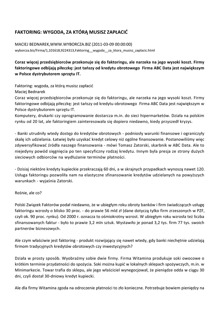 FAKTORING: WYGODA, ZA KTÓRĄ MUSISZ ZAPŁACIĆ MACIEJ BEDNAREK,WWW.WYBORCZA.BIZ (2011-03-09 00:00:00) wyborcza.biz/Firma/1,101618,9224313,Faktoring__wygoda__za_ktora_musisz_zaplacic.html Coraz więcej przedsiębiorców przekonuje się do faktoringu, ale narzeka na jego wysoki koszt. Firmy faktoringowe odbijają piłeczkę: jest tańszy od kredytu obrotowego Firma ABC Data jest największym w Polsce dystrybutorem sprzętu IT. Faktoring: wygoda, za którą musisz zapłacić Maciej Bednarek Coraz więcej przedsiębiorców przekonuje się do faktoringu, ale narzeka na jego wysoki koszt. Firmy faktoringowe odbijają piłeczkę: jest tańszy od kredytu obrotowego Firma ABC Data jest największym w Polsce dystrybutorem sprzętu IT. Komputery, drukarki czy oprogramowanie dostarcza m.in. do sieci hipermarketów. Działa na polskim rynku od 20 lat, ale faktoringiem zainteresowała się dopiero niedawno, kiedy przyszedł kryzys. - Banki utrudniły wtedy dostęp do kredytów obrotowych - podniosły warunki finansowe i ograniczyły skalę ich udzielania. Łatwiej było uzyskać kredyt celowy niż ogólne finansowanie. Postanowiliśmy więc zdywersyfikować źródła naszego finansowania - mówi Tomasz Zatorski, skarbnik w ABC Data. Ale to niejedyny powód sięgnięcia po ten specyficzny rodzaj kredytu. Innym była presja ze strony dużych sieciowych odbiorców na wydłużanie terminów płatności. - Dzisiaj niektóre kredyty kupieckie przekraczają 60 dni, a w skrajnych przypadkach wynoszą nawet 120. Usługa faktoringu pozwoliła nam na elastyczne sfinansowanie kredytów udzielanych na powyższych warunkach - wyjaśnia Zatorski. Rośnie, ale co? Polski Związek Faktorów podał niedawno, że w ubiegłym roku obroty banków i firm świadczących usługę faktoringu wzrosły o blisko 30 proc. - do prawie 56 mld zł (dane dotyczą tylko firm zrzeszonych w PZF, czyli ok. 90 proc. rynku). Od 2000 r. oznacza to ośmiokrotny wzrost. W ubiegłym roku wzrosła też liczba sfinansowanych faktur - było to prawie 3,2 mln sztuk. Wystawiło je ponad 3,2 tys. firm 77 tys. swoich partnerów biznesowych. Ale czym właściwie jest faktoring - produkt rozwijający się nawet wtedy, gdy banki niechętnie udzielają firmom tradycyjnych kredytów obrotowych czy inwestycyjnych? Działa w prosty sposób. Wyobraźmy sobie dwie firmy. Firma Witamina produkuje soki owocowe o krótkim terminie przydatności do spożycia. Soki można kupić w lokalnych sklepach spożywczych, m.in. w Minimarkecie. Towar trafia do sklepu, ale jego właściciel wynegocjował, że pieniądze odda w ciągu 30 dni, czyli dostał 30-dniowy kredyt kupiecki. Ale dla firmy Witamina zgoda na odroczenie płatności to zło konieczne. Potrzebuje bowiem pieniędzy na bieżącą działalność, np. na zakup składników do produkcji kolejnej partii soków. Skąd wziąć na to pieniądze? Albo z oszczędności - jeśli są - albo z kredytu obrotowego, najczęściej w formie linii kredytowej. Innym sposobem jest właśnie faktoring. Jeśli firma Witamina skorzysta z tej usługi, po przedstawieniu faktorowi (bank albo specjalistyczna firma) faktury za dostarczony Minimarketowi towar, na jej podstawie prawie natychmiast dostanie pieniądze. Minimarket w ciągu 30 dni zapłaci za fakturę, ale już nie firmie Witamina, ale bankowi. Korzyści jest tu kilka: producent soków nie traci płynności finansowej, może zainwestować w produkcję, a kontrahent korzysta z kredytu kupieckiego. Przedsiębiorcy, którzy korzystają z faktoringu, nie ukrywają, że pojawienie się banku w rozliczeniach sprawia, iż kontrahenci solidniej regulują swoje zobowiązania. Ponadto w wariancie faktoringu pełnego (droższego) ryzyko niewypłacalności kontrahenta przejmuje na siebie bank. Jeśli Minimarket nie zapłaci, właściciel soków w żaden sposób na tym nie ucierpi. To już problem banku, w jaki sposób wyegzekwować dług od właściciela sklepu spożywczego. Dla dużych i małych ABC Data to duża firma. W rankingach plasuje się w pierwszej setce największych polskich przedsiębiorstw. Ale czy faktoring jest też dla firm małych i mikro? Bankowcy przekonują, że tak. - Skala działalności firmy nie jest czynnikiem decydującym o tym, czy korzystanie z faktoringu będzie opłacalne. Generalnie przy obrotach rocznych od miliona złotych usługa ta już daje wartość dodaną. A więc nawet mikrofirmy mogą na faktoringu skorzystać - przekonuje Paweł Kacprzak, dyrektor ds. faktoringu w Raiffeisen Banku. Dodaje jednak, że im większy obrót (czyli więcej faktur o dużej wartości) przekazywany jest do faktoringu, tym jego cena jest niższa, a więc i korzyści większe. - Najważniejsze elementy, które powinny przesądzać o wyborze faktoringu, to posiadanie odbiorców, z którymi współpracujemy w sposób cykliczny, a nie przeprowadzamy jednorazowe transakcje, udzielanie odroczonych terminów płatności wynoszących minimum 14 dni, choć trzeba też zakładać kilkudniowe opóźnienia w płatnościach, co jest standardem na rynku, oraz rozliczanie się z odbiorcami z wyłączeniem kompensat i potrąceń - wylicza Paweł Kacprzak. Nic za darmo W bankach przekonują, że nawet mała firma może korzystać z faktoringu. Ale czy będzie ją na to stać? Banki nie wywieszają cenników, bo - jak podkreślają - do każdego klienta podchodzą indywidualnie. Wielu przedsiębiorców zmuszonych do skorzystania z faktoringu narzeka jednak na jego cenę. Mirosław Jakowiecki, prezes Pekao Faktoring, na łamach miesięcznika "Strategie" nie zgadza się z poglądem, że faktoring jest drogi. Jego zdaniem po uwzględnieniu dodatkowych usług, jakie daje faktoring, ta forma kredytu może być wręcz tańsza niż klasyczny kredyt obrotowy. A już zdecydowanie przeciwny jest opinii przedsiębiorcy z Rawy Mazowieckiej, który oznajmił niedawno na łamach "Gazety", że koszt faktoringu może dochodzić nawet do 20 proc. każdej faktury. - To na pewno nie jest średni koszt fakt