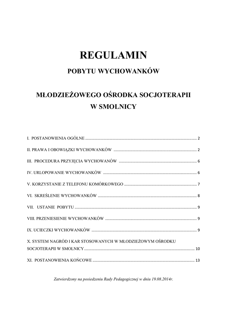 REGULAMIN POBYTU WYCHOWANKÓW MŁODZIEŻOWEGO OŚRODKA SOCJOTERAPII W SMOLNICY I. POSTANOWIENIA OGÓLNE .......................................................................................................... 2 II. PRAWA I OBOWIĄZKI WYCHOWANKÓW ............................................................................... 2 III. PROCEDURA PRZYJĘCIA WYCHOWANÓW .......................................................................... 6 IV. URLOPOWANIE WYCHOWANKÓW ......................................................................................... 6 V. KORZYSTANIE Z TELEFONU KOMÓRKOWEGO ..................................................................... 7 VI. SKREŚLENIE WYCHOWANKÓW .............................................................................................. 8 VII. USTANIE POBYTU .................................................................................................................... 9 VIII. PRZENIESIENIE WYCHOWANKÓW ....................................................................................... 9 IX. UCIECZKI WYCHOWANKÓW .................................................................................................... 9 X. SYSTEM NAGRÓD I KAR STOSOWANYCH W MŁODZIEŻOWYM OŚRODKU SOCJOTERAPII W SMOLNICY ......................................................................................................... 10 XI. POSTANOWIENIA KOŃCOWE ................................................................................................. 13 Zatwierdzony na posiedzeniu Rady Pedagogicznej w dniu 19.08.2014r. I. POSTANOWIENIA OGÓLNE Wychowankom w trakcie pobytu w Ośrodku zapewnia się w szczególności: 1) poszanowanie godności osobistej; 2) kształcenie, wychowanie i specjalistyczną pomoc w zależności od indywidualnych potrzeb, w związku z przejawami niedostosowania społecznego lub zaburzeń utrudniających funkcjonowanie społeczne zgodnie z obowiązującymi normami społecznymi i prawnymi; 3) ochronę przed przemocą fizyczną i psychiczną, wyzyskiem oraz innymi nadużyciami naruszającymi godność osobistą lub stanowiącymi zagrożenie dla zdrowia i życia; 4) dostęp do informacji o obowiązującym w Ośrodku regulaminie oraz nagrodach i środkach dyscyplinarnych; 5) informację o przebiegu procesu terapeutycznego; 6) dostęp do świadczeń zdrowotnych; 7) wyżywienie dostosowane do potrzeb rozwojowych; 8) ochronę więzi rodzinnych; 9) możliwość składania skarg, próśb i wniosków; II. PRAWA I OBOWIĄZKI WYCHOWANKÓW 1. Wychowankowie mają prawo do: 1) właściwie zorganizowanego procesu kształcenia zgodnie z zasadami pedagogiki specjalnej oraz higieny pracy umysłowej; 2) opieki wychowawczej i warunków pobytu w szkole zapewniających bezpieczeństwo, ochronę przed wszelkimi formami przemocy fizycznej bądź psychicznej oraz ochronę i poszanowanie godności; 3) szczególnie troskliwego, życzliwego i podmiotowego traktowania w procesie dydaktycznowychowawczym i terapeutycznym; 4) zgłaszania wychowawcy, Dyrektorowi Zespołu Szkół i Placówek, nauczycielom i innym pracownikom pedagogicznym swoich problemów i wątpliwości, jawnego wyrażania opinii dotyczących treści nauczania i wychowania, życia szkoły oraz uzyskiwania od nich wyjaśnień, odpowiedzi i wszelkiej możliwej pomocy; 5) poszanowania godności własnej w sprawach osobistych, rodzinnych i koleżeńskich; 6) swobody wyrażania myśli i przekonań w szczególności dotyczących życia szkoły, a także światopoglądowych i religijnych - jeśli nie narusza tym dobra innych osób; 7) sprawiedliwej, obiektywnej i jawnej oceny, ustalonych sposobów kontroli postępów w nauce; 2 8) bieżącego uczestnictwa w dokonywanej ocenie postępów w nauce i zachowaniu – samoocenie; 9) informacji o zakresie i terminie pisemnych sprawdzianów wiadomości; 10) pomocy w przypadku trudności w nauce i korzystania z poradnictwa psychologicznopedagogicznego i zawodowego; 11) odwołania się od oceny z przedmiotu nauczania bądź oceny z zachowania do dyrektora placówki; 12) reprezentowania placówki w konkursach, przeglądach, zawodach i innych imprezach, zgodnie ze swoimi możliwościami i umiejętnościami; 13) usprawiedliwionej nieobecności na zajęciach szkolnych w przypadku reprezentowania w imprezach i zawodach (uczniowi delegowanemu przez szkołę nie wpisuje się nieobecności w dzienniku lekcyjnym – zaznaczamy literą "z"). Nauczyciel/wychowawca delegujący ucznia na imprezy powinien powiadomić wychowawcę klasy dzień przed imprezą. Przy obliczaniu frekwencji "z" oznacza obecność; 14) własnej aktywności w zdobywaniu i poszerzaniu wiedzy, rozwijaniu zainteresowań, zdolności i talentów; 15) wpływania na funkcjonowanie Ośrodka poprzez działalność samorządową czynnego i biernego udziału w wyborach do samorządu klasowego i uczniowskiego; 16) odpoczynku w przerwach międzylekcyjnych (na okres przerw świątecznych oraz ferii nie zadaje się prac domowych); 17) posiadania pełnej wiedzy na temat kryteriów ocen z przedmiotów i zachowania; 18) korzystania ze wszystkich pomieszczeń, urządzeń zgodnie z ich przeznaczeniem i w myśl obowiązujących regulaminów; 19) zamieszkania w Ośrodku i całodziennego wyżywienia na zasadach określonych w odrębnych przepisach; 20) do opieki lekarskiej na zasadach określonych w odrębnych przepisach; 21) uczestniczenia w zajęciach pozalekcyjnych, kołach zainteresowań; 22) nauki i socjalizacji; 23) utrzymywania kontaktów z rodzicami (opiekunami prawnymi) i krewnymi; 24) do ochrony przed wyzyskiem ekonomicznym i seksualnym, ochrony przed poniżającym traktowaniem; 2. Uczniowie mają obowiązek przestrzegania postanowień zawartych w Statucie, a zwłaszcza: 1) w każdej sytuacji zachowania się w sposób godny młodego obywatela i ucznia szkoły; 2) systematycznego i aktywnego uczestniczenia w zajęciach lekcyjnych, pozalekcyjnych i życiu Ośrodka; 3 3) wykorzystywania w pełni czasu przeznaczoneg