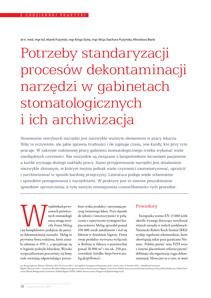 Z CODZ I E N N E J PR A K T Y K I dr n. med. mgr inż. Marek Pużyński, mgr Kinga Styka, mgr Alicja Stachura-Pużyńska, Mirosława Blank Potrzeby standaryzacji procesów dekontaminacji narzędzi w gabinetach stomatologicznych i ich archiwizacja Stosowanie sterylnych narzędzi jest niezwykle ważnym elementem w pracy lekarza. Niby to oczywiste, ale jakie sprawia trudności i ile zajmuje czasu, wie każdy, kto przy tym pracuje. W zakresie codziennej pracy gabinetu stomatologicznego trzeba wykonać wiele niezbędnych czynności. Nie wszystkie są związane z bezpośrednim leczeniem pacjentów, a każda wymaga dużego nakładu pracy. Samo przygotowanie narzędzi jest działaniem niezwykle złożonym, w którym można jednak wiele czynności zautomatyzować, uprościć i zarchiwizować w sposób bardziej przejrzysty. Literatura podaje wiele schematów i sposobów postępowania z narzędziami. W praktyce jest to zawsze poszukiwanie sposobów uproszczenia, a tym samym zmniejszenia czasochłonności tych procedur. W wędrówkach po wystawach poświeconych stomatologii naszą uwagę zwróciła firma Melag i jej kompleksowe podejście do procesu dekontaminacji narzędzi. Melag to prywatna firma rodzinna, która została założona w 1951 r., a specjalizuje się w higienie praktyki lekarskiej. Wysoko wyspecjalizowani pracownicy tej firmy stale rozwijają odpowiadające potrze1 2 bom rynku produkty i utrzymują pozycję światowego lidera. Przez dążenie do jakości i innowacyjności w połączeniu z najwyższymi wymogami bezpieczeństwa Melag sprzedał ponad 450 000 sztuk autoklawów i stał się liderem w dziedzinie higieny. Firma swoje produkty wytwarza wyłącznie w Berlinie w fabryce o powierzchni ponad 20 000 m² i ma ok. 250 pracowników (źródło: http://www.melag.de/pl/firma/). Procedury Europejska norma EN 13 060 ściśle określa wymogi dotyczące sterylizacji różnych narzędzi w małych autoklawach. Niemiecki Robert Koch Institut (RKI) wydaje regularnie rekomendacje, które obowiązują także poza granicami Niemiec. Polskie prawo1 oraz PZH wraz z innymi placówkami referencyjnymi2 definiują całą organizację ciągu dekontaminacji. Mowa jest tu o tym, że musi np. Rozporządzenie Ministra Zdrowia z dnia 26 czerwca 2012 r. (szczegółowe wymagania odm pomieszczeń), ustawa z dnia 15 kwietnia 2011 r. (działalność lecznicza). Ogólne Wytyczne 2011 r. Sterylizacji Wyrobów Medycznych opracowane przez Stowarzyszenie Higieny i Lecznictwa, Polskie Stowarzyszenie Rozwoju Sterylizacji i Dezynfekcji Medycznej, Zakład Zwalczania Skażeń Biologicznych, Państwowy Zakład Higieny (PZH), Polskie Stowarzyszenie Pielęgniarek Epidemiologicznych. 18 maj/c zer wiec 2014 być zapewniony cały ciąg technologiczny narzędzi wielokrotnego użytku. Droga mycia, dezynfekcji i sterylizacji oraz przechowania musi zapewniać ruch postępowy od narzędzia zabrudzonego do narzędzia sterylnego. Każde ogniwo tego łańcucha jest ważne, aby cała procedura dekontaminacji była skuteczna. Cały proces musi być odtwarzalny i posiadać odpowiednią dokumentację. Celem jest, aby profesjonalny standard dekontaminacji, jaki znajduje się w szpitalach, osiągnąć także w mniejszych placówkach. W zależności od potrzeb i wielkości gabinetu czy kliniki istnieją różne rozwiązania przestrzenne, przy czym najwyższe wymogi techniczne muszą być spełnione w centralnej sterylizatorni w szpitalach, gdzie sterylizatornia jest rozdzielona na trzy pomieszczenia – brudne, czyste i sterylne. Obowiązujące rozporządzenie Ministra Zdrowia dopuszcza, ale w gabinetach, ambulatoriach i nawet w szpitalach jednego dnia, ustawienie szeregowe sprzętu. Musi ono zapewniać na każdym etapie jednokierunkowy ruch postępowy od materiałów skażonych do materiałów sterylnych. Według wspomnianego rozporządzenia: „10. Sterylizatornia stanowi ciąg technologiczny obejmujący w kolejności: 1) odcinek (blat) materiałów skażonych, służący do wyładunku i przygotowania do mycia i dezynfekcji wstępnej lub zasadniczej; 2) odcinek maszynowego mycia lub ręcznego mycia i dezynfekcji obejmujący urządzenie myjąco-dezynfekcyjne lub zlew 2-komorowy; 3) odcinek (blat) materiałów czystych do przeglądania i pakietowania materiałów czystych przed sterylizacją; 4) sterylizator parowy lub niskotemperaturowy, z wyłączeniem urządzenia na tlenek etylenu; 5) odcinek (blat) materiałów sterylnych; 6) stanowisko higieny rąk zorganizowane poza blatem roboczym”. Wytyczne PZH proponują następujące rozwiązania przestrzenne: y centralna sterylizatornia (powyżej 60 jednostek wsadu3 na dobę), lokalna sterylizatornia (do 60 jednostek wsadu na dobę), y punkt sterylizacji (do 30 jednostek wsadu na dobę), y stanowisko sterylizacji gabinetowej. y Organizacja punktu sterylizacji Lokalna sterylizatornia, czyli osobne pomieszczenie, to najczęściej stosowane rozwiązanie przestrzenne w gabinetach. To osobne pomieszczenie powinno mieć minimum 8 m² i blat o długości co najmniej 4 m. Najmniejszym rozwiązaniem przestrzennym jest stanowisko sterylizacji gabinetowej, gdzie dekontaminacja ma odbywać się w miejscu udzielania świadczeń zdrowotnych. Stanowisko sterylizacji gabinetowej powinno spełniać następujące wymogi: 1 2 musi to być wydzielona część gabinetu nie mniejsza niż 4 m², zlokalizowana poza drogami komunikacji i w odległości zapewniającej swobodny dostęp do miejsca udzielania świadczeń zdrowotnych, 3 powinno zapewniać rozdział czasowy, np. dekontaminacja po ostatnim pacjencie. Zdj. 1. Organizacja punktu sterylizacji może wyglądać następująco (przykład) 3 4 Jednostka wsadu: 30 × 30 × 60 cm np. rozporządzenie Ministra Zdrowia z dnia 6 czerwca 2013 r., dyrektywy europejskie 89/391 oraz 2000/54. Patrząc osobno na każde ogniwo łańcucha procedury, jest wiele możliwości do wyboru. Pierwszym ważnym ogniwem procedury dekontaminacji narzędzi wielokrotnego użytku jest dezynfekcja or