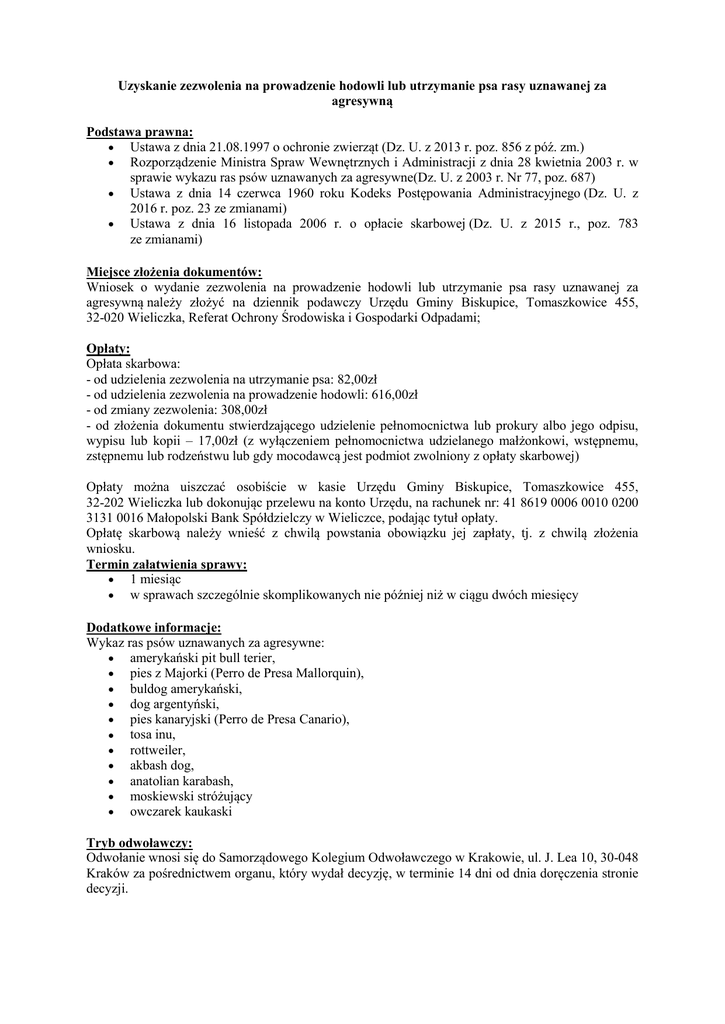 Uzyskanie zezwolenia na prowadzenie hodowli lub utrzymanie psa rasy uznawanej za agresywną Podstawa prawna: Ustawa z dnia 21.08.1997 o ochronie zwierząt (Dz. U. z 2013 r. poz. 856 z póź. zm.) Rozporządzenie Ministra Spraw Wewnętrznych i Administracji z dnia 28 kwietnia 2003 r. w sprawie wykazu ras psów uznawanych za agresywne(Dz. U. z 2003 r. Nr 77, poz. 687) Ustawa z dnia 14 czerwca 1960 roku Kodeks Postępowania Administracyjnego (Dz. U. z 2016 r. poz. 23 ze zmianami) Ustawa z dnia 16 listopada 2006 r. o opłacie skarbowej (Dz. U. z 2015 r., poz. 783 ze zmianami) Miejsce złożenia dokumentów: Wniosek o wydanie zezwolenia na prowadzenie hodowli lub utrzymanie psa rasy uznawanej za agresywną należy złożyć na dziennik podawczy Urzędu Gminy Biskupice, Tomaszkowice 455, 32-020 Wieliczka, Referat Ochrony Środowiska i Gospodarki Odpadami; Opłaty: Opłata skarbowa: - od udzielenia zezwolenia na utrzymanie psa: 82,00zł - od udzielenia zezwolenia na prowadzenie hodowli: 616,00zł - od zmiany zezwolenia: 308,00zł - od złożenia dokumentu stwierdzającego udzielenie pełnomocnictwa lub prokury albo jego odpisu, wypisu lub kopii – 17,00zł (z wyłączeniem pełnomocnictwa udzielanego małżonkowi, wstępnemu, zstępnemu lub rodzeństwu lub gdy mocodawcą jest podmiot zwolniony z opłaty skarbowej) Opłaty można uiszczać osobiście w kasie Urzędu Gminy Biskupice, Tomaszkowice 455, 32-202 Wieliczka lub dokonując przelewu na konto Urzędu, na rachunek nr: 41 8619 0006 0010 0200 3131 0016 Małopolski Bank Spółdzielczy w Wieliczce, podając tytuł opłaty. Opłatę skarbową należy wnieść z chwilą powstania obowiązku jej zapłaty, tj. z chwilą złożenia wniosku. Termin załatwienia sprawy: 1 miesiąc w sprawach szczególnie skomplikowanych nie później niż w ciągu dwóch miesięcy Dodatkowe informacje: Wykaz ras psów uznawanych za agresywne: amerykański pit bull terier, pies z Majorki (Perro de Presa Mallorquin), buldog amerykański, dog argentyński, pies kanaryjski (Perro de Presa Canario), tosa inu, rottweiler, akbash dog, anatolian karabash, moskiewski stróżujący owczarek kaukaski Tryb odwoławczy: Odwołanie wnosi się do Samorządowego Kolegium Odwoławczego w Krakowie, ul. J. Lea 10, 30-048 Kraków za pośrednictwem organu, który wydał decyzję, w terminie 14 dni od dnia doręczenia stronie decyzji.