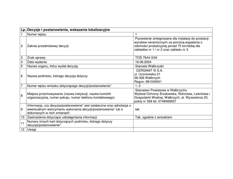 Lp. Decyzje i postanowienia, wskazania lokalizacyjne 1 Numer wpisu 2 Zakres przedmiotowy decyzji 3 4 5 Znak sprawy Data wydania Nazwa organu, który wydał decyzj 6 Nazwa podmiotu, którego decyzja dotyczy 7 Numer wpisu wniosku dotycz cego decyzji/postanowienia* 8 Miejsce przechowywania (nazwa instytucji, nazwa komórki organizacyjnej, numer pokoju, numer telefonu kontaktowego) Informacja, czy decyzja/postanowienie* jest ostateczne oraz adnotacje o ewentualnym wstrzymaniu wykonania decyzji/postanowienia* lub o dokonanych w nich zmianach 10 Zastrze enia dotycz ce udost pniania informacji Numery innych kart dotycz cych podmiotu, którego dotyczy 11 decyzja/postanowienie* 12 Uwagi 9 1 Pozwolenie zintegrowane dla instalacji do produkcji wyrobów ceramicznych za pomoc wypalania o zdolno ci produkcyjnej ponad 75 ton/dob dla zakładów nr 1 i nr 2 oraz zakładu nr 3 TO .7644-3/04 16.06.2004 Starosta Wałbrzyski CERSANIT III S.A. ul. Uczniowska 21 58-306 Wałbrzych Regon: 891040541 1, 2 Starostwo Powiatowe w Wałbrzychu Wydział Ochrony rodowiska, Rolnictwa, Le nictwa i Gospodarki Wodnej, Wałbrzych, al. Wyzwolenia 20, pokój nr 358 tel. 0748460637 tak Tak, zgodnie z wnioskiem Lp. Decyzje i postanowienia, wskazania lokalizacyjne 1 Numer wpisu 2 Zakres przedmiotowy decyzji 3 4 5 Znak sprawy Data wydania Nazwa organu, który wydał decyzj 6 Nazwa podmiotu, którego decyzja dotyczy 7 Numer wpisu wniosku dotycz cego decyzji/postanowienia* 8 Miejsce przechowywania (nazwa instytucji, nazwa komórki organizacyjnej, numer pokoju, numer telefonu kontaktowego) Informacja, czy decyzja/postanowienie* jest ostateczne oraz adnotacje o ewentualnym wstrzymaniu wykonania decyzji/postanowienia* lub o dokonanych w nich zmianach 10 Zastrze enia dotycz ce udost pniania informacji Numery innych kart dotycz cych podmiotu, którego dotyczy 11 decyzja/postanowienie* 12 Uwagi 9 2 Zmiana pozwolenia zintegrowanego dla instalacji do produkcji wyrobów ceramicznych za pomoc wypalania o zdolno ci produkcyjnej ponad 75 ton/dob dla zakładów nr 1 i nr 2 oraz zakładu nr 3 TO .7644-23/05 08.12.2005 Starosta Wałbrzyski CERSANIT III S.A. ul. Uczniowska 21 58-306 Wałbrzych Regon: 891040541 3 Starostwo Powiatowe w Wałbrzychu Wydział Ochrony rodowiska, Rolnictwa, Le nictwa i Gospodarki Wodnej, Wałbrzych, al. Wyzwolenia 20, pokój nr 358 tel. 0748460637 tak brak 1 Lp. Decyzje i postanowienia, wskazania lokalizacyjne 1 Numer wpisu 2 Zakres przedmiotowy decyzji 3 4 5 Znak sprawy Data wydania Nazwa organu, który wydał decyzj 6 Nazwa podmiotu, którego decyzja dotyczy 7 Numer wpisu wniosku dotycz cego decyzji/postanowienia* 8 Miejsce przechowywania (nazwa instytucji, nazwa komórki organizacyjnej, numer pokoju, numer telefonu kontaktowego) Informacja, czy decyzja/postanowienie* jest ostateczne oraz adnotacje o ewentualnym wstrzymaniu wykonania decyzji/postanowienia* lub o dokonanych w nich zmianach 10 Zastrze enia dotycz ce udost pniania informacji Numery innych kart dotycz cych podmiotu, którego dotyczy 11 decyzja/postanowienie* 12 Uwagi 9 3 pozwolenie na wprowadzanie pyłów i gazów do powietrza dla komory do obróbki strumieniowo – ciernej w Wałbrzychu przy ul. Wrocławskiej 16 TO .7644-20/06 07.04.2006. Starosta Wałbrzyski „JANTAR” Spółka cywilna Sławomir Łab dzki Janusz Trela ul. Wrocławska 16 58-309 Wałbrzych Regon: 891454219 4 Starostwo Powiatowe w Wałbrzychu Wydział Ochrony rodowiska, Rolnictwa, Le nictwa i Gospodarki Wodnej, Wałbrzych, al. Wyzwolenia 20, pokój nr 358 tel. 0748460637 tak brak - Lp. Decyzje i postanowienia, wskazania lokalizacyjne 1 Numer wpisu 2 Zakres przedmiotowy decyzji 3 4 5 Znak sprawy Data wydania Nazwa organu, który wydał decyzj 6 Nazwa podmiotu, którego decyzja dotyczy 7 Numer wpisu wniosku dotycz cego decyzji/postanowienia* 8 Miejsce przechowywania (nazwa instytucji, nazwa komórki organizacyjnej, numer pokoju, numer telefonu kontaktowego) Informacja, czy decyzja/postanowienie* jest ostateczne oraz adnotacje o 9 ewentualnym wstrzymaniu wykonania decyzji/postanowienia* lub o dokonanych w nich zmianach 10 Zastrze enia dotycz ce udost pniania informacji Numery innych kart dotycz cych podmiotu, którego dotyczy 11 decyzja/postanowienie* 12 Uwagi 4 pozwolenie zintegrowanego dla instalacji linii do produkcji szkła o zdolno ci produkcyjnej ponad 20 ton na dob w Wałbrzychu przy ul. Wrocławskiej 16 TO .7644-21/06 31.10.2006. Starosta Wałbrzyski Huty Szkła „GLOSS” Glonek, Glonek –Busz spółka jawna ul. Krobska Szosa 9 64-125 Poniec Regon: 411518457-00029 5 Starostwo Powiatowe w Wałbrzychu Wydział Ochrony rodowiska, Rolnictwa, Le nictwa i Gospodarki Wodnej, Wałbrzych, al. Wyzwolenia 20, pokój nr 358 tel. 0748460637 tak brak - Lp. Decyzje i postanowienia, wskazania lokalizacyjne 1 Numer wpisu 2 Zakres przedmiotowy decyzji 3 4 5 Znak sprawy Data wydania Nazwa organu, który wydał decyzj 6 Nazwa podmiotu, którego decyzja dotyczy 7 Numer wpisu wniosku dotycz cego decyzji/postanowienia* 8 Miejsce przechowywania (nazwa instytucji, nazwa komórki organizacyjnej, numer pokoju, numer telefonu kontaktowego) Informacja, czy decyzja/postanowienie* jest ostateczne oraz adnotacje o 9 ewentualnym wstrzymaniu wykonania decyzji/postanowienia* lub o dokonanych w nich zmianach 10 Zastrze enia dotycz ce udost pniania informacji Numery innych kart dotycz cych podmiotu, którego dotyczy 11 decyzja/postanowienie* 12 Uwagi 5 pozwolenie na wprowadzanie pyłów i gazów do powietrza z instalacji do produkcji bloków i płyt z pianki poliuretanowej w Głuszycy przy ul. Kłodzkiej 5 TO .7644-22/06 14.04.2006. Starosta Wałbrzyski PPHU RAFA-KO Rafał Krzy anowski ul. Kłodzka 5 58-340 Głuszyca Regon: 6 Starostwo Powiatowe w Wałbrzychu Wydział Ochrony rodowiska, Rolnictwa, Le nictwa i Gospodarki Wodnej, Wałbrzych, al. Wyzwolenia 20, pokój nr 358 tel. 0748460637 tak brak - Lp. Decyzje i postanowienia, wskazania lokalizacyjne 1 Numer wpisu 2 Zakres przedmiotowy decyzji 3 4 5 Znak sprawy Data wy