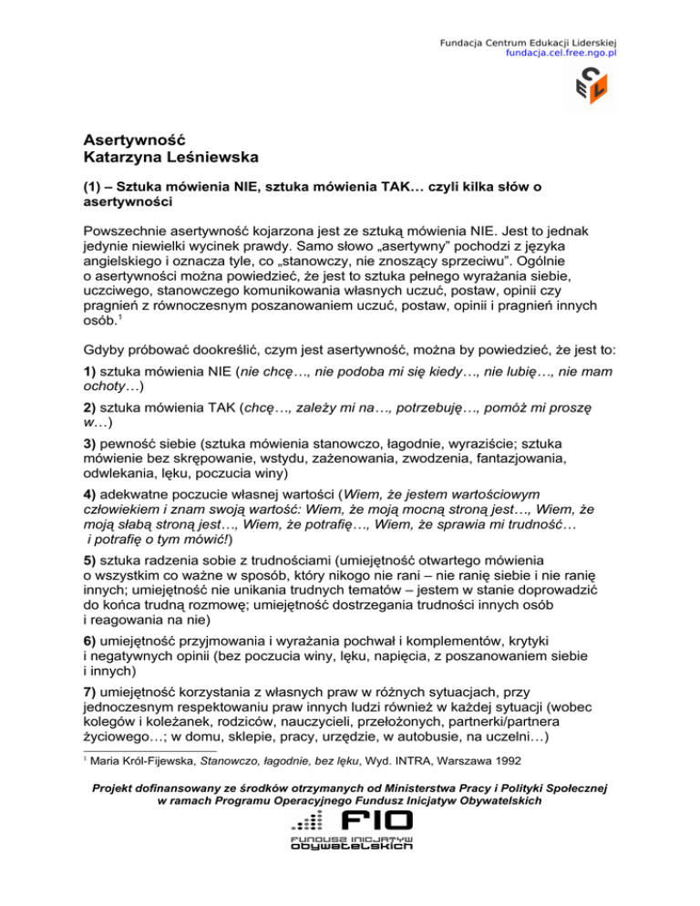 Fundacja Centrum Edukacji Liderskiej fundacja.cel.free.ngo.pl Asertywność Katarzyna Leśniewska (1) – Sztuka mówienia NIE, sztuka mówienia TAK… czyli kilka słów o asertywności Powszechnie asertywność kojarzona jest ze sztuką mówienia NIE. Jest to jednak jedynie niewielki wycinek prawdy. Samo słowo „asertywny” pochodzi z języka angielskiego i oznacza tyle, co „stanowczy, nie znoszący sprzeciwu”. Ogólnie o asertywności można powiedzieć, że jest to sztuka pełnego wyrażania siebie, uczciwego, stanowczego komunikowania własnych uczuć, postaw, opinii czy pragnień z równoczesnym poszanowaniem uczuć, postaw, opinii i pragnień innych osób.1 Gdyby próbować dookreślić, czym jest asertywność, można by powiedzieć, że jest to: 1) sztuka mówienia NIE (nie chcę…, nie podoba mi się kiedy…, nie lubię…, nie mam ochoty…) 2) sztuka mówienia TAK (chcę…, zależy mi na…, potrzebuję…, pomóż mi proszę w…) 3) pewność siebie (sztuka mówienia stanowczo, łagodnie, wyraziście; sztuka mówienie bez skrępowanie, wstydu, zażenowania, zwodzenia, fantazjowania, odwlekania, lęku, poczucia winy) 4) adekwatne poczucie własnej wartości (Wiem, że jestem wartościowym człowiekiem i znam swoją wartość: Wiem, że moją mocną stroną jest…, Wiem, że moją słabą stroną jest…, Wiem, że potrafię…, Wiem, że sprawia mi trudność… i potrafię o tym mówić!) 5) sztuka radzenia sobie z trudnościami (umiejętność otwartego mówienia o wszystkim co ważne w sposób, który nikogo nie rani – nie ranię siebie i nie ranię innych; umiejętność nie unikania trudnych tematów – jestem w stanie doprowadzić do końca trudną rozmowę; umiejętność dostrzegania trudności innych osób i reagowania na nie) 6) umiejętność przyjmowania i wyrażania pochwał i komplementów, krytyki i negatywnych opinii (bez poczucia winy, lęku, napięcia, z poszanowaniem siebie i innych) 7) umiejętność korzystania z własnych praw w różnych sytuacjach, przy jednoczesnym respektowaniu praw innych ludzi również w każdej sytuacji (wobec kolegów i koleżanek, rodziców, nauczycieli, przełożonych, partnerki/partnera życiowego…; w domu, sklepie, pracy, urzędzie, w autobusie, na uczelni…) 1 Maria Król-Fijewska, Stanowczo, łagodnie, bez lęku, Wyd. INTRA, Warszawa 1992 Projekt dofinansowany ze środków otrzymanych od Ministerstwa Pracy i Polityki Społecznej w ramach Programu Operacyjnego Fundusz Inicjatyw Obywatelskich Fundacja Centrum Edukacji Liderskiej fundacja.cel.free.ngo.pl 8) sztuka przyznawania się do błędów bez „samobiczowania” (dostrzegam własne potknięcia i błędy – nie traktuję ich jako życiowych porażek; wyciągam z nich wnioski; szukam najlepszych rozwiązań do naprawienia szkody; jestem w stanie przeprosić; moje błędy nie są przyczynkiem do utraty szacunku dla siebie i złego traktowania własnej osoby lub innych ludzi) 9) umiejętność wyrażania wszystkiego, co chcę wyrazić, z poszanowaniem godności wszystkich uczestników rozmowy z równoczesnym daniem prawa do tego samego innym osobom (wyrażanie uczuć i czasowych stanów emocjonalnych, które żywimy do innych osób; wyrażanie opinii; mówienie o postawach i wartościach; wyrażanie potrzeb). Jestem asertywny(-a) Decyduję za siebie Nie wchodzę w sytuacje, których nie chcę, a wchodzę w te, które są dla mnie ważne Nie biorę od innych tego, czego nie chcę, a staram się (za ich zgodą i/lub poprzez stanowcze domaganie) zyskać to, co jest dla mnie ważne Wiem, że nie jestem po to, aby spełniać oczekiwania innych Wiem, że inni nie są po to, żeby spełniać moje oczekiwania Podejmuję wyzwania, by potem nie żałować, że czegoś nie zrobiłem(-łam) Daję sobie i innym takie same prawa To oczywiście pewien stan idealny. Naturalną rzeczą jest to, że jako ludzie w różnych obszarach, sprawach różnie sobie radzimy. W jednych jesteśmy „wirtuozami” (np. dobrze radzę sobie z odmawianiem, gdy czegoś nie chcę) , a w innych „początkującymi grajkami” (np. trudno mi przyjąć krytyczną uwagę od mojego przełożonego – wybucham złością lub myślę, że jestem całkiem „do niczego”). Warto jednak pamiętać, że stale jesteśmy w drodze do asertywności, która prowadzi nas z jednej strony ze ścieżki agresji, a z drugiej strony ze ścieżki uległości. I od nas samych zależy, ile kroków w stronę asertywności chcemy wykonać. Projekt dofinansowany ze środków otrzymanych od Ministerstwa Pracy i Polityki Społecznej w ramach Programu Operacyjnego Fundusz Inicjatyw Obywatelskich Fundacja Centrum Edukacji Liderskiej fundacja.cel.free.ngo.pl ASERTYWNOŚĆ – mamy równe prawa INCLUDEPICTURE "http://www.freeclipart.yoyo.pl/people/thumb ULEGŁOŚĆ – przyznanie innym większych praw AGRESJA – przyznanie sobie większych praw (2) - Skąd czerpać wiedzę o tym, na czym mi zależy, by móc właściwie zareagować – czyli droga do asertywności Aby wyrazić własne zdanie, trzeba je mieć. Aby wyrazić własną opinię, trzeba ją jasno sobie sformułować. Aby wyrazić uczucia czy stany emocjonalne, trzeba zdać sobie sprawę z ich przeżywania. Aby wyrazić swoje potrzeby, trzeba je rozpoznać. Tylko jak to zrobić? Jak wyrobić sobie własne zdanie, docierać do potrzeb i wyrażać to, co się naprawdę czuje? Zacząć trzeba od tego, by zdać sobie sprawę z tego, że ja sam(-a) mam wpływ na swoje życie. Tak długo, jak żyję w przekonaniu „To ONI rządzą światem i kreują moją rzeczywistość”, nie mam szansy ruszyć z miejsca w stronę asertywnych zachowań. Tak więc pierwszym krokiem na drodze do asertywności jest zdanie sobie sprawy z tego, że „To JA jestem sternikiem okrętu własnego życia”. Ja mam wpływ na to, w jaki sposób postrzegam i przeżywam świat, w jaki sposób reaguję w różnych sytuacjach. Nikos Kazantzakis powiedział „Masz pędzel i farby, namaluj swój 