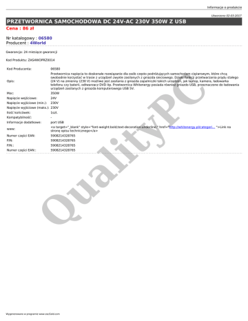 Informacje o produkcie Utworzono 02-03-2017 PRZETWORNICA SAMOCHODOWA DC 24V-AC 230V 350W Z USB Cena : 86 zł Nr katalogowy : 06580 Producent : 4World Gwarancja: 24 miesiące gwarancji Kod Produktu: ZAS4WOPRZ0014 06580 Opis: Przetwornica napięcia to doskonałe rozwiązanie dla osób często podróżujących samochodem ciężarowym, które chcą swobodnie korzystać w trasie z urządzeń zwykle zasilanych z gniazda sieciowego. Dzięki funkcji przetwarzania prądu stałego (24 V) na zmienny (230 V) możliwe jest zasilania z gniazda zapalniczki takich urządzeń, jak laptop, kamera, ładowarka telefonu czy baterii, odtwarzacz DVD itp. Przetwornica Whitenergy posiada również gniazdo USB, przeznaczone do ładowania urządzeń zasilanych z gniazda komputerowego USB 5V. Moc: 350W Napięcie wejściowe: 24V Napięcie wyjściowe (min.): 230V yP Napięcie wyjściowe (maks.): 230V C Kod Producenta: 1szt. Kompatybilność: - Informacje dodatkowe: port USB www: <a target="_blank" style="font-weight:bold;text-decoration:underline;" href="http://whitenergy.pl/categori... ">Link na stronę opisu technicznego</a> Numer części EAN: 5908214328765 P/N: 5908214328765 P/N:: 5908214328765 5908214328765 Q Numer części EAN:: ua lit Ilość końcówek: Wygenerowano w programie www.oscGold.com