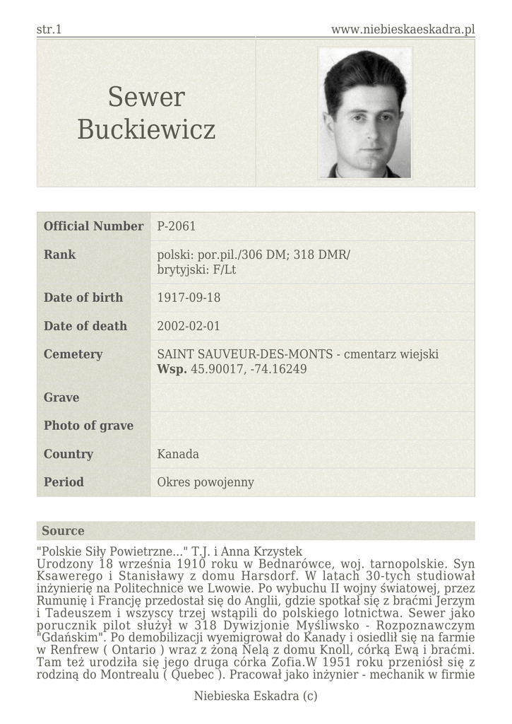 str.1 www.niebieskaeskadra.pl Sewer Buckiewicz Official Number P-2061 Rank polski: por.pil./306 DM; 318 DMR/ brytyjski: F/Lt Date of birth 1917-09-18 Date of death 2002-02-01 Cemetery SAINT SAUVEUR-DES-MONTS - cmentarz wiejski Wsp. 45.90017, -74.16249 Grave Photo of grave Country Kanada Period Okres powojenny Source "Polskie Siły Powietrzne..." T.J. i Anna Krzystek Urodzony 18 września 1910 roku w Bednarówce, woj. tarnopolskie. Syn Ksawerego i Stanisławy z domu Harsdorf. W latach 30-tych studiował inżynierię na Politechnice we Lwowie. Po wybuchu II wojny światowej, przez Rumunię i Francję przedostał się do Anglii, gdzie spotkał się z braćmi Jerzym i Tadeuszem i wszyscy trzej wstąpili do polskiego lotnictwa. Sewer jako porucznik pilot służył w 318 Dywizjonie Myśliwsko - Rozpoznawczym "Gdańskim". Po demobilizacji wyemigrował do Kanady i osiedlił się na farmie w Renfrew ( Ontario ) wraz z żoną Nelą z domu Knoll, córką Ewą i braćmi. Tam też urodziła się jego druga córka Zofia.W 1951 roku przeniósł się z rodziną do Montrealu ( Quebec ). Pracował jako inżynier - mechanik w firmie Niebieska Eskadra (c) str.2 www.niebieskaeskadra.pl Domtar Engineering. Po śmierci pierwszej żony wszedł ponownie w związek małżeński z Leonardą z Polakowskich Rzemiecką. Zmarł w Montrealu 1 lutego 2002 roku i został pochowany na cmentarzu w Saint-Sauveur-des-Monts ( Quebec ). Źródło :Polski Instytut Naukowy w Kanadzie "Polskie groby na cmentarzu w Saint-Sauveur-des-Monts". Niebieska Eskadra (c)