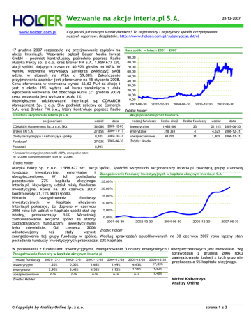 Wezwanie na akcje Interia.pl S.A. www.holder.com.pl 28-12-2007 Czy jesteś już naszym subskrybentem? To najprostszy i najszybszy sposób otrzymywania naszych raportów. Bezpłatnie. http://www.holder.com.pl/subskrypcja.shtml 17 grudnia 2007 rozpoczęło się przyjmowanie zapisów na akcje Interia.pl. Wezwanie ogłosił Bauer Media Invest GmbH - podmiot kontrolujący pośrednio poprzez Radio Muzyka Fakty Sp. z o.o. oraz Broker FM S.A. 1.959.677 szt. akcji spółki, dających prawo do 40,92% głosów na WZA. W wyniku wezwania wzywający zamierza zwiększyć swój udział w głosach na WZA o 59,08%. Zakończenie przyjmowania zapisów jest planowane na 15 stycznia 2008. Cena oferowana w wezwaniu wynosi 66,62 PLN za akcję i jest o około 19% wyższa od kursu zamknięcia z dnia ogłoszenia wezwania. Od obecnego kursu (21 grudnia 2007) cena wezwania jest wyższa o około 1%. Największymi udziałowcami Interia.pl są COMARCH Management Sp. z o.o. SKA podmiot zależny od Comarch S.A. oraz Broker FM S.A., który kontroluje poprzez Radio Struktura akcjonariatu Interia.pl S.A. Kurs spółki w latach 2001 - 2007 90,00 80,00 70,00 60,00 50,00 40,00 30,00 20,00 10,00 0,00 2001-06-30 2002-12-30 2004-06-30 2005-12-30 2007-06-30 Źródło: Holder Akcje posiadane przez fundusze udział data COMARCH Management Sp. z o.o. SKA akcjonariusz 36,08% inwestycyjne Broker FM S.A. 27,85% 2007-12-03 2004-11-15 rodzaj funduszy liczba akcji liczba funduszy udział data 1 485 006 23 21,11% 2007-06-30 Osoby zarządzające i nadzorujące spółkę 0,10% 2007-10-31 emerytalne 318 324 4 4,52% 2006-12-31 Fundusze* 27,03% 2007-06-30 ubezpieczeniowe Źródło: Holder 98 705 31 1,40% 2006-12-31 Pozostali 8,94% * fundusze inwestycyjne (stan na 06-2007), emerytalne (stan na 12-2006) i ubezpieczeniowe (stan na 12-2006) Źródło: Holder Muzyka Fakty Sp. z o.o. 1.958.677 szt. akcji spółki. Spośród wszystkich akcjonariuszy Interia.pl znaczącą grupę stanowią fundusze inwestycyjne, emerytalne i Zaangażowanie funduszy inwestycyjnych w kapitale akcyjnym Interia.pl S.A. ubezpieczeniowe. W ich posiadaniu pozostawało 27% kapitału akcyjnego 25,00% Interia.pl. Największy udział miały fundusze inwestycyjne, które na 30 czerwca 2007 20,00% kontrolowały 21,11% akcji spółki. 15,00% Historia zaangażowania funduszy inwestycyjnych w kapitale akcyjnym 10,00% Interia.pl pokazuje, że dopiero w czerwcu 5,00% 2006 roku ich udział w kapitale spółki stał się istotny, przekraczając 16%. Wcześniej 0,00% zainteresowanie akcjami spółki ze strony 2001-06-30 2002-12-30 2004-06-30 2005-12-30 2007-06-30 zarządzających funduszami inwestycyjnymi było niewielkie. Od czerwca 2006 Źródło: Holder odnotowujemy też stały wzrost zaangażowania tej grupy funduszy w spółce. Według sprawozdań opublikowanych na 30 czerwca 2007 roku łączny stan posiadania funduszy inwestycyjnych przekraczał 20% kapitału. W porównaniu z funduszami inwestycyjnymi, zaangażowanie funduszy emerytalnych i ubezpieczeniowych jest niewielkie. Wg sprawozdań z grudnia 2006 roku Zanagażowanie funduszy w kapitale akcyjnym Interia.pl zaangażowanie żadnej z tych grup nie rodzaj funduszy 2001-12-31 2002-12-31 2003-12-31 2004-12-31 2005-12-31 2006-12-31 przekraczało 5% kapitału akcyjnego. inwestycyjne emerytalne ubezpieczeniowe 1,20% 2,90% 0,00% 5,48% 2,65% 4,58% 2,49% 1,95% 4,63% 1,95% 17,83% 4,52% n/a n/a n/a n/a n/a 1,40% Źródło: Holder © Copyright by Analizy Online Sp. z o.o. Michał Kalbarczyk Analizy Online strona 1 z 2 Wezwanie na akcje Interia.pl S.A. www.holder.com.pl 28-12-2007 Czy jesteś już naszym subskrybentem? To najprostszy i najszybszy sposób otrzymywania naszych raportów. Bezpłatnie. http://www.holder.com.pl/subskrypcja.shtml Spółka Analizy Online jest niezależną firmą analityczną zajmującą się monitoringiem rynku polskich i zagranicznych instytucji zbiorowego lokowania (funduszy inwestycyjnych, emerytalnych oraz ubezpieczeniowych funduszy kapitałowych). Zakres działalności firmy obejmuje również monitoring zmian akcjonariatu polskich spółek publicznych oraz analizę rynku polskich papierów dłużnych. HOLDER jest serwisem prowadzonym przez firmę Analizy Online. Jest on dedykowany inwestorom finansowym oraz podmiotom pośredniczącym w transakcjach na rynku kapitałowym. Podstawową funkcjonalnością HOLDERA jest analiza stanu oraz zmian zachodzących w akcjonariacie polskich spółek publicznych. Niniejsze opracowanie zostało sporządzone wyłącznie w celu informacyjnym zgodnie z najlepszą wiedzą i starannością autorów. Dane wykorzystane przy tworzeniu opracowania pochodzą ze źródeł uważanych przez firmę Analizy Online Sp. z o.o. za wiarygodne i dokładne, lecz nie istnieje gwarancja, iż są one kompletne i odzwierciedlają stan faktyczny. Opinie zawarte w niniejszym opracowaniu częściowo bazują na wartościach szacunkowych, wyznaczanych zgodnie z metodologią stosowaną przez Analizy Online Sp. z o.o., które mogą odbiegać od danych rzeczywistych. Spółka Analizy Online Sp. z o.o. nie ponosi odpowiedzialności za ewentualne szkody spowodowane wykorzystaniem opinii i informacji zawartych w niniejszym opracowaniu. Niniejsze opracowanie jest przeznaczone do wyłącznego, własnego użytku Klientów spółki Analizy Online Sp. z o.o., którzy otrzymali je bezpośrednio od spółki Analizy Online Sp. z o.o. Publikowanie niniejszego opracowania w prasie, internecie i innych środkach masowego przekazu w całości bądź w części, jak również przytaczanie zawartych w nim opinii wymaga pisemnej zgody spółki Analizy Online Sp. z o.o. © Copyright by Analizy Online Sp. z o.o. strona 2 z 2