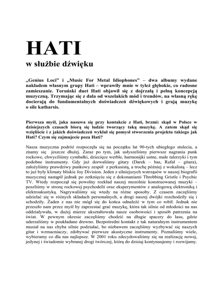 HATI w służbie dźwięku „Genius Loci” i „Music For Metal Idiophones” – dwa albumy wydane nakładem własnym grupy Hati – wprawiły mnie w tyleż głębokie, co radosne zamieszanie. Toruński duet Hati objawił się z dojrzałą i pełną koncepcją muzyczną. Trzymając się z dala od wszelakich mód i trendów, na własną rękę docierają do fundamentalnych doświadczeń dźwiękowych i grają muzykę o sile katharsis. Pierwsza myśl, jaka nasuwa się przy kontakcie z Hati, brzmi: skąd w Polsce w dzisiejszych czasach biorą się ludzie tworzący taką muzykę. A zatem skąd się wzięliście i z jakich doświadczeń wykluł się pomysł stworzenia projektu takiego jak Hati? Czym się zajmujecie poza Hati? Nasza muzyczna podróż rozpoczęła się na początku lat 90-tych ubiegłego stulecia, a znamy się jeszcze dłużej. Zaraz po tym, jak usłyszeliśmy pierwsze nagrania punk rockowe, chwyciliśmy cymbałki, dziecięce werble, harmonijki ustne, małe talerzyki i tym podobne instrumenty. Gdy już dorwaliśmy gitary (Darek – bas, Rafał – gitara), założyliśmy prawdziwy punkowy zespół z perkusistą, a trochę później z wokalistą – lecz to już były klimaty bliskie Joy Division. Jeden z silniejszych wstrząsów w naszej biografii muzycznej nastąpił jednak po zetknięciu się z dokonaniami Throbbing Gristle i Psychic TV. Wtedy rozpoczął się powolny rozkład naszej mozolnie konstruowanej muzyki – poszliśmy w stronę rockowej psychodelii oraz eksperymentów z analogową elektroniką i elektroakustyką. Nagrywaliśmy się wtedy na różne sposoby. Z czasem zaczęliśmy udzielać się w różnych składach personalnych, a drogi naszej dwójki rozchodziły się i schodziły. Żaden z nas nie mógł się do końca odnaleźć w tym co robił. Jednak nie przeszło nam przez myśl by zaprzestać grać muzykę, która tak silnie od młodości na nas oddziaływała, w dużej mierze ukształtowała nasze osobowości i sposób patrzenia na świat. W pewnym okresie zaczęliśmy chodzić na długie spacery do lasu, gdzie uderzaliśmy w poukładane drewno. Bezpośredni kontakt z tak naturalnym instrumentem musiał na nas chyba silnie podziałać, bo niebawem zaczęliśmy wyzbywać się naszych gitar i wzmacniaczy, zdobywać pierwsze akustyczne instrumenty. Poznaliśmy wiele, wybieramy co dla nas najlepsze. W 2001 roku zdecydowaliśmy się na realizację nowej, jedynej i świadomie wybranej drogi twórczej, którą do dzisiaj kontynuujemy i rozwijamy. Poza Hati Darek pracuje w sklepie dla artystów plastyków i przy konserwacji zabytków, Rafał skończył etnologię na UMK w Toruniu. Muzyka Hati przywołuje kilka skojarzeń. Projekty z kręgu Deep Listening Pauline Oliveros. „Miejski szamanizm” postindustrialnych grup, jak np. Nocturnal Emissions czy Zoviet France. I oczywiście muzyka Dalekiego Wschodu. Jak wy się odnosicie do tych muzycznych tropów? Deep Listening to dobre skojarzenie – dokonania z tego kręgu utwierdziły nas w konieczności poszukiwania miejsc o ciekawych warunkach akustycznych. Poza tym to już klasyka muzyki XX wieku, obok Partcha, Cage’a, Stockhausena, czy La Monte Younga. Nocturnal Emissions, Zoviet France i w ogóle postindustrial nie są nam już tak bliskie. Jeśli chodzi o muzykę Dalekiego Wschodu – niektóre pozaeuropejskie kultury muzyczne mają po kilka lub kilkanaście tysięcy lat i cały czas są żywe (chociaż niektóre w XX wieku nieco się zdeformowały), to znaczy, że warto je zgłębiać. Bardzo cenimy sobie muzykę pozaeuropejską – w Azji: tybetańską, koreańską, japońską, indonezyjską. Na równi z tym wspaniała jest muzyka Afryki, Karaibów (santeria, voodoo), Indian z obu Ameryk czy Australii. Cała ta muzyka powyżej wymieniona wywarła na nas duży wpływ i stała się (cały czas się staje) źródłem i bazą do budowania własnej tożsamości. Szukamy elementów wspólnych, które są niekwestionowane w muzyce Zachodu i pozaeuropejskiej. A gramy muzykę XXI wieku. Wszystkie te wspomniane tradycje – etniczną, postindustrialną i minimalistyczną – łączy w zasadzie jedna rzecz – brzmienie, określone częstotliwości dźwięku, które pojawiają się w rytualnej muzyce wielu kultur. W tradycji pojawiają się jako święte dźwięki, narzędzie transformacji, u eksperymentatorów z kręgu minimal music i elektroniki te brzmienia przeliczono na konkretne częstotliwości. Psychoaktywna siła takiej muzyki się nie zmienia, można ją jednak odnieść do tradycji mistycznych, albo manipulować nią jako zjawiskiem akustycznym – jakie podejście bliskie jest Hati? Czujemy się w pewnym sensie wydziedziczeni z wszelkich wielkich tradycji mistycznych – nie znaleźliśmy w nich jakiegoś oparcia, a próbowaliśmy je poznać. Z każdej rzeczy jednak można wyciągnąć coś dobrego dla siebie. Nie znamy odpowiedzi na ważkie pytania, na które wielu twierdzi, że zna. My zadajemy pytania – a w dużym stopniu odpowiedź znajdujemy w muzyce. Nieraz może wydawać się nam, że jesteśmy pod działaniem jakichś sił, energii, duchowości, że muzyka jest narzędziem w rękach jakiejś siły (tak jak instrumenty są narzędziami w naszych rękach do wywołania muzyki), która nas popycha do działania, ale równie dobrze można powiedzieć, że ta siła wypływa tylko z nas. Ważne, że muzyka działa pozytywnie, otrzeźwiająco, oświeca, otwiera na innych i na samego siebie. A działają tak pewne zestawienia dźwięków, których poszukiwanie jest jednym z naszych głównych zadań i manipulacji. Siła oddziaływania pewnych zjawisk akustycznych zależna jest w dużej mierze od nastawienia słuchacza czy też wydobywającego dźwięki, umiejętności skupienia, otwartości. A jak rozumiecie kwestie dronu? Czym jest dla Was dron, jakie jest jego znaczenie w muzyce Hati i co sądzicie o ogromnej ilości brzmień dronowych, które są wszechobecne w muzyce schyłku XX wieku? Jeśli chodzi o 