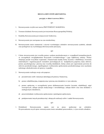 REGULAMIN STOWARZYSZENIA przyjęty w dniu 6 czerwca 2016 r. §1 1. Stowarzyszenie zwykłe nosi nazwę PRZYWRÓCIĆ MARZENIA. 2. Terenem działania Stowarzyszenia jest terytorium Rzeczypospolitej Polskiej. 3. Siedzibą Stowarzyszenia jest miejscowość Grabowiec. 4. Stowarzyszenie jest zawiązane na czas nieokreślony. 5. Stowarzyszenie może ustanawiać i używać wyróżniające członków stowarzyszenia symbole, odznaki oraz posługiwać się wyróżniającą Stowarzyszenie pieczęcią. §2 1. Celem stowarzyszenia jest wszelka pomoc osobom poszkodowanym w wypadkach komunikacyjnych, ze szczególnym uwzględnieniem Krzysztofa Lewandowskiego i jego najbliższej rodziny. Pomoc obejmuje przede wszystkim wspieranie i finansowanie każdej formy leczenia i rehabilitacji, tworzenie materialnych i organizacyjnych warunków pozwalających na kompleksową poprawę stanu zdrowia, pomoc psychologiczną i prawną oraz wszelką działalność, której celem jest zapewnienie powrotu do zdrowia poszkodowanego, zapobiegnięcie wykluczeniu społecznemu poszkodowanego oraz uzyskanie należnego odszkodowania od sprawcy wypadku. 2. Stowarzyszenie realizuje swoje cele poprzez: a) poszukiwanie osób i instytucji udzielających pomocy finansowej, b) pomoc rehabilitacyjną, terapeutyczną i prawną oraz doradztwo w tym zakresie, c) pomoc społeczną, w szczególności przez dofinansowanie kosztów leczenia, rehabilitacji, zajęć rozwojowych, zakupu sprzętu medycznego i inwalidzkiego, zakupu leków oraz inne działania o analogicznym charakterze, d) przeciwdziałanie wykluczeniu społecznemu i patologiom społecznym, e) podejmowanie innych przedsięwzięć, służących realizacji celów i zadań Stowarzyszenia. §3 1. Działalność Stowarzyszenia oparta jest na pracy społecznej jej członków. Do prowadzenia swych spraw stowarzyszenie może zatrudniać pracowników, w tym swoich członków. 2. Stowarzyszenie środki na swoją działalność uzyskuje z dotacji, ze składek członkowskich, darowizn, spadków, zapisów, dochodów z majątku stowarzyszenia oraz ofiarności publicznej. §4 1. Członkiem Stowarzyszenia może być osoba fizyczna posiadająca pełną zdolność do czynności prawnych i niepozbawiona praw publicznych, będąca obywatelem polskim lub cudzoziemcem. 2. Przyjęcia nowych członków dokonuje Zebranie Członków uchwałą podjętą w ciągu 14 dni od daty złożenia deklaracji zawierającej rekomendację dwóch członków. 3. Do obowiązków członków Stowarzyszenia należy: a) przestrzeganie Regulaminu Stowarzyszenia, b) terminowe uiszczanie składek członkowskich, c) 4. popieranie i realizowanie celów Stowarzyszenia. Członek stowarzyszenia może zostać wykluczony z ważnych przyczyn uchwałą Zebrania Członków. Za ważne przyczyny uznaje się w szczególności uchybianie obowiązkom, o którym mowa w ust. 3. §5 1. Zebranie Członków jest najwyższą władzą Stowarzyszenia, które podejmuje decyzje we wszystkich sprawach należących do zakresu działania Stowarzyszenia, o ile Regulamin nie stanowi inaczej. 2. Uchwały Zebrania Członków, o ile Regulamin nie stanowi inaczej, podejmowane są zwykłą większością głosów, w obecności co najmniej połowy członków Stowarzyszenia. 3. Stowarzyszenie reprezentuje Przedstawiciel wybierany i odwoływany kwalifikowaną większością 2/3 głosów, w obecności co najmniej połowy członków Stowarzyszenia. 4. Zebranie Członków zwołuje Przedstawiciel z własnej inicjatywy lub na wniosek co najmniej 1/3 członków Stowarzyszenia. 5. Do zakresu działania Przedstawiciela należy: a) kierowanie bieżącą działalnością Stowarzyszenia, b) wykonywanie uchwał Zebrania Członków, c) 6. reprezentowanie Stowarzyszenia i działanie w jego imieniu. Podejmowanie przez Przedstawiciela czynności przekraczających zakres zwykłego zarządu wymaga uprzedniej zgody wszystkich członków Stowarzyszenia oraz udzielenia przez nich pełnomocnictwa do dokonania tych czynności. §6 1. Rozwiązanie Stowarzyszenia następuje na podstawie uchwały Zebrania Członków podjętej kwalifikowaną większością 2/3 głosów, w obecności co najmniej połowy członków Stowarzyszenia. Uchwała określa cel, na który zostanie przeznaczony majątek zlikwidowanego Stowarzyszenia. 2. O ile uchwała w przedmiocie rozwiązania Stowarzyszenia, o której mowa w ust. 1, nie stanowi inaczej, Przedstawiciel staje się likwidatorem Stowarzyszenia. 3. Obowiązkiem likwidatora jest przeprowadzenie likwidacji w możliwie najkrótszym czasie, w sposób zabezpieczający majątek Stowarzyszenia przed nieuzasadnionym uszczupleniem oraz poinformowanie organu nadzoru o rozwiązaniu Stowarzyszenia.