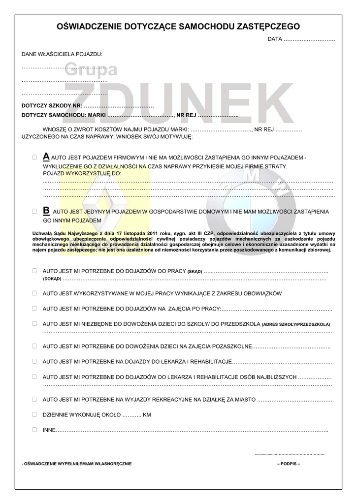 OŚWIADCZENIE DOTYCZĄCE SAMOCHODU ZASTĘPCZEGO DATA ………….……………. DANE WŁAŚCICIELA POJAZDU: ………………………………………… ………………………………………… ………………………………………… DOTYCZY SZKODY NR: ………………………………… DOTYCZY SAMOCHODU: MARKI ………………………………., NR REJ ………………….. WNOSZĘ O ZWROT KOSZTÓW NAJMU POJAZDU MARKI: ……………………………., NR REJ …………… UŻYCZONEGO NA CZAS NAPRAWY. WNIOSEK SWÓJ MOTYWUJĘ: A AUTO JEST POJAZDEM FIRMOWYM I NIE MA MOŻLIWOŚCI ZASTĄPIENIA GO INNYM POJAZADEM WYKLUCZENIE GO Z DZIAŁALNOŚCI NA CZAS NAPRAWY PRZYNIESIE MOJEJ FIRMIE STRATY. POJAZD WYKORZYSTUJĘ DO: ...…………………………………………………………………………………………………………………………………………… ………………………….………………………………………………………………………………………………………………….. ……………..……………………………………………………………………………………………………………………………….. B AUTO JEST JEDYNYM POJAZDEM W GOSPODARSTWIE DOMOWYM I NIE MAM MOŻLIWOŚCI ZASTĄPIENIA GO INNYM POJZADEM Uchwałą Sądu Najwyższego z dnia 17 listopada 2011 roku, sygn. akt III CZP, odpowiedzialność ubezpieczyciela z tytułu umowy obowiązkowego ubezpieczenia odpowiedzialności cywilnej posiadaczy pojazdów mechanicznych za uszkodzenie pojazdu mechanicznego niesłużącego do prowadzenia działalności gospodarczej obejmuje celowe i ekonomicznie uzasadnione wydatki na najem pojazdu zastępczego; nie jest ona uzależniona od niemożności korzystania przez poszkodowanego z komunikacji zbiorowej. AUTO JEST MI POTRZEBNE DO DOJAZDÓW DO PRACY (SKĄD) …..……………………………………………………….. (DOKĄD) ………………………………………………………………………………………………………………………………… AUTO JEST WYKORZYSTYWANE W MOJEJ PRACY WYNIKAJĄCE Z ZAKRESU OBOWIĄZKÓW AUTO JEST MI POTRZEBNE DO DOJAZDÓW NA ZAJĘCIA PO PRACY:…………………………………………………….. AUTO JEST MI NIEZBĘDNE DO DOWOŻENIA DZIECI DO SZKOŁY/ DO PRZEDSZKOLA (ADRES SZKOŁY/PRZEDSZKOLA) …………………………………………………………………………………………………………………………………………….. AUTO JEST MI POTRZEBNE DO DOWOŻENIA DZIECI NA ZAJĘCIA POZASZKOLNE…………………………………….. AUTO JEST MI POTRZEBNE NA DOJAZDY DO LEKARZA I REHABILITACJE……………………………………………….. AUTO JEST MI POTRZEBNE DO DOJAZDÓW DO LEKARZA I REHABILITACJE OSÓB NAJBLIŻSZYCH .……………… ……………………………….……………………………………………………………………………………………………………. AUTO JEST MI POTRZEBNE NA WYJAZDY REKREACYJNE NA DZIAŁKĘ ZA MIASTO …………………………………… DZIENNIE WYKONUJĘ OKOŁO ……….. KM INNE…………………………………………………………………………………………………………………………………….. ..................…………………………….. - OŚWIADCZENIE WYPEŁNIŁEM/AM WŁASNORĘCZNIE – PODPIS –