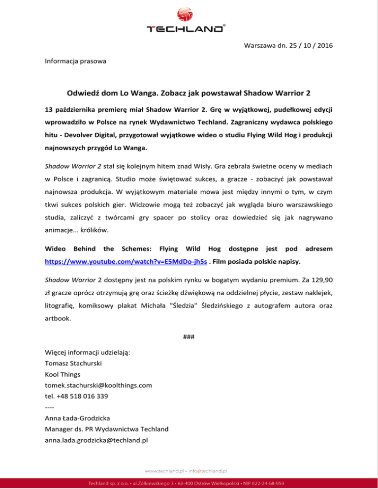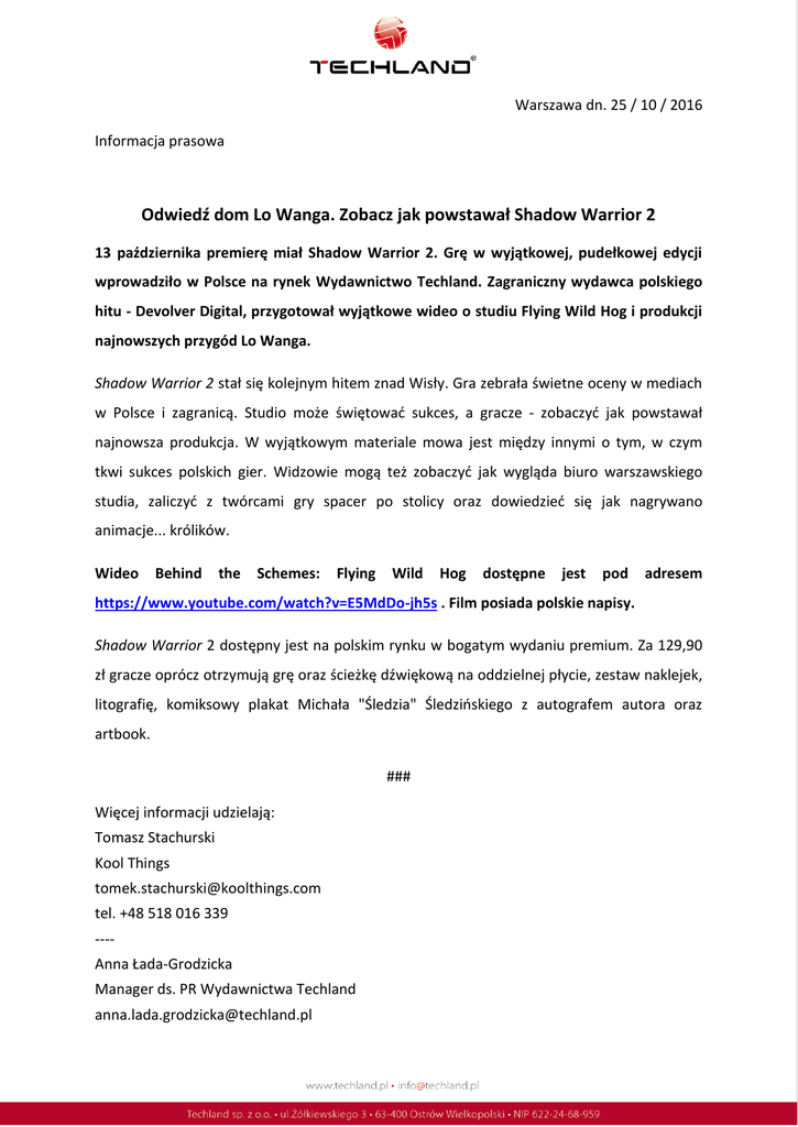 Warszawa dn. 25 / 10 / 2016 Informacja prasowa Odwiedź dom Lo Wanga. Zobacz jak powstawał Shadow Warrior 2 13 października premierę miał Shadow Warrior 2. Grę w wyjątkowej, pudełkowej edycji wprowadziło w Polsce na rynek Wydawnictwo Techland. Zagraniczny wydawca polskiego hitu - Devolver Digital, przygotował wyjątkowe wideo o studiu Flying Wild Hog i produkcji najnowszych przygód Lo Wanga. Shadow Warrior 2 stał się kolejnym hitem znad Wisły. Gra zebrała świetne oceny w mediach w Polsce i zagranicą. Studio może świętować sukces, a gracze - zobaczyć jak powstawał najnowsza produkcja. W wyjątkowym materiale mowa jest między innymi o tym, w czym tkwi sukces polskich gier. Widzowie mogą też zobaczyć jak wygląda biuro warszawskiego studia, zaliczyć z twórcami gry spacer po stolicy oraz dowiedzieć się jak nagrywano animacje... królików. Wideo Behind the Schemes: Flying Wild Hog dostępne jest pod adresem https://www.youtube.com/watch?v=E5MdDo-jh5s . Film posiada polskie napisy. Shadow Warrior 2 dostępny jest na polskim rynku w bogatym wydaniu premium. Za 129,90 zł gracze oprócz otrzymują grę oraz ścieżkę dźwiękową na oddzielnej płycie, zestaw naklejek, litografię, komiksowy plakat Michała "Śledzia" Śledzińskiego z autografem autora oraz artbook. ### Więcej informacji udzielają: Tomasz Stachurski Kool Things [email protected] tel. +48 518 016 339 ---Anna Łada-Grodzicka Manager ds. PR Wydawnictwa Techland [email protected] tel. + 48 502 533 544 *** O firmie Techland Techland to wiodący niezależny deweloper, dystrybutor i wydawca gier. Założona w roku 1991 firma znana jest przede wszystkim z takich produkcji jak Dead Island i Dead Island Riptide, seria Call of Juarez, oraz Dying Light. Dzięki wykorzystaniu autorskiej technologii Techland tworzy najwyższej klasy gry na Windows PC, PlayStation 4, Xbox One, Linux, Mac OS X, Android i iOS. Techland składa się z czterech oddziałów w Warszawie, Wrocławiu, Ostrowie Wielkopolskim oraz w kanadyjskim Vancouver. Więcej informacji na oficjalnej stronie http://techland.pl/