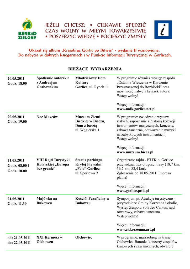 Ukazał się album „Krajobraz Gorlic po Bitwie” - wydanie II wznowione. Do nabycia w dobrych księgarniach i w Punkcie Informacji Turystycznej w Gorlicach. BIEŻĄCE WYDARZENIA 20.05.2011 Godz. 18.00 Spotkanie autorskie z Andrzejem Grabowskim Młodzieżowy Dom Kultury Gorlice, ul. Rynek 11 W programie również występ zespołu „Ostatnia Wieczerza w Karczmie Przeznaczonej do Rozbiórki” oraz możliwość nabycia książek autora. Wstęp wolny! Więcej informacji: www.mdk.gorlice.net.pl 20.05.2011 Godz. 19.00 Noc Muzeów Muzeum Ziemi Bieckiej w Bieczu, Dom z basztą ul. Węgierska 1 W programie: zwiedzanie wystaw stałych, zapoznanie z historią kolekcji instrumentów muzycznych, koncerty, zabawa taneczna, odtwarzanie muzyki na zabytkowych instrumentach. Wstęp wolny! Więcej informacji: www.muzeum.biecz.pl 21.05.2011 Godz. 08.00 i Godz. 10.00 VIII Rajd Turystyki Kolarskiej „Europa bez granic” Start z parkingu Krytej Pływalni „Fala” Gorlice, ul. Sportowa 9 Organizator rajdu - PTTK o. Gorlice przewidział trzy długości trasy (18,7 km, 36,7 km, 82,4 km). Zgłoszenia do 18.05.2011. Impreza płatna! Więcej informacji: www.gorlice.pttk.pl 21.05.2011 Godz. 11.30 Majówka na Bukowcu Kościół Parafialny w Bukowcu Sympozjum pt. Atrakcje turystyczno przyrodnicze Gminy Korzenna i okolic, Występ Zespołu Soli deo Cantus, rajd rowerowy, zabawa taneczna. Wstęp wolny! Więcej informacji: www.ckkorzenna.art.pl od: 21.05.2011 do: 22.05.2011 XXI Kermesz w Olchowcu Olchowiec W programie: marszobieg na trasie Olchowiec-Baranie, koncerty zespołów krajowych i zagranicznych, otwarcie wystaw, konkurs śpiewu, odczyt na temat ukraińskiego Obozu Pracy w Jaworznie. Wstęp wolny! Więcej informacji: www.lemkounion.republika.pl od: 21.05.2011 do: 22.05.2011 Imieniny miasta Iwonicz -Zdrój, Pl. Dietla W programie: występy zespołów muzycznych, wokalnych, tanecznych. i wiele innych atrakcji. Wstęp wolny! Więcej informacji: www.iwonicz-zdroj.pl od: 21.05.2011 do: 22.05.2011 „Pod Słońce” Festiwal Piosenki Turystycznej Bacówka na Jamnej W programie: koncerty zespołów, kiermasz turystyczno – artystyczny, wystawa fotograficzna, Rodzinny Konkurs Piosenki Turystycznej, gry i zabawy dla dzieci, niespodzianki, wycieczki, rajd turystyczny, wspólne gitarowanie przy ognisku, smaczne jedzenie. Wstęp wolny! Więcej informacji: www.podslonce.pl od: 21.05.2011 do: 22.05.2011 Majówka w Regietowie Stadnina Koni Huculskich „Gładyszów” w Regietowie W programie: pokazy, eliminacje, konkursy konne, zawody w przeciąganiu liny, koncerty zespołów, jarmark rękodzieła ludowego, pokaz kucia konia, pobyt w jaskini solnej, przejazd bryczkami i w siodle, zabawa taneczna. Wstęp płatny! Więcej informacji: www.huculy.com.pl 22.05.2011 Godz. 06.00 Słowacja-Góry Vihorlatu-Śnina Wyjazd z placu koło Szklarczykówki w Gorlicach, ul. Ogrodowa Wycieczkę organizuje Koło Miejskie Oddziału PTTK w Gorlicach. W programie wycieczki: Rezerwat przyrody, Jezioro Morskie Oko, Skały Śniński Kamień. Wstęp płatny! Więcej informacji: www.gorlice.pttk.pl 22.05.2011 Godz. 10.00 Maraton rowerowy „Cyklokarpaty” Iwonicz - Zdrój, obok placu Dietla Organizatorzy przewidzieli trzy trasy: Hobby - 20km, Mega - 46 km, Giga - 66km. Wstęp płatny! Więcej informacji: www.cyklokarpaty.pl 22.05.2011 Godz. 10.00 Przegląd artystyczny Przy Zespole Szkół w zespołów Siedliskach-Bogusz regionalnych z terenu działania Stowarzyszenia Gmin LGD „Liwocz” W programie: zabawy i konkursy dla dzieci i rodziców, występy zespołów ludowych, ogłoszenie wyników i wręczenie nagród. Wstęp wolny! Więcej informacji: www.brzostek.alpha.pl 24.05.2011 Godz. 18.00 Raffaello Moretti oraz Alexander Drozdov Galeria Sztuki „Dwór Karwacjanów” w Gorlicach, ul. Wróblewskiego 10 A Koncert fortepianowy. W części I usłyszymy utwory klasyczne: sonaty D. Scarlatti’ego, L.V. Beethovena oraz preludie F. Chopina. W części II koncertu utwory inspirowane muzyką i folklorem Hiszpanii. Wstęp wolny! Więcej informacji: www.gorlice.art.pl 27.05.2011 Godz. 11.00 27.05.2011 Godz. 18.00 28.05.2011 Godz. 10.00 i Godz. 11.00 III Iwonicki Dzień Młodych Wykonawców Muzyki Polskiej Kino Wczasowicz, Iwonicz-Zdrój, Pl. Dietla 2 Wstęp wolny! Wacław Wantuch „Akty” Ośrodek Konferencyjno Wystawienniczy „Kasztel w Szymbarku” Wernisaż wystawy fotografii. Wstęp wolny! Start i meta Deptak w Krynicy Zdroju Maraton na rowerach górskich przez tereny Beskidu Sądeckiego i Beskidu Niskiego. Trasy: Giga - 67.7 km, Mega 50.3 km, Mini - 18.6 km. Impreza płatna! MTB Marathon Więcej informacji: www.iwonicz-zdroj.pl Więcej informacji: www.gorlice.art.pl Więcej informacji: www.mtbmaraton.pl od: 28.05.2011 do: 29.05.2011 Dni Tuchowa 2011 Rynek i Amfiteart w Tuchowie W programie: II Bieg Tuchowski, koncerty zespołów młodzieżowych, plenerowa dyskoteka, występy grup tanecznych, prezentacje służb policyjnych, strażackich i ich formacji. Gościem wieczoru będzie Marcin Daniec z zespołem. Wstęp wolny! Więcej informacji: www.tuchow.pl 29.05.2011 Godz. 06.00 Wycieczka na Jastrzębicę Wyjazd Sprzed Gorlickiego Punktu Informacji, ul. Legionów 3 Organizatorem wycieczki jest Koło PTTK nr 5 o. Gorlice. Przejście trasą: Żywiec Sporysz-Jastrzębica-Świnna. Zgłoszenia do 25.05.2011. Wstęp płatny! Więcej informacji: tel. 660 981 398 29.05.2011 Godz. 10.00 VII Krośnieńska Parada Bajek Krosno, różne miejsca Gry i zabawy dla dzieci, pokazy taneczne, akademia teatralna, korowód ulicami miasta, spektakl plenerowy, przejazd ciuchcią. Wstęp wolny! Więcej informacji: www.rckp.krosno.pl 29.05.2011 Godz. 10.15 Kolej na majówkę! Parowozem przez galicyjską kolej transwersalną PKP Nowy Sącz, ul. Kolejowa 15 Trasa: Limanowa – Dobra – Kasina Wielka – Mszana Dolna – Rabka Zdrój – Chabówka. W programie: degustacje i pikniki na stacjach, występy muzyczne, zwiedzanie skansenu w Chabówce, upominki i niespodzianki. Wstę