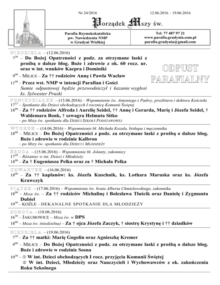 Nr 24/2016 12.06.2016 – 19.06.2016 Porządek Mszy św. Parafia Rzymskokatolicka pw. Nawiedzenia NMP w Grudyni Wielkiej Tel. 77 487 97 21 www.parafia.grudynia.com.pl [email protected] – (12.06.2016) 30 7 – Do Bożej Opatrzności z podz. za otrzymane łaski z prośbą o dalsze błog. Boże i zdrowie z ok. 60 rocz. ur. oraz w int. wnuków Kacpra i Dominiki 00 9 – MILICE – Za †† rodziców Annę i Pawła Wacław 1100 – Przez wst. NMP w intencji Parafian i Gości Sumie odpustowej będzie przewodniczył i kazanie wygłosi ks. Sylwester Pruski – (13.06.2016) – Wspomnienie św. Antoniego z Padwy, prezbitera i doktora Kościoła 1715 – Spotkanie dla Dzieci obchodzących I rocznicę Komunii Świętej 1800 – Za †† rodziców Alfreda i Aurelię Seidel, †† Annę i Gerarda, Marię i Józefa Seidel, † Waldemara Bonk, † szwagra Helmuta Sitko – po Mszy św. spotkanie dla DZIECI SZKOŁY PODSTAWOWEJ 00 18 – (14.06.2016) – Wspomnienie bł. Michała Kozala, biskupa i męczennika – MILICE – Do Bożej Opatrzności z podz. za otrzymane łaski z prośbą o dalsze błog. Boże i zdrowie w rodzinie Kalbron – po Mszy św. spotkanie dla DZIECI i MŁODZIEŻY – (15.06.2016) – Wspomnienie bł. Jolanty, zakonnicy 1730 – Różaniec w int. Dzieci i Młodzieży 1800 – Za † Eugeniusza Pelka oraz za † Michała Pelka – (16.06.2016) 00 18 – Za †† kapłanów: ks. Józefa Kuschnik, ks. Lothara Maruska oraz ks. Józefa Krawczyk 00 18 – (17.06.2016) – Wspomnienie św. brata Alberta Chmielowskiego, zakonnika – Msza św. – Za †† rodziców Michalinę i Bolesława Tłuścik oraz Danielę i Zygmunta Dubiel 1930 – KOŹLE – DEKANALNE SPOTKANIE DLA MŁODZIEŻY – (18.06.2016) 16 – JAKUBOWICE – Msza św. w DPS 30 1800 – Msza św. (niedzielna) – Za † ojca Józefa Zaczyk, † siostrę Krystynę i †† dziadków – (19.06.2016) 30 7 – Za †† matki: Marię Gogolin oraz Agnieszkę Kremer 900 – MILICE – Do Bożej Opatrzności z podz. za otrzymane łaski z prośbą o dalsze błog. Boże i zdrowie w rodzinie Sosna 1030 – W int. Dzieci obchodzących I rocz. przyjęcia Komunii Świętej W int. Dzieci, Młodzieży oraz Nauczycieli i Wychowawców z ok. zakończenia Roku Szkolnego 1. BÓG ZAPŁAĆ ks. Sylwestrowi za posługę Słowa oraz posługę Ołtarza. 2. BÓG ZAPŁAĆ za zaangażowanie w przygotowanie uroczystości odpustowej: − za przygotowanie naszej świątyni, jej obejścia, − za prace wokół plebani, − za służbę w czasie Liturgii: Ministrantom, Organistce, Scholii, tych wszystkich, którzy pełnili służbę przy sztandarach i przy baldachimie. 3. BÓG ZAPŁAĆ za zaangażowanie w przygotowanie poczęstunku dla księży. 4. BÓG ZAPŁAĆ za wszelkie za wszelkie składki pieniężne. 5. BÓG ZAPŁAĆ za zaangażowanie w przygotowanie „ciasteczek odpustowych”. Możemy je nabyć za dobrowolną ofiarę. Całkowity dochód z ich sprzedaży przeznaczony będzie na renowację relikwiarza. 6. BÓG ZAPŁAĆ rodzinom, które sprzątały kościół oraz które złożyły ofiary na dekoracje. O podjęcie się tej służby na rzecz Parafii proszę kolejne rodziny: − Ewa Gruszecka − Cecylia Marek − Anna Pata − Renata Ostrowska − Renata Dudzik 7. Dzisiaj przypada II niedziela miesiąca, czyli w najbliższy piątek i sobotę (17 i 18 czerwca) przedstawiciele RADY PARAFIALNEJ zbierać będą datki na FUNDUSZ GOSPODARCZY. BÓG ZAPŁAĆ tym rodzinom, które przekazały już ofiarę poprzez wpłatę na konto parafialne. 8. Zapowiedzi przedślubne: Helmut Mende, zam. Grudynia Wielka, Laura Jelińska, zam. Ostrożnica – zap. II 9. BÓG ZAPŁAĆ rodzinom, które przyjęły już u siebie obraz Pana Jezusa Miłosiernego.
