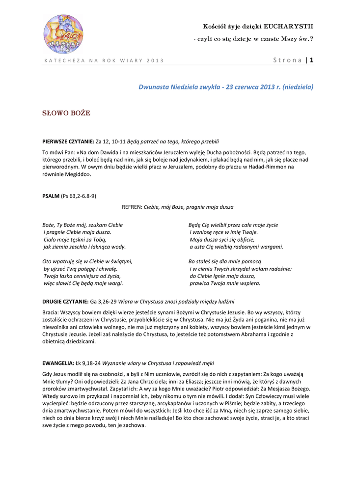 Kościół żyje dzięki EUCHARYSTII - czyli co się dzieje w czasie Mszy św.? Strona |1 KATECHEZA NA ROK WIARY 2013 Dwunasta Niedziela zwykła - 23 czerwca 2013 r. (niedziela) SŁOWO BOŻE PIERWSZE CZYTANIE: Za 12, 10-11 Będą patrzeć na tego, którego przebili To mówi Pan: «Na dom Dawida i na mieszkańców Jeruzalem wyleję Ducha pobożności. Będą patrzeć na tego, którego przebili, i boleć będą nad nim, jak się boleje nad jedynakiem, i płakać będą nad nim, jak się płacze nad pierworodnym. W owym dniu będzie wielki płacz w Jeruzalem, podobny do płaczu w Hadad-Rimmon na równinie Megiddo». PSALM (Ps 63,2-6.8-9) REFREN: Ciebie, mój Boże, pragnie moja dusza Boże, Ty Boże mój, szukam Ciebie i pragnie Ciebie moja dusza. Ciało moje tęskni za Tobą, jak ziemia zeschła i łaknąca wody. Będę Cię wielbił przez całe moje życie i wzniosę ręce w imię Twoje. Moja dusza syci się obficie, a usta Cię wielbią radosnymi wargami. Oto wpatruję się w Ciebie w świątyni, by ujrzeć Twą potęgę i chwałę. Twoja łaska cenniejsza od życia, więc sławić Cię będą moje wargi. Bo stałeś się dla mnie pomocą i w cieniu Twych skrzydeł wołam radośnie: do Ciebie lgnie moja dusza, prawica Twoja mnie wspiera. DRUGIE CZYTANIE: Ga 3,26-29 Wiara w Chrystusa znosi podziały między ludźmi Bracia: Wszyscy bowiem dzięki wierze jesteście synami Bożymi w Chrystusie Jezusie. Bo wy wszyscy, którzy zostaliście ochrzczeni w Chrystusie, przyoblekliście się w Chrystusa. Nie ma już Żyda ani poganina, nie ma już niewolnika ani człowieka wolnego, nie ma już mężczyzny ani kobiety, wszyscy bowiem jesteście kimś jednym w Chrystusie Jezusie. Jeżeli zaś należycie do Chrystusa, to jesteście też potomstwem Abrahama i zgodnie z obietnicą dziedzicami. EWANGELIA: Łk 9,18-24 Wyznanie wiary w Chrystusa i zapowiedź męki Gdy Jezus modlił się na osobności, a byli z Nim uczniowie, zwrócił się do nich z zapytaniem: Za kogo uważają Mnie tłumy? Oni odpowiedzieli: Za Jana Chrzciciela; inni za Eliasza; jeszcze inni mówią, że któryś z dawnych proroków zmartwychwstał. Zapytał ich: A wy za kogo Mnie uważacie? Piotr odpowiedział: Za Mesjasza Bożego. Wtedy surowo im przykazał i napomniał ich, żeby nikomu o tym nie mówili. I dodał: Syn Człowieczy musi wiele wycierpieć: będzie odrzucony przez starszyznę, arcykapłanów i uczonych w Piśmie; będzie zabity, a trzeciego dnia zmartwychwstanie. Potem mówił do wszystkich: Jeśli kto chce iść za Mną, niech się zaprze samego siebie, niech co dnia bierze krzyż swój i niech Mnie naśladuje! Bo kto chce zachować swoje życie, straci je, a kto straci swe życie z mego powodu, ten je zachowa. Kościół żyje dzięki EUCHARYSTII - czyli co się dzieje w czasie Mszy św.? KATECHEZA NA ROK WIARY 2013 Strona |2 HOMILIA – KATECHEZA NA TEMAT EUCHARYSTII (Liturgia Słowa) W tym pięknym dialogu z dzisiejszej Ewangelii, Jezus przeprowadził mały sondaż: „za kogo uważają Go ludzie”. Różne były odpowiedzi uczniów. Ale potem zapytał ich – „za kogo WY mnie uważacie?” Zapytał tych, którzy byli blisko Niego i Go znali, widzieli Jego czyny, bardziej może rozpoznawali w Nim Mesjasza. A oni nie potrafili odpowiedzieć. Tylko Szymon Piotr wyznaje: TY jesteś Mesjasz, Syn Boga żywego. Ty jesteś Bogiem żywym… Odważne były te słowa, wymagały dużo odwagi, ale przede wszystkim głębokiej wiary. Czy mam odwagę i wiarę, żeby przyznać się do tego, że Jezus jest dla mnie Kimś ważnym? Czy ja się z Nim liczę? Niektórzy Polacy pytają: a jaka jest statystyczna większość? Bo nie chce się zbytnio wychylać… My Polacy mamy taką wadę, że często pokornie dostosowujemy się do otoczenia, żeby tylko kogoś nie urazić moją wiarą. Żeby tylko nie wyjść na takich fanatyków religijnych. A pytanie Jezusa jest bardzo konkretne: Za kogo Ty mnie uważasz? Nie rozglądaj się na boki, pytam dzisiaj właśnie Ciebie. Powiesz, to niewygodne pytanie, albo odpowiesz tak jak zawsze – nie mam czasu się nad tym zastanawiać. Bo boisz się, że odpowiedź na to pytanie pociągnąć może za sobą potrzebę zmianę stylu życia, większe wymagania moralne. A bez tego jest wygodniej żyć. Co znaczy dla Ciebie Eucharystia? Czy wierzysz w Chrystusa, który do Ciebie mówi w czasie Mszy św.? Który staje się chlebem, by być blisko każdego z nas? Niedawno zaczęliśmy rozważania na temat tego, co się dzieje w czasie Mszy św. Na razie omówiliśmy sobie obrzędy wstępne. Pozostały nam dwie dalsze części – liturgia Słowa i liturgia Eucharystii. Dwa tygodnie temu mówiliśmy o tym, że Msza Święta rozpoczyna się od pocałunku, bo kapłan całując ołtarz wita się z kimś bliskim, z Chrystusem. Po znaku krzyża jest powitanie słowami: Pan z wami, byśmy uświadomili sobie obecność Pana Boga pośród nas. On jest obecny zawsze tam, gdzie gromadzimy się na Eucharystii, we wspólnocie, w Kościele. Odpowiadamy na to Kościół żyje dzięki EUCHARYSTII - czyli co się dzieje w czasie Mszy św.? KATECHEZA NA ROK WIARY 2013 Strona |3 pozdrowienie słowami: i z duchem twoim. Czyli tak, jakbyśmy modlili się za kapłana, to jest nasza najkrótsza modlitwa we Mszy Świętej za kapłana, a jednocześnie zachęta, żebyśmy często to robili, bo od świętości kapłanów zależy również nasza świętość. A później, jak pamiętamy akt skruchy, gdzie uświadamiamy sobie naszą grzeszność i to, że jesteśmy słabi. Następnie po tym pięknym hymnie „Chwała na wysokości Bogu” jest kolekta, w której prosimy Pana Boga o różne rzeczy. W sercu mamy zanosić modlitwy do Pana Boga, na początku tego wezwania, które kapłan wypowiada: módlmy się. Na tej modlitwie kończą się tzw. obrzędy wstępne Mszy Świętej. A teraz rozpoczyna się druga część Mszy świętej - proklamacja, czyli głoszenie Słowa Bożego. Przed soborem, zanim nastąpiła największa rewolucja w K