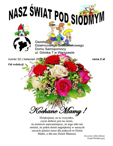Gazeta Dzielnicowego Środowiskowego Domu Samopomocy ul. Górska 7 w Warszawie numer 22 ( kwiecień 2012 r. ) cena 2 zł Od redakcji Kochane Mamy ! Dziękujemy za to wszystko, czym dobroć jest na ziemi, że jesteście najważniejsze, że tego nikt nie zmieni, że jeden dzień najpiękniej w naszych sercach jaśnieć musi dla jednych to Dzień Matki, a dla nas Dzień Mamusi. Życzymy miłej lektury Zespół Redakcyjny Zespół Redakcyjny: 1. 2. 3. 4. 5. 6. 7. Katarzyna Uszyńska (rozrywka, solenizanci i jubilaci, imiennik) Katarzyna Sałkowska (poezja i proza, przepisy kulinarne) Monika Skrodzka (wydarzenia minionego miesiąca) Rafał Musch (wywiady ) Andrzej Nowak ( wydarzenia minionego miesiąca ) Mikołaj Scholz (redakcja sportowa) Wojciech Kwil (układanie krzyżówek, przepisywanie tekstów na komputerze) Opiekun: Katarzyna Zduńska Skład i druk: Jacek Michalski SOLENIZANCI I JUBILACI W maju urodzinowe i imieninowe życzenia przyjmują: Imieniny Urodziny 09.05. – Dominika Szulc 31.05. – Marzena Zalewska 04.05. – Monika Skrodzka 13.05. – Robert Jendruczek 15.05. – Zofia Pągowska 24.05. – Joanna Klonowska 24.05. – Joanna Szczepańska Wszystkim jubilatom i solenizantom życzymy sukcesów w życiu, szczęścia w miłości, dużo uśmiechów, dużo radości, spełnienia wszystkich najskrytszych marzeń i samych przyjemnych w życiu zdarzeń. 2 WYDARZENIA MINIONEGO MIESIĄCA 18 kwiecień 2012 r. Tego dnia w naszym Ośrodku odbył się koncert. Przyjechali do nas muzycy Piotr i Łukasz ze Staromiejskiego Klubu Piosenki, który prowadzi pan Krzysztof Dudowski. Panowie grali na gitarach elektrycznych i śpiewali różne utwory: amerykańskie, angielskie, polskie. Opowiadali nam o różnych stylach muzycznych. Przywieźli ze sobą również do pokazania instrumenty muzyczne np. jajo-grzechotkę, kastaniety i instrument robiony z kokosa. Słuchaliśmy ich z wielkim zainteresowaniem. Bardzo fajnie grali. Później zagraliśmy razem. Wzięliśmy nasze instrumenty: bębny, tamburina, kołatki i graliśmy jakąś improwizowaną melodię. Piotrek i Łukasz pochwalili nas, że dobrze gramy. Wszyscy dobrze się bawiliśmy, bardzo nam się podobało to spotkanie. Na koniec podziękowaliśmy naszym gościom za wspaniały koncert i zaprosiliśmy ich, żeby znów kiedyś nas odwiedzili. Było bardzo fajnie i miło. red. Monika Skrodzka 25 kwiecień 2012 r Grupy z pracowni ceramicznej, plastycznej oraz haftu i szycia pojechały do kina w Promenadzie na film pt. „Królewna Śnieżka”. Pojechaliśmy autobusem linii 168. Film wszystkim bardzo się podobał, był bardzo zabawny. Opowiadał o dobrym Królu, złej Królowej i dobrej i pięknej królewnie Śnieżce. Zła Królowa, która była drugą żoną Króla, zamieniła go w potwora (smoka). Kazała też zabić Śnieżkę, żeby mieć całą władzę w Królestwie dla siebie. Pojawił się Książę z Królestwa Walencji i pomógł Śnieżce odzyskać Królestwo i odczarować Ojca. Na zakończenie Król wyprawił Śnieżce i Księciu wesele. Wszyscy się weselili, tańczyli i dobrze bawili. Historia zakończyła się szczęśliwie. red. Andrzej Nowak 3 Tego samego dnia grupa z pracowni stolarskiej pojechała do Powsina na ognisko. Pojechaliśmy autobusem 519 do samej pętli w Powsinie. Gdy dotarliśmy na polanę, musieliśmy uzbierać gałęzie na ognisko. Wiał bardzo silny wiatr. Później przyszli nasi koledzy i koleżanki z Ośrodka z ul. Deotymy i piekliśmy wspólnie kiełbaski przy ogniu. Później poszliśmy na spacer i wróciliśmy do Ośrodka na obiad. Było bardzo fajnie i miło. red. Monika Skrodzka 26 kwiecień 2012 r Grupa z pracowni stolarskiej poszła na spacer do Parku Arkadia przy Królikarni. Siedzieliśmy sobie na ławkach i odpoczywaliśmy na słoneczku. Przeszliśmy dookoła parku. Później poszliśmy na obiad do Ośrodka. Spacer był fajny i miły. red. Monika Skrodzka Tego samego dnia grupy z pracowni ceramicznej, plastycznej i haftu i szycia poszły na spacer do Łazienek Królewskich. Spacerowaliśmy sobie alejkami, byliśmy obok stajni, gdzie oglądaliśmy konie na wybiegu. Były bardzo przyjacielskie. Później poszliśmy dalej aż doszliśmy do ogrodzenia od strony Alej Ujazdowskich. Oglądaliśmy tam wystawę rysunków grafika ze Strasburga, Tomi Ungerera pt. „Energia”. Rysunki były bardzo zabawne. Spacer był bardzo przyjemny, pogoda piękna, oddychaliśmy świeżym powietrzem. Zmęczeni wróciliśmy do Ośrodka. Na zakończenie dnia przyszedł czas na imprezę urodzinowo-imieninową. Świętowaliśmy urodziny Asi Szczepańskiej oraz imieniny Marka Iżykowskiego i Marzeny Zalewskiej. Było bardzo miło. red. Andrzej Nowak 27 kwiecień 2012 r Korzystając z pięknej, pogody grupy z pracowni ceramicznej, plastycznej oraz haftu i szycia pojechały na spacer nad Jeziorko Czerniakowskie. Było bardzo przyjemnie, świeciło słońce, po jeziorku pływały kaczki i łabędź, ptaszki śpiewały. Bawiliśmy się w mini podchody. Część osób z panią Kasią schowała się, a reszta z p. Danusią i p. Agnieszką szukali tych osób. Było bardzo fajnie i zabawnie. red. Katarzyna Uszyńska 4 NASZE PRACE Obrazek „Dzień i noc” wykonany fastrygą przez Joannę Klonowską w pracowni haftu i szycia Donica wykonana przez Tomasz Gniatkowskiego w pracowni ceramicznej Praca zbiorowa wykonana w pracowni plastycznej 5 POEZJA I PROZA „Opowiem Ci Mamo…” Znowu rozmawiam z Tobą ciszą. Jakoś tak tyle tego we mnie zbiera się dzisiaj pod powieką. Choć zawsze chciałaś żeby dzielnie, otwierać każdy dzień uśmiechem. Nawet te trudne, załzawione. Mieć ciepłe dłonie na pociechę, we wszystkim znaleźć dobrą stronę. Ale to trudne uwierz mamo, garb optymizmu nieść przez życie, gdy szczęście znaczy nie to samo, a z codzienności smak już wyciekł. Znowu zapalę światło świecy. Ogrzeje trochę moje dłonie. Jeszcze Ci tyle ważnych rzeczy opowiem, zanim zgaśnie płomień…. autor Zosia Maria Pą