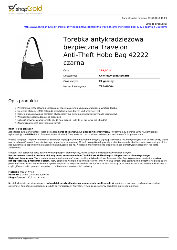 Dane aktualne na dzień: 02-03-2017 17:03 Link do produktu: http://www.antybandyta.pl/torebka-antykradziezowa-bezpieczna-travelon-anti-theft-hobo-bag-42222-czarna-p-380.html Torebka antykradzieżowa bezpieczna Travelon Anti-Theft Hobo Bag 42222 czarna Cena 199,00 zł Dostępność Chwilowy brak towaru Czas wysyłki 24 godziny Numer katalogowy TRA-00004 Opis produktu Przestronna część główna z kieszeniami zapewniającymi doskonałą organizację wnętrza torebki kieszenie blokujące RFID (blokada przed złodziejami danych kart kredytowych) Część główna zamykana zamkiem błyskawicznym z system antykradzieżowym a'la karabińczyk Wzmocniony pasek odporny na przecięcia Łatwość przymocowania torebki np. do nogi krzesła - nikt Ci jej tak łatwo nie ukradnie Zewnętrzna kieszeń zamykana na zamek RFID - co to takiego? Zabezpiecz swoją prywatność! Jeżeli posiadasz kartę zbliżeniową lub paszport biometryczny (wydany po 28 sierpnia 2006 r.), pamiętaj że wykorzystują one RFID (Radio Frequency Identification). Taką kartę lub paszport bardzo łatwo jest zeskanować i skopiować dane. Według Wikipedii: "Kopiowanie danych zawartych w paszporcie biometrycznym odbywa się bezprzewodowo i w praktyce wystarczy, że ktoś zbliży się do nas na odległość nawet 2 metrów (zazwyczaj potrzeba co najmniej 20 cm) - wszystko odbywa się w ułamku sekundy - każda osoba przechodząca blisko nas dysponująca odpowiednim urządzeniem znajdującym się np. w kieszeni marynarki może skopiować nasz biometryczny paszport." lub kartę zbliżeniową. Dlatego, jeśli posiadasz karty zbliżeniowe lub paszport biometryczny, warto zadbać o bezpieczeństwo swoich danych. Prezentowana torebka posiada blokadę przed zeskanowaniem Twoich kart zbliżeniowych lub paszportu biometrycznego. Stylowa i bezpieczna. Tak w dwóch słowach można nazwać nową torebkę antykradzieżową Travelon Hobo Bag. Wyposażona ona jest w system zabezpieczający przed przecięciem, który polega na wszyciu plecionki ze stalowej linki w korpus torebki oraz stalowej linki odpornej na przecięcia w pasek na ramię. Zamki wyposażone w system antykradzieżowy a'la karabińczyk z powodzeniem ostudzą zapał kieszonkowca lub złodzieja. Przestronna część główna torebki pomieści wszystko, co kobieta musi zawsze mieć pod ręką. Materiał: 900 D. Nylon Rozmiar: 31 cm x 25,4 cm x 8,89 cm Długość paska: 30,5 cm - 61 cm Na atak złodzieja lub kieszonkowca najbardziej narażeni jesteśmy w miejscach publicznych. W poniższych miejscach zachowaj szczególną ostrożność. Pamiętaj, że posiadając produkt antykradzieżowy Travelon, ryzyko że zostaniemy okradzeni maleje do minimum. wygenerowano w programie shopGold Jesteśmy wyłącznym importerem Travelon® na Polskę. Travelon® istnieje na rynku amerykańskim już ponad 30 lat. Na początku firma produkowała wózki bagażowe, a teraz jest wiodącym producentem akcesoriów turystycznych, w tym bezpiecznych, antykradzieżowych plecaków, torebek i portfeli. W ofercie firmy znajduje się ponad 400 produktów. Misją firmy jest dostarczanie produktów ułatwiających podróżowanie oraz czyniących je bezpieczniejszym. Produkt posiada dodatkowe opcje: kolor: czarny , księżycowy wygenerowano w programie shopGold Powered by TCPDF (www.tcpdf.org)
