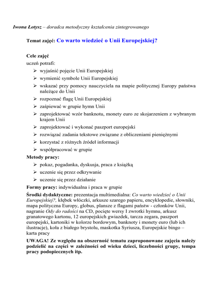 Iwona Łotysz – doradca metodyczny kształcenia zintegrowanego Temat zajęć: Co warto wiedzieć o Unii Europejskiej? Cele zajęć uczeń potrafi: wyjaśnić pojęcie Unii Europejskiej wymienić symbole Unii Europejskiej wskazać przy pomocy nauczyciela na mapie politycznej Europy państwa naleŜące do Unii rozpoznać flagę Unii Europejskiej zaśpiewać w grupie hymn Unii zaprojektować wzór banknotu, monety euro ze skojarzeniem z wybranym krajem Unii zaprojektować i wykonać paszport europejski rozwiązać zadania tekstowe związane z obliczeniami pienięŜnymi korzystać z róŜnych źródeł informacji współpracować w grupie Metody pracy: pokaz, pogadanka, dyskusja, praca z ksiąŜką uczenie się przez odkrywanie uczenie się przez działanie Formy pracy: indywidualna i praca w grupie Środki dydaktyczne: prezentacja multimedialna: Co warto wiedzieć o Unii Europejskiej?, kłębek włóczki, arkusze szarego papieru, encyklopedie, słowniki, mapa polityczna Europy, globus, plansze z flagami państw - członków Unii, nagranie Ody do radości na CD, pocięte wersy I zwrotki hymnu, arkusz granatowego kartonu, 12 europejskich gwiazdek, tarcza zegara, paszport europejski, kartoniki w kolorze bordowym, banknoty i monety euro (lub ich ilustracje), koła z białego brystolu, maskotka Syriusza, Europejskie bingo – karta pracy UWAGA! Ze względu na obszerność tematu zaproponowane zajęcia naleŜy podzielić na części w zaleŜności od wieku dzieci, liczebności grupy, tempa pracy podopiecznych itp. 1. POWITANIE Uczniowie wraz z prowadzącym zajęcia stoją w kole i rzucają do siebie kłębkiem włóczki – tworząc pajączka – wymieniając przy tym imię osoby. Kiedy zostanie utworzona sieć, dzieci odpowiadają na pytanie: Co nas ze sobą łączy? – nić koleŜeństwa, przynaleŜność do klasy szkolnej, przyjaźni... . Sieć naleŜy ostroŜnie odłoŜyć na wcześniej przygotowany szary papier i przykleić. 2. POJĘCIE „UNIA” I „UNIA EUROPEJSKA” Ćwiczenie 1. Dzieci tworzą 3-4 osobowe zespoły, a następnie z encyklopedii i słowników języka polskiego wyszukują definicję słowa „unia”. Po wykonaniu zadania kaŜda grupa głośno odczytuje znalezioną informację. W celu uporządkowania wyszukanych wiadomości nauczyciel prezentuje definicję (prezentacja multimedialna Co warto wiedzieć o UE?) i wyjaśnia trudne do zrozumienia dla dzieci wyrazy. Porównanie Unii do grupy klasowej, w której wzajemne relacje opierają się na sympatii i przyjaźni, wszyscy znają i przestrzegają określonych zasad, wspólnie podejmują decyzje dotyczące spraw grupy, współpracują ze sobą i pomagają sobie, czynnie uczestniczą w Ŝyciu grupy, maja wspólną nazwę. Ćwiczenie 2. Nauczyciel wiesza mapę polityczną Europy. Rozdaje uczniom kartki z wyrysowaną w rogu mini flagą i wypisaną nazwą państwa. Na pozostałej części kartki dzieci rysują sceny z codziennego Ŝycia, swoje marzenia – to co naprawdę buduje Zjednoczoną Europę. Następnie uczeń stara się z pomocą nauczyciela odnaleźć kraj na mapie i przypiąć kartkę z flagą na jego terytorium. 3. HYMN EUROPEJSKI Ćwiczenie 1. Uczniowie w grupach otrzymują tekst hymnu, czytają go i analizują jego treść. Liczą, ile razy w tekście występuje słowo (z wszelkimi odmianami) brat, radość, miłość. Ćwiczenie 2. Uczniowie w grupach otrzymują pocięte wersy I zwrotki hymnu. Następnie układają je w prawidłowej kolejności. Ćwiczenie 3.Pod kierunkiem nauczyciela wspólnie śpiewają, przyjmując właściwą postawę. 4. FLAGA UNII EUROPEJSKIEJ Ćwiczenie 1. Nauczyciel przygotowuje dwanaście gwiazd. Uczniowie szukają i zapisują na gwiazdach skojarzenia: co do kolorów flagi (np. lazurowe morze, niebo, szafiry, kolor tęczy, błękitną planetę) i liczby gwiazdek na fladze (np. 12 miesięcy, 12 godzin na zegarze 12 znaków zodiaku, tuzin, 12 apostołów) Uczniowie umieszczają gwiazdki na tarczy zegarowej i przyklejają na granatowe tło. Ćwiczenie 2. Uczniowie próbują w oparciu o własne informacje wyjaśnić wygląd flagi UE. Następnie nauczyciel wyświetla prezentację i opowiada o unijnej fladze. 5. PASZPORT EUROPEJSKI Nauczyciel prezentuje paszport europejski. Omawia jego zawartość. Opowiada historię powstania tego symbolu europejskiego. Ćwiczenie 1. KaŜdy uczeń samodzielnie wykonuje polski wzór paszportu, na przygotowanych wcześniej kartonikach, w kolorze burgundzkiego wina. Następnie wklejają do środka swoje zdjęcie i wpisują w odpowiednie rubryki następujące dane: • Imię i nazwisko • Adres zamieszkania • Narodowość • Obywatelstwo • Stan cywilny • Własnoręczny podpis 6. WALUTA EURO Nauczyciel prezentuje monety euro lub ich wzory – wyjaśnia pochodzenie znaku graficznego euro. Ćwiczenie 1. Nauczyciel przygotowuje pewną ilość kół wyciętych z białego brystolu. KaŜdy uczeń z jednej strony przygotowanej „monety” rysuje wspólny dla całej Unii awers, na rewersie zaś, co kojarzy mu się z jednym z europejskich krajów (np. wieŜa Eiffla – moneta francuska, Krecik – moneta czeska, pizza – moneta włoska, Smerfy – moneta belgijska itp.). Po zakończeniu rysowania dzieci mogą przedstawić reszcie klasy swoją pracę, by ta mogła zgadnąć jej „pochodzenie”. Ćwiczenie 1. Rozwiązywanie zadań tekstowych: a) b) Zosia ma 42 euro, a jej siostra o 20 euro mniej. Ile euro ma siostra Zosi? Ile euro mają razem? c) Jedno euro w kantorze kosztuje 4zł. Ile będzie kosztować 30 euro? 7. MASKOTKA UE – SYRIUSZ Nauczyciel prezentuje symbol Unii Europejskiej – maskotkę Syriusza. Ćwiczenie 1. Nauczyciel ogłasza konkurs grupowy Pt.: „Polska maskotka unijna”. Po wykonaniu następuje prezentacja na forum i wspólne oglądanie propozycji grup, a liderzy udzielają dodatkowych wyjaśnień. 8. ZAKOŃCZENIE Europejskie bingo – wersja zmodyfikowana W trakcie trwania melodii dzieci swobodnie poruszają się po sali i odszukują osoby