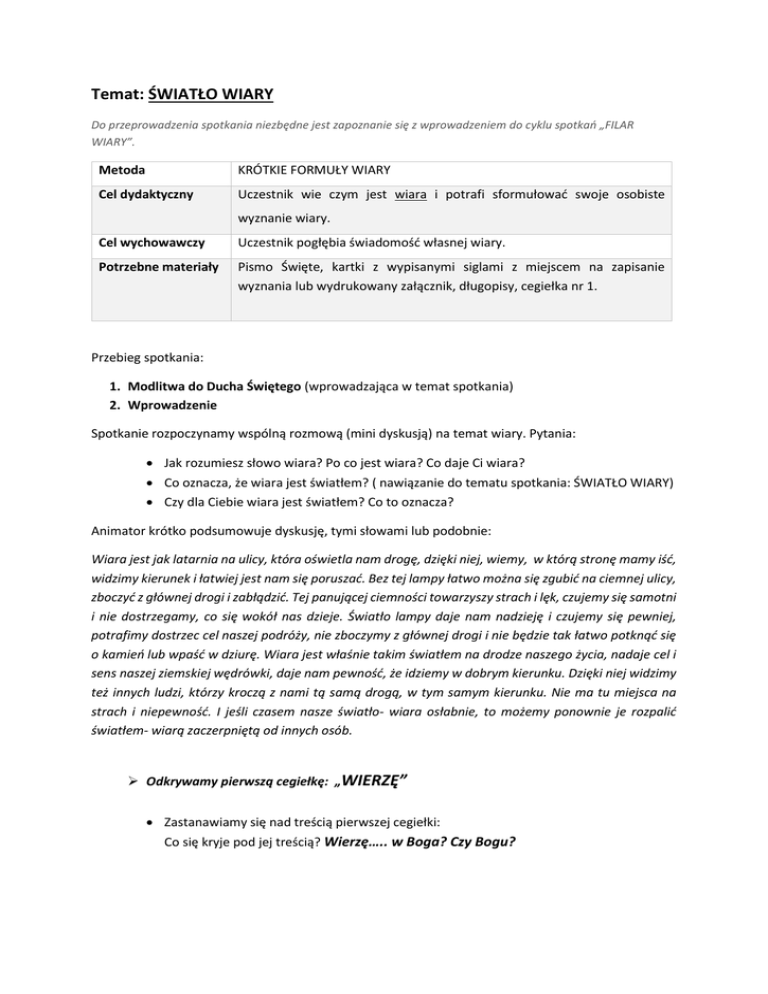 Temat: ŚWIATŁO WIARY Do przeprowadzenia spotkania niezbędne jest zapoznanie się z wprowadzeniem do cyklu spotkań „FILAR WIARY”. Metoda KRÓTKIE FORMUŁY WIARY Cel dydaktyczny Uczestnik wie czym jest wiara i potrafi sformułować swoje osobiste wyznanie wiary. Cel wychowawczy Uczestnik pogłębia świadomość własnej wiary. Potrzebne materiały Pismo Święte, kartki z wypisanymi siglami z miejscem na zapisanie wyznania lub wydrukowany załącznik, długopisy, cegiełka nr 1. Przebieg spotkania: 1. Modlitwa do Ducha Świętego (wprowadzająca w temat spotkania) 2. Wprowadzenie Spotkanie rozpoczynamy wspólną rozmową (mini dyskusją) na temat wiary. Pytania: Jak rozumiesz słowo wiara? Po co jest wiara? Co daje Ci wiara? Co oznacza, że wiara jest światłem? ( nawiązanie do tematu spotkania: ŚWIATŁO WIARY) Czy dla Ciebie wiara jest światłem? Co to oznacza? Animator krótko podsumowuje dyskusję, tymi słowami lub podobnie: Wiara jest jak latarnia na ulicy, która oświetla nam drogę, dzięki niej, wiemy, w którą stronę mamy iść, widzimy kierunek i łatwiej jest nam się poruszać. Bez tej lampy łatwo można się zgubić na ciemnej ulicy, zboczyć z głównej drogi i zabłądzić. Tej panującej ciemności towarzyszy strach i lęk, czujemy się samotni i nie dostrzegamy, co się wokół nas dzieje. Światło lampy daje nam nadzieję i czujemy się pewniej, potrafimy dostrzec cel naszej podróży, nie zboczymy z głównej drogi i nie będzie tak łatwo potknąć się o kamień lub wpaść w dziurę. Wiara jest właśnie takim światłem na drodze naszego życia, nadaje cel i sens naszej ziemskiej wędrówki, daje nam pewność, że idziemy w dobrym kierunku. Dzięki niej widzimy też innych ludzi, którzy kroczą z nami tą samą drogą, w tym samym kierunku. Nie ma tu miejsca na strach i niepewność. I jeśli czasem nasze światło- wiara osłabnie, to możemy ponownie je rozpalić światłem- wiarą zaczerpniętą od innych osób. Odkrywamy pierwszą cegiełkę: „WIERZĘ” Zastanawiamy się nad treścią pierwszej cegiełki: Co się kryje pod jej treścią? Wierzę….. w Boga? Czy Bogu? Podsumowanie: Te dwa pytania powinny się w naszej wierze uzupełniać. Nie możemy powiedzieć, że wierzymy w Boga, ale nie wierzymy Bogu. Wiara w Boga łączy się z ufnością i całkowitym poddaniem Jego woli. Wierzę Bogu, to znaczy ufam Mu, to oznacza chęć całkowitego poddania się Jego woli w moim życiu, Wierzę w Boga (w Jego istnienie i obecność) i wierzę Bogu (wierzę w Jego działanie w moim życiu i chęć prowadzenia mnie Jego drogami). Czym się różni wiara od wiedzy? Czy wierzymy w to co wiemy? -> wiara to nie tylko wiedza! „Wierzyć to znaczy ufać kiedy cudów nie ma” /ks. Jan Twardowski/ „ Wiara to ciągłe szukanie, ciągłe wątpliwości, wiara nie oznacza kamiennego spokoju, braku rozdarcia. W tym także jest podobna do miłości.” /ks. Jan Twardowski/ (Cytaty mogą pojawić się na wcześniej przygotowanych przez animatora kartkach.) 3. Wyjaśnienie metody krótkie formuły wiary: Metoda polega na stworzeniu swojego osobistego wyznania wiary na podstawie fragmentów z Pisma Świętego. Animator rozdaje uczestnikom wcześniej przygotowane kartki (format A5), na których wypisane są sigla biblijne. Uczestnicy rozważając w ciszy wybrane fragmenty wypisują na kartce to, co jest dla nich najważniejsze. Wypisują słowa bądź pojęcia, którymi można by było scharakteryzować myśl, o którą chodzi. Zebrane słowa, myśli porządkują w całość. Następnie każdy osobiście układa swoje wyznanie wiary, które powinno zaczynać się od słów: „Wierzę..”, „Wyznaję…”, „Ufam…”. Powinno być ono oparte na słowach i cytatach zaczerpniętych tylko z fragmentów Pisma Świętego, połączonych spójnikami tak, aby było ono poprawne stylistycznie. Wyznania wiary wykorzystujemy jako modlitwę lub na zakończenie spotkania odczytujemy te wyznania jako owoce naszej pracy. Fragmenty do naszego wyznania wiary: Łk 9, 18-22 (ten fragment jedna osoba odczytuje na głos, kolejne już rozważamy osobiście) J 12, 44-50 J 8, 12 2Sm 22, 26-32 J 10, 10-11. 14-17 J 14, 6 Uwagi: Czas na pracę z tekstem i ułożenie swojego wyznania wiary: ok 15-20min. Warto ustalić jakiś znak, dzięki któremu będziemy wiedzieć, że wszyscy są już gotowi, może to być na przykład odłożenie długopisu, lub zamknięcie Pisma Świętego. 4. Postanowienie Ustalamy postanowienie (indywidualne lub wspólne, które grupa zapisuje na wcześniej przygotowanych przez animatora małych karteczkach). Propozycja postanowienia: Codzienna modlitwa moim, stworzonym na dzisiejszym spotkaniu, wyznaniem wiary. 5. Modlitwa na zakończenie Jako modlitwę zachęcamy, aby każdy uczestnik przeczytał swoje wyznanie wiary, które kończymy słowem: AMEN. Załączniki: 1. Fragmenty z Pisma Świętego Łk 9, 18-22 Gdy raz modlił się na osobności, a byli z Nim uczniowie, zwrócił się do nich z zapytaniem: «Za kogo uważają Mnie tłumy?» Oni odpowiedzieli: «Za Jana Chrzciciela; inni za Eliasza; jeszcze inni mówią, że któryś z dawnych proroków zmartwychwstał». Zapytał ich: «A wy za kogo Mnie uważacie?» Piotr odpowiedział: «Za Mesjasza Bożego». Wtedy surowo im przykazał i napomniał ich, żeby nikomu o tym nie mówili. I dodał: «Syn Człowieczy musi wiele wycierpieć: będzie odrzucony przez starszyznę, arcykapłanów i uczonych w Piśmie; będzie zabity, a trzeciego dnia zmartwychwstanie». J 12, 44-50 Jezus zaś tak wołał: «Ten, kto we Mnie wierzy, wierzy nie we Mnie, lecz w Tego, który Mnie posłał. A kto Mnie widzi, widzi Tego, który Mnie posłał. Ja przyszedłem na świat jako światło, aby każdy, kto we Mnie wierzy, nie pozostawał w ciemności. A jeżeli ktoś posłyszy słowa moje, ale ich nie zachowa, to Ja go nie sądzę. Nie przyszedłem bowiem po to, aby świat sądzić, ale aby świat zbawić. Kto gardzi Mną i nie prz