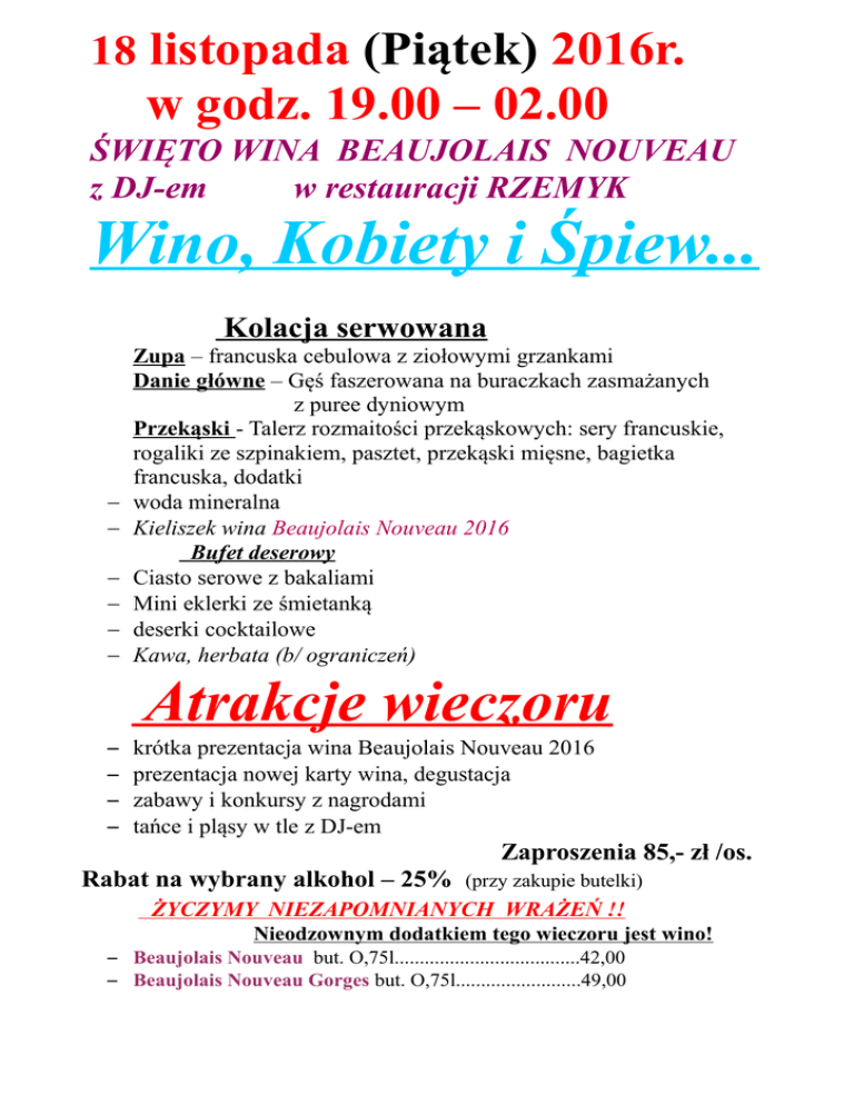 18 listopada (Piątek) 2016r. w godz. 19.00 – 02.00 ŚWIĘTO WINA BEAUJOLAIS NOUVEAU z DJ-em w restauracji RZEMYK Wino, Kobiety i Śpiew... Kolacja serwowana − − − − − − Zupa – francuska cebulowa z ziołowymi grzankami Danie główne – Gęś faszerowana na buraczkach zasmażanych z puree dyniowym Przekąski - Talerz rozmaitości przekąskowych: sery francuskie, rogaliki ze szpinakiem, pasztet, przekąski mięsne, bagietka francuska, dodatki woda mineralna Kieliszek wina Beaujolais Nouveau 2016 Bufet deserowy Ciasto serowe z bakaliami Mini eklerki ze śmietanką deserki cocktailowe Kawa, herbata (b/ ograniczeń) Atrakcje wieczoru – – – – krótka prezentacja wina Beaujolais Nouveau 2016 prezentacja nowej karty wina, degustacja zabawy i konkursy z nagrodami tańce i pląsy w tle z DJ-em Zaproszenia 85,- zł /os. Rabat na wybrany alkohol – 25% (przy zakupie butelki) ŻYCZYMY NIEZAPOMNIANYCH WRAŻEŃ !! Nieodzownym dodatkiem tego wieczoru jest wino! – Beaujolais Nouveau but. O,75l.....................................42,00 – Beaujolais Nouveau Gorges but. O,75l.........................49,00