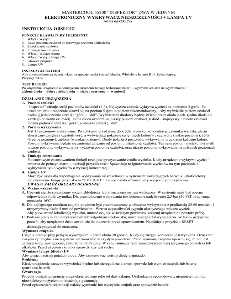 MASTERCOOL 55200 “INSPEKTOR” DWA W JEDNYM ELEKTRONICZNY WYKRYWACZ NIESZCZELNOŚCI + LAMPA UV NOWA GENERACJA INSTRUKCJA OBSŁUGI FUNKCJE KLAWIATURY I ELEMENTY 1. Włącz / Wyłącz 2. Reset poziomu czułości do zerowego poziomu odniesienia 3. Zwiększanie czułości 4. Zmniejszanie czułości 5. Włącz / Wyłącz Alarm 6. Włącz / Wyłącz lampę UV 7. Głowica czujnika 8. Lampa UV INSTALACJA BATERII Aby otworzyć komorę odkręć wkręt na spodzie rączki i odsuń klapkę. Włóż dwie baterie R14. Załóż klapkę. Przykręć wkręt. TEST BATERII Po włączeniu, urządzenie automatycznie uruchomi funkcję testowania baterii i wyświetli ich stan na wyświetlaczu : zielona dioda – dobre ; żółta dioda – słabe ; czerwona – wymienić DZIAŁANIE URZĄDZENIA 1. Poziom czułości “Inspektor” oferuje sześć poziomów czułości (1-6). Najwyższa czułość wykrywa wycieki na poziomie 3 g/rok. Po uruchomieniu urządzenie ustawi się na poziom 5 (jest to poziom rekomendowany). Aby wyświetlić poziom czułości naciśnij jednocześnie strzałki “góra” i “dół”. Wyświetlacz diodowy będzie świecił przez około 2 sek. (jedna dioda dla każdego poziomu czułości). Jedna dioda oznacza najniższy poziom czułości, 6 diód – najwyższy. Poziom czułości można podnosić strzałką “góra”, a obniżać strzałką “dół”. 2. Poziom wykrywania Jest 15 poziomów wykrywania. Po zbliżeniu urządzenia do źródła wycieku, koncentracja czynnika wzrasta, alarm akustyczny zwiększa częstotliwość, a wyświetlacz pokazuje serię trzech kolorów : czerwony (niskie poziomy), żółty (średnie poziomy), zielony (wysokie poziomy). Diody pokażą 5 poziomów wykrywania w zakresie każdego koloru. Poziom wykrywania będzie się zmieniał zależnie od poziomu ustawionej czułości. Ten sam poziom wycieku wyświetli wyższe poziomy wykrywania na wyższym poziomie czułości, oraz niższe poziomy wykrywania na niższych poziomach czułości. 3. Funkcja resetowania Podstawowym zastosowaniem funkcji reset jest sprecyzowanie źródła wycieku. Kiedy urządzenie wykrywa wyciek i zmierza do pełnego alarmu, naciśnij przycisk reset. Spowoduje to ignorowanie wycieków na tym poziomie i wykrywanie tylko wycieków o wyższej koncentracji. 4. Lampa UV Może być użyta dla wspomagania wykrywania nieszczelności w systemach zawierających barwnik ultrafioletowy. Uruchomienie lampy przyciskiem “UV LIGHT”. Lampa działa również przy wyłączonym urządzeniu. UWAGA! ZAŁÓŻ OKULARY OCHRONNE 5. Ważne wskazówki A. Upewnij się, że sprawdzany system chłodniczy lub klimatyzacyjny jest wyłączony. W systemie musi być obecna odpowiednia ilość czynnika. Dla prawidłowego wykrywania jest konieczne nadciśnienie 2,5 bar (50 PSI) przy temp. otoczenia 16oC. B. Dla najlepszego rezultatu czujnik powinien być przemieszczany w obszarze wykrywania z prędkością 25-60 mm/sek. i utrzymywany około 5 mm od powierzchni. Wzrost częstotliwości sygnału akustycznego wskaże wyciek. Aby potwierdzić lokalizację wycieku, umieść czujnik w świeżym powietrzu, zresetuj urządzenie i powtórz próbę. C. Podczas pracy w zanieczyszczonym lub wilgotnym środowisku, może wystąpić fałszywy alarm. W takim przypadku pozwól, aby urządzenie dostosowało się do otoczenia przed sprawdzaniem. Naciśnięcie przycisku RESET dostosuje przyrząd do otoczenia. Wymiana czujnika Czujnik pracuje przy pełnym wykorzystaniu przez około 20 godzin. Kiedy się zużyje, konieczna jest wymiana. Oznakami zużycia są : błędne i nieregularne alarmowanie w czystym powietrzu. Przed wymianą czujnika upewnij się, że nie jest zatłuszczony, zawilgocony, zakurzony lub brudny. W celu usunięcia tych zanieczyszczeń użyj sprężonego powietrza lub alkoholu. Przed użyciem czujnika sprawdź, czy jest suchy. Wymiana lampy (diody) UV Aby wyjąć, naciśnij gniazdo diody. Aby zamontować wciśnij diodę w gniazdo. Problemy Kiedy urządzenie zaczyna wyświetlać błędne lub nieregularne alarmy, sprawdź lub wymień czujnik lub baterie (patrz test baterii). Gwarancja Produkt posiada gwarancję przez okres jednego roku od daty zakupu. Uszkodzenia spowodowane nieumiejętnym lub niewłaściwym użyciem unieważniają gwarancję. Przed zgłoszeniem reklamacji należy wymienić lub wyczyścić czujnik oraz sprawdzić baterie.