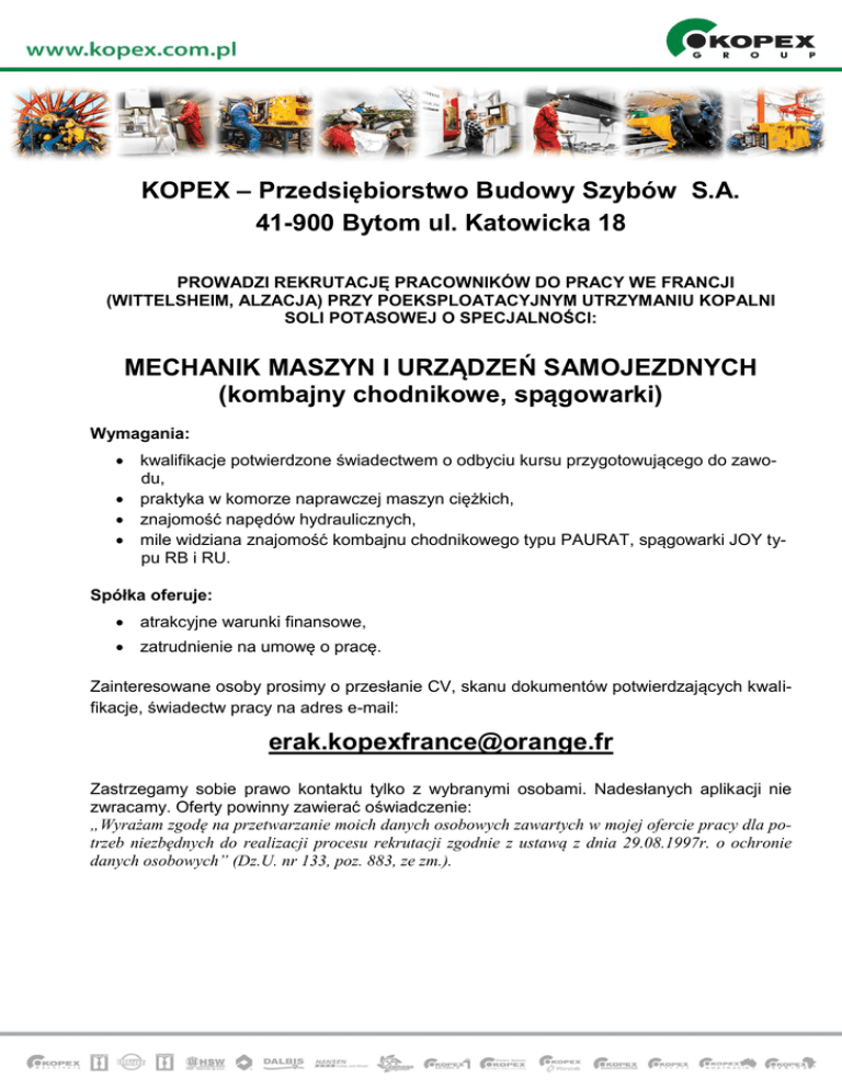 KOPEX – Przedsiębiorstwo Budowy Szybów S.A. 41-900 Bytom ul. Katowicka 18 PROWADZI REKRUTACJĘ PRACOWNIKÓW DO PRACY WE FRANCJI (WITTELSHEIM, ALZACJA) PRZY POEKSPLOATACYJNYM UTRZYMANIU KOPALNI SOLI POTASOWEJ O SPECJALNOŚCI: MECHANIK MASZYN I URZĄDZEŃ SAMOJEZDNYCH (kombajny chodnikowe, spągowarki) Wymagania: kwalifikacje potwierdzone świadectwem o odbyciu kursu przygotowującego do zawodu, praktyka w komorze naprawczej maszyn ciężkich, znajomość napędów hydraulicznych, mile widziana znajomość kombajnu chodnikowego typu PAURAT, spągowarki JOY typu RB i RU. Spółka oferuje: atrakcyjne warunki finansowe, zatrudnienie na umowę o pracę. Zainteresowane osoby prosimy o przesłanie CV, skanu dokumentów potwierdzających kwalifikacje, świadectw pracy na adres e-mail: [email protected] Zastrzegamy sobie prawo kontaktu tylko z wybranymi osobami. Nadesłanych aplikacji nie zwracamy. Oferty powinny zawierać oświadczenie: „Wyrażam zgodę na przetwarzanie moich danych osobowych zawartych w mojej ofercie pracy dla potrzeb niezbędnych do realizacji procesu rekrutacji zgodnie z ustawą z dnia 29.08.1997r. o ochronie danych osobowych” (Dz.U. nr 133, poz. 883, ze zm.).
