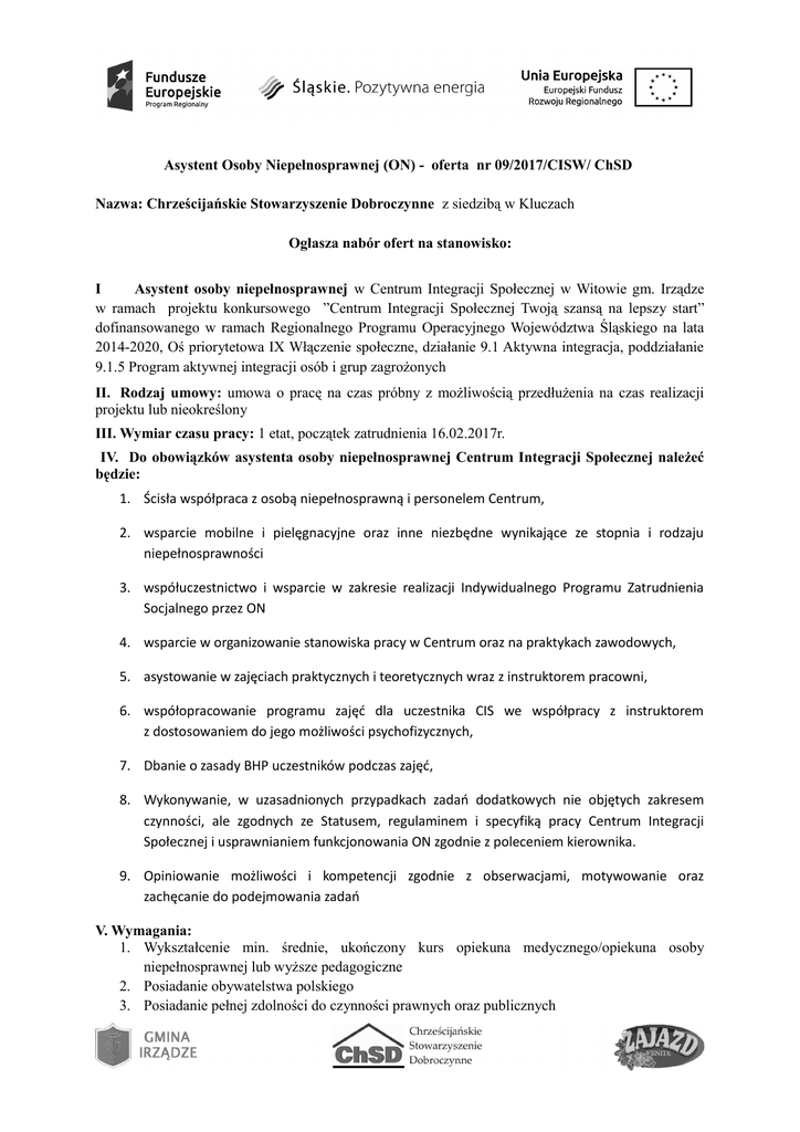Asystent Osoby Niepełnosprawnej (ON) - oferta nr 09/2017/CISW/ ChSD Nazwa: Chrześcijańskie Stowarzyszenie Dobroczynne z siedzibą w Kluczach Ogłasza nabór ofert na stanowisko: I Asystent osoby niepełnosprawnej w Centrum Integracji Społecznej w Witowie gm. Irządze w ramach projektu konkursowego ”Centrum Integracji Społecznej Twoją szansą na lepszy start” dofinansowanego w ramach Regionalnego Programu Operacyjnego Województwa Śląskiego na lata 2014-2020, Oś priorytetowa IX Włączenie społeczne, działanie 9.1 Aktywna integracja, poddziałanie 9.1.5 Program aktywnej integracji osób i grup zagrożonych II. Rodzaj umowy: umowa o pracę na czas próbny z możliwością przedłużenia na czas realizacji projektu lub nieokreślony III. Wymiar czasu pracy: 1 etat, początek zatrudnienia 16.02.2017r. IV. Do obowiązków asystenta osoby niepełnosprawnej Centrum Integracji Społecznej należeć będzie: 1. Ścisła współpraca z osobą niepełnosprawną i personelem Centrum, 2. wsparcie mobilne i pielęgnacyjne oraz inne niezbędne wynikające ze stopnia i rodzaju niepełnosprawności 3. współuczestnictwo i wsparcie w zakresie realizacji Indywidualnego Programu Zatrudnienia Socjalnego przez ON 4. wsparcie w organizowanie stanowiska pracy w Centrum oraz na praktykach zawodowych, 5. asystowanie w zajęciach praktycznych i teoretycznych wraz z instruktorem pracowni, 6. współopracowanie programu zajęć dla uczestnika CIS we współpracy z instruktorem z dostosowaniem do jego możliwości psychofizycznych, 7. Dbanie o zasady BHP uczestników podczas zajęć, 8. Wykonywanie, w uzasadnionych przypadkach zadań dodatkowych nie objętych zakresem czynności, ale zgodnych ze Statusem, regulaminem i specyfiką pracy Centrum Integracji Społecznej i usprawnianiem funkcjonowania ON zgodnie z poleceniem kierownika. 9. Opiniowanie możliwości i kompetencji zgodnie z obserwacjami, motywowanie oraz zachęcanie do podejmowania zadań V. Wymagania: 1. Wykształcenie min. średnie, ukończony kurs opiekuna medycznego/opiekuna osoby niepełnosprawnej lub wyższe pedagogiczne 2. Posiadanie obywatelstwa polskiego 3. Posiadanie pełnej zdolności do czynności prawnych oraz publicznych 4. Wiedza teoretyczna i praktyczna w zakresie opieki nad osobą niepełnosprawną udokumentowana rekomendacją lub innym dokumentem 5. Dyspozycyjność i sprawne przemieszczanie się w obszarze realizacji działań Centrum 6. Umiejętność pracy w zespole 7. Umiejętność nawiązywania dobrego kontaktu 8. Odpowiedzialność, rzetelność, samodzielność, empatia, asertywność 9. Umiejętność zachowania pełnej dyskrecji; Mile widziane: - orzeczenie o stopniu niepełnosprawności znajomość topografii obszaru objętego wsparciem prawo jazdy kat „B” znajomość języków obcych VI. Wymagane dokumenty: 1. własnoręcznie podpisany życiorys (prosimy o podanie aktualnego nr telefonu i adresu mail) 2. własnoręcznie podpisany list motywacyjny, 3. kopie dokumentów potwierdzających wykształcenie, przebyte doskonalenie zawodowe, 4. kopie dokumentów potwierdzające doświadczenie zawodowe (świadectwa pracy), 5. oświadczenie kandydata o korzystaniu w pełni z praw publicznych i o niekaralności za przestępstwa popełnione umyślnie, 6. oświadczenie o gotowości do niezwłocznego podjęcia pracy w przypadku wyboru złożonej oferty, 8. inne dodatkowe dokumenty potwierdzające kwalifikacje i umiejętności. Wymagane dokumenty powinny być opatrzone klauzulą –„Wyrażam zgodę na przetwarzanie moich danych osobowych, zawartych w ofercie pracy dla potrzeb niezbędnych do realizacji procesu rekrutacji” zgodnie z ustawą z dnia 29 sierpnia 1997r. o ochronie danych osobowych (Dz. U. z 2002 r. Nr 101, poz.926 ze zm.) VII. Co oferujemy: Wynagrodzenie miesięczne 2500,00 brutto w okresie próbnym Pracę w nowo tworzonym zespole; możliwości samorealizacji i samodoskonalenia własnych kompetencji i umiejętności; doskonalenie zawodowe w organizacji non-profit VIII. Termin, sposób i miejsce składania dokumentów: Oferty należy składać w terminie do 13.02.2017r. do godziny 13.00 osobiście w Gimnazjum w Irządzach, Sala szkoleniowa w Centrum Integracji Społecznej w zamkniętych kopertach z dopiskiem : „Nabór na stanowisko asystent osoby niepełnosprawnej w Centrum Integracji Społecznej w Witowie” IX. Informacje dodatkowe: a) oferty, które wpłyną po wyżej określonym terminie, jak również nie spełniające wymogów formalnych nie będą rozpatrywane. b) Wybrane osoby spełniające kryteria formalne konkursu zostaną powiadomione o terminie rozmowy kwalifikacyjnej telefonicznie. ( Przewidywany termin rozmowy kwalifikacyjnej 14.02. w Irządzach) c) Kandydaci, których oferty zostaną odrzucone, nie będą powiadamiani. d) Zastrzega się prawo nie wybrania żadnego kandydata.