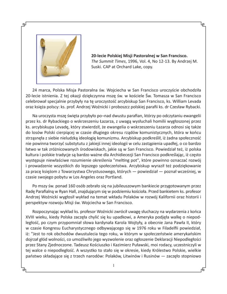 20-lecie Polskiej Misji Pastoralnej w San Francisco. The Summit Times, 1996, Vol. 4, No 12-13. By Andrzej M. Suski. CAP at Orchard Lake, copy. 24 marca, Polska Misja Pastoralna św. Wojciecha w San Francisco uroczyście obchodziła 20-lecie istnienia. Z tej okazji dziękczynna mszę św. w kościele Św. Tomasza w San Francisco celebrował specjalnie przybyły na tę uroczystość arcybiskup San Francisco, ks. William Levada oraz księża polscy: ks. prof. Andrzej Woźnicki i proboszcz polskiej parafii ks. dr Czesław Rybacki. Na uroczysta mszę święta przybyło po¬nad dwustu parafian, którzy po odczytaniu ewangelii przez ks. dr Rybackiego o wskrzeszeniu Łazarza, z uwagą wysłuchali homilii wygłoszonej przez ks. arcybiskupa Levadę, który stwierdził, że ewangelia o wskrzeszeniu Łazarza odnosi się także do losów Polski cierpiącej w czasie długiego okresu rządów komunistycznych, która w końcu strząsnęła z siebie nieludzką ideologię komunizmu. Arcybiskup podkreślił, iż żadna społeczność nie powinna tworzyć substytutu z jakiejś innej ideologii w celu zastąpienia upadłej, o co bardzo łatwo w tak zróżnicowanych środowiskach, jakie są w San Francisco. Powiedział też, iż polska kultura i polskie tradycje są bardzo ważne dla Archidiecezji San Francisco podkreślając, iż często występuje niewłaściwe rozumienie określenia "melting pot", które powinno oznaczać rozwój i prowadzenie wszystkich do lepszego społeczeństwa. Arcybiskup wyraził też podziękowanie za pracę księżom z Towarzystwa Chrystusowego, których — powiedział — poznał wcześniej, w czasie swojego pobytu w Los Angeles oraz Portland. Po mszy św. ponad 160 osób zebrało się na jubileuszowym bankiecie przygotowanym przez Radę Parafialną w Ryan Hall, znajdującym się w podziemiu kościoła. Przed bankietem ks. profesor Andrzej Woźnicki wygłosił wykład na temat wkładu Polaków w rozwój Kalifornii oraz historii i perspektyw rozwoju Misji św. Wojciecha w San Francisco. Rozpoczynając wykład ks. profesor Woźnicki zwrócił uwagę słuchaczy na wydarzenia z końca XVIII wieku, kiedy Polska zaczęła chylić się ku upadkowi, a Ameryka podjęła walkę o niepodległość, po czym przypomniał słowa kardynała Karola Wojtyły, a obecnie Jana Pawła II, który w czasie Kongresu Eucharystycznego odbywającego się w 1976 roku w Filadelfii powiedział, iż: "Jest to rok obchodów dwustulecia tego roku, w którym w społeczeństwie amerykańskim dojrzał głód wolności, co umożliwiło jego wyzwolenie oraz ogłoszenie Deklaracji Niepodległości przez Stany Zjednoczone. Tadeusz Kościuszko i Kazimierz Puławski, moi rodacy, uczestniczyli w tej walce o niepodległość. A wszystko to stało się w okresie, kiedy Królestwo Polskie, wielkie państwo składające się z trzech narodów: Polaków, Litwinów i Rusinów — zaczęło stopniowo 1 tracić niepodległość stając się łupem swoich zaborczych sąsiadów: Austrii, Prus i Rosji. W tym samym czasie, kiedy Stany Zjednoczone uzyskały niepodległość, myśmy stracili możliwość posiadania własnego państwa na ponad sto lat." Następnie ks. prof. Woźnicki stwierdził, że właśnie ten głód wolności był i jest głównym powodem, dla którego miliony Polaków przybywały do Stanów Zjednoczonych, gdzie tworzyli sobie warunki do życia i rozwoju socjalnego, politycznego oraz kulturalnego i religijnego. Wspominając, iż kolejne fale polskich uchodźców są związane z upadkami polskich powstań narodowych, przypomniał nazwiska tych Polaków, którzy przybywając tutaj pracowali na rzecz rozwoju Kalifornii, tworząc podstawy życia społecznego i kulturalnego tego kraju. Jednym z nich był książę Rouissillon, którego prawdziwego nazwiska nie znamy, a który jako pierwszy Polak przybył do Kalifornii z Meksyku w 1802 roku. Kolejnym był kapitan Dionizy Zaremba, który w 1827 roku przybył do Fort Ross dowodząc statkiem "Ochock", a następnie na statku "Urup" dopłynął aż do Bodega Bay. Kapitan Zaremba był także tym przedstawicielem Rosyjsko-Amerykańskiej Kompanii Futrzanej, który sprzedając Fort Ross (znajdujący się niedaleko na północ od San Francisco) kalifornijskiemu osadnikowi Johnowi Sutterowi w 1841 roku — zakończył tym samym rosyjską obecność w Kalifornii. W tym samym okresie — mówił ks. prof. Woźnicki — przebywali tutaj: kapitan Stefan Waliwoda na statku "Elena", budowniczy miasta Friant City, Albert Pułaski oraz Stanislaw Pongowski i Henryk Brolaski. Po tej pierwszej generacji polskich pionierów, można było dostrzec kolejnych osadników, którzy mieli bardziej sys¬tematyczny i większy wkład w rozwój Kalifornii. Byli to: Kazimierz Bielawski, założyciel Polish Society of Kalifornia, gen. Włodzimierz Krzyżanowski, uczest¬nik wojny secesyjnej, Gabriel Sovulewski, odkrywca szlaków w Yosemite National Park, Jan Teofil Strentzel, ojciec kalifornijskiego rolnictwa, Felix Paul Wierzbicki, autor pierwszej książki o Kalifornii opublikowanej po angielsku na zachód od Gór Skalistych czy Alexander Zakrzewski, twórca pierwszej mapy San Francisco. W Kalifornii przebywali też: pisarz Henryk Sienkiewicz oraz słynne aktorki: Helena Modrzejewska i Pola Negri. W części referatu dotyczącej historii polskiej Misji św. Wojciecha w San Francisco, ks. prof. Woźnicki wspomniał o tym, że latach 1856-1921 w tym rejonie było ponad dwadzieścia różnych parafii etnicznych, jednak nie było parafii polskiej. Próba zgromadzenia funduszy i budowy kościoła w latach dwudziestych nie udała się, z uwagi na przedwczesną śmierć ks. Jana Kanty Rozmusa. Dopiero po drugiej wojnie światowej arcybiskup San Francisco, John J. Mitty, wyraził zgodę na przybycie z Niemiec kilkunastu księży polskich, którzy zostali uwolnieni z hitlerowskich obozów koncentracyjnych przez armię gen. George S. Pattona i odmówili powrotu do komunistycznej Polski. Umożliwiło to w latach 195