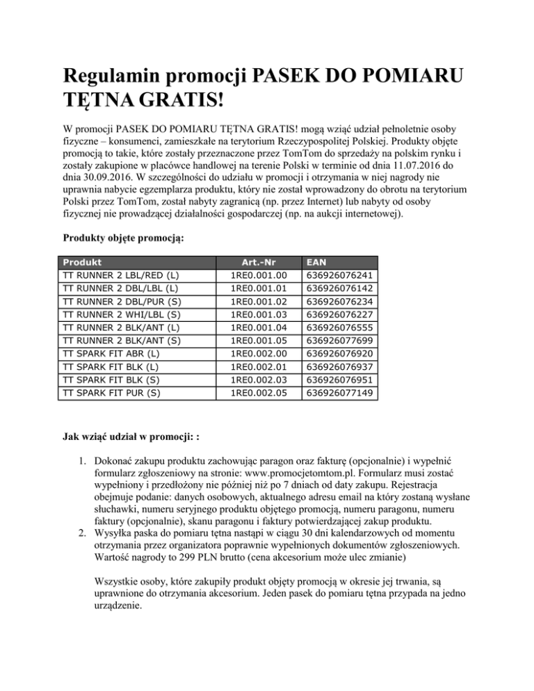 Regulamin promocji PASEK DO POMIARU TĘTNA GRATIS! W promocji PASEK DO POMIARU TĘTNA GRATIS! mogą wziąć udział pełnoletnie osoby fizyczne – konsumenci, zamieszkałe na terytorium Rzeczypospolitej Polskiej. Produkty objęte promocją to takie, które zostały przeznaczone przez TomTom do sprzedaży na polskim rynku i zostały zakupione w placówce handlowej na terenie Polski w terminie od dnia 11.07.2016 do dnia 30.09.2016. W szczególności do udziału w promocji i otrzymania w niej nagrody nie uprawnia nabycie egzemplarza produktu, który nie został wprowadzony do obrotu na terytorium Polski przez TomTom, został nabyty zagranicą (np. przez Internet) lub nabyty od osoby fizycznej nie prowadzącej działalności gospodarczej (np. na aukcji internetowej). Produkty objęte promocją: Produkt Art.-Nr EAN TT RUNNER 2 LBL/RED (L) 1RE0.001.00 636926076241 TT RUNNER 2 DBL/LBL (L) 1RE0.001.01 636926076142 TT RUNNER 2 DBL/PUR (S) TT RUNNER 2 WHI/LBL (S) 1RE0.001.02 1RE0.001.03 636926076234 636926076227 TT RUNNER 2 BLK/ANT (L) 1RE0.001.04 636926076555 TT RUNNER 2 BLK/ANT (S) 1RE0.001.05 636926077699 TT SPARK FIT ABR (L) 1RE0.002.00 636926076920 TT SPARK FIT BLK (L) TT SPARK FIT BLK (S) 1RE0.002.01 1RE0.002.03 636926076937 636926076951 TT SPARK FIT PUR (S) 1RE0.002.05 636926077149 Jak wziąć udział w promocji: : 1. Dokonać zakupu produktu zachowując paragon oraz fakturę (opcjonalnie) i wypełnić formularz zgłoszeniowy na stronie: www.promocjetomtom.pl. Formularz musi zostać wypełniony i przedłożony nie później niż po 7 dniach od daty zakupu. Rejestracja obejmuje podanie: danych osobowych, aktualnego adresu email na który zostaną wysłane słuchawki, numeru seryjnego produktu objętego promocją, numeru paragonu, numeru faktury (opcjonalnie), skanu paragonu i faktury potwierdzającej zakup produktu. 2. Wysyłka paska do pomiaru tętna nastąpi w ciągu 30 dni kalendarzowych od momentu otrzymania przez organizatora poprawnie wypełnionych dokumentów zgłoszeniowych. Wartość nagrody to 299 PLN brutto (cena akcesorium może ulec zmianie) Wszystkie osoby, które zakupiły produkt objęty promocją w okresie jej trwania, są uprawnione do otrzymania akcesorium. Jeden pasek do pomiaru tętna przypada na jedno urządzenie. Wszelkie niekompletne i nieprawidłowe formularze zgłoszeniowe zostaną automatycznie odrzucone, a do Uczestników zostaną wysłane stosowne powiadomienia e-mail. Niekompletne formularze zgłoszeniowe należy uzupełnić i ponownie przesłać w ciągu 7 (siedmiu) dni roboczych od daty otrzymania powiadomienia. W przeciwnym razie formularz nie zostanie przetworzony. Zgłoszenie jest uznawane za niekompletne w przypadku, gdy spełnia jedno lub więcej spośród następujących kryteriów: 1. Zakupiony produkt nie jest objęty Promocją. 2. Zakupiony produkt nie zostal zakupiony w odpowiedniej placowce. 3. Produkt promocyjny został nabyty poza Okresem zakupu. 4. Produkt promocyjny został zwrócony. 5. Produkt promocyjny nie został zakupiony u kwalifikującego się sprzedawcy. 6. Procedura rejestracji została zakończona po wyznaczonym terminie. 7. W formularzu zgłoszeniowym brakuje jakichkolwiek wymaganych informacji/ skanów dokumentów. 8. Nie dostarczono dowodu zakupu lub dostarczony dowód zakupu jest nieważny. 9. Dostarczono nieprawidłowe zdjęcie/kopię dowodu zakupu Produktu objetego promocją, 10. Dostarczono niepełne lub nieprawidłowe dane bankowe. 11. Brak dowodu zakupu pakietu startowego na dowolny bieg w 2016. 3. Uczestnik musi postępować zgodnie z opisaną procedurą oraz z warunkami ogólnymi, w tym także stosować się do określonych terminów i wymogów Promocji. Uczestnicy muszą zakończyć procedurę rejestracji do godziny 23:59 czasu środkowoeuropejskiego w dniu 7 października 2016 r. Warunki ogólne: 1. W Promocji mogą wziąć udział Uczestnicy, którzy ukończyli osiemnaście (18) lat, z wykluczeniem sprzedawców hurtowych i detalicznych sprzedających dowolne produkty firmy TomTom oraz pracowników firmy TomTom. Promocja dotyczy wyłącznie Produktu promocyjnego zakupionego od uczestniczących w promocji sprzedawców w oryginalnym opakowaniu i obowiązuje według uznania firmy TomTom. Produkty promocyjne, które nie zostały zakupione od uczestniczącego w promocji sprzedawcy, np. produkty promocyjne zakupione od sprzedawców produktów innych dostawców (np. eBay, Amazon, ING rentepunten, itp.), nie będą brane pod uwagę i nie są objęte tą promocją. 2. Firma TomTom szanuje prywatność Uczestników i dba o to, aby wszystkie dane osobowe były przetwarzane zgodnie z polityką prywatności firmy TomTom. Szczegóły znajdują się na stronie www.tomtom.com/legal/privacy/. 3. Uczestnicy mają prawo do uzyskania informacji o swoich danych, a jeśli zajdzie taka potrzeba, również do sprostowania lub usunięcia swoich danych przechowywanych przez firmę TomTom. Tego typu prośby należy kierować do firmy TomTom na adres: [email protected]. 4. Firma TomTom nie ponosi odpowiedzialności (także prawnej) za zagubione, opóźnione, uszkodzone lub mylnie skierowane zgłoszenia rejestracyjne, jak również za zagubione, opóźnione, uszkodzone lub mylnie skierowane wysyłki kurierskie. 5. Promocja nie łączy się z innymi promocjami oferowanymi przez firmę TomTom — od momentu rozpoczęcia Promocji do Dnia zakończenia. 6. Aby uzyskać dalsze informacje o Promocji, produktach i usługach firmy TomTom nalezy skontaktować się z działem obsługi klienta firmy TomTom www.tomtom.com/support. 7. Jeśli którekolwiek postanowienie lub część postanowienia Promocji lub niniejszych warunków ogólnych zostanie uznane przez dowolne władze lub sąd właściwy miejscowo za niezgodne z prawem, nieprawidłowe lub niemożliwe do wyegzekwowania, postanowienie to lub jego część zostanie uznane za niestanowiące części niniejszej Promocji i nie będzie miało wpływu na zgodność z prawem, ważność lub możliwość wyegzekwo