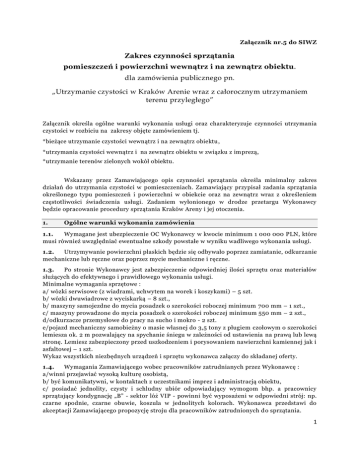 Załącznik nr.5 do SIWZ Zakres czynności sprzątania pomieszczeń i powierzchni wewnątrz i na zewnątrz obiektu. dla zamówienia publicznego pn. „Utrzymanie czystości w Kraków Arenie wraz z całorocznym utrzymaniem terenu przyległego” Załącznik określa ogólne warunki wykonania usługi oraz charakteryzuje czynności utrzymania czystości w rozbiciu na zakresy objęte zamówieniem tj. *bieżące utrzymanie czystości wewnątrz i na zewnątrz obiektu, *utrzymania czystości wewnątrz i na zewnątrz obiektu w związku z im prezą, *utrzymanie terenów zielonych wokół obiektu. Wskazany przez Zamawiającego opis czynności sprzątania określa minimalny zakres działań do utrzymania czystości w pomieszczeniach. Zamawiający przypisał zadania sprzątania określonego typu pomieszczeń i powierzchni w obiekcie oraz na zewnątrz wraz z określeniem częstotliwości świadczenia usługi. Zadaniem wyłonionego w drodze przetargu Wykonawcy będzie opracowanie procedury sprzątania Kraków Areny i jej otoczenia. 1. Ogólne warunki wykonania zamówienia 1.1. Wymagane jest ubezpieczenie OC Wykonawcy w kwocie minimum 1 000 000 PLN, które musi również uwzględniać ewentualne szkody powstałe w wyniku wadliwego wykonania usługi. 1.2. Utrzymywanie powierzchni płaskich będzie się odbywało poprzez zamiatanie, odkurzanie mechaniczne lub ręczne oraz poprzez mycie mechaniczne i ręczne. 1.3. Po stronie Wykonawcy jest zabezpieczenie odpowiedniej ilości sprzętu oraz materiałów służących do efektywnego i prawidłowego wykonania usługi. Minimalne wymagania sprzętowe : a/ wózki serwisowe (z wiadrami, uchwytem na worek i koszykami) – 5 szt. b/ wózki dwuwiadrowe z wyciskarką – 8 szt., b/ maszyny samojezdne do mycia posadzek o szerokości roboczej minimum 700 mm – 1 szt., c/ maszyny prowadzone do mycia posadzek o szerokości roboczej minimum 550 mm – 2 szt., d/odkurzacze przemysłowe do pracy na sucho i mokro - 2 szt. e/pojazd mechaniczny samobieżny o masie własnej do 3,5 tony z pługiem czołowym o szerokości lemiesza ok. 2 m pozwalający na spychanie śniegu w zależności od ustawienia na prawą lub lewą stronę. Lemiesz zabezpieczony przed uszkodzeniem i porysowaniem nawierzchni kamiennej jak i asfaltowej – 1 szt. Wykaz wszystkich niezbędnych urządzeń i sprzętu wykonawca załączy do składanej oferty. 1.4. Wymagania Zamawiającego wobec pracowników zatrudnianych przez Wykonawcę : a/winni przejawiać wysoką kulturę osobistą, b/ być komunikatywni, w kontaktach z uczestnikami imprez i administracją obiektu, c/ posiadać jednolity, czysty i schludny ubiór odpowiadający wymogom bhp. a pracownicy sprzątający kondygnację „B” - sektor lóż VIP - powinni być wyposażeni w odpowiedni strój: np. czarne spodnie, czarne obuwie, koszula w jednolitych kolorach. Wykonawca przedstawi do akceptacji Zamawiającego propozycję stroju dla pracowników zatrudnionych d o sprzątania. 1 Wyposażenie pracowników w odzież i sprzęt pozostaje po stronie Wykonawcy. d/ w trakcie imprez Wykonawca zobowiązany jest do wyposażenia pracowników w krótkofalówki, których częstotliwość winna być dopasowana do częstotliwości na jakiej pracują krótkofalówki w obiekcie w ilości minimum 5. 1.5. Zgodnie z ustalonym harmonogramem, przedstawiciele Zmawiającego i Wykonawcy będą dokonywali obchodu stref objętych sprzątaniem w celu przeprowadzenia kontroli utrzymania czystości. W przypadku stwierdzenia uchybień zostanie wyznaczony termin ich usunięcia. Z przeprowadzonej kontroli będzie sporządzany protokół. Przed imprezą obiekt będzie protokolarnie przekazywany do sprzątania. Protokół określi pomieszczenia i powierzchnie przewidziane do przygotowania dla potrzeb konkretnej imprezy. Odbiór obiektu przed imprezą będzie miał miejsce na trzy godziny przed otwarciem drzwi obiektu dla uczestników/widzów imprez. W przypadku stwierdzenia uchybień w jakości bądź zakresie wykonania usługi, Wykonawca niezwłocznie podejmie działania usunięcia stwierdzonych protokolarnie nieprawidłowości. 1.6. W przypadku nawierzchni sportowych ,sposób utrzymania czystości musi uwzględniać wymagania producenta nawierzchni zawarte w dokumentacji technicznej, dostępnej na miejscu w obiekcie. Wykonawca musi się również dostosować do dodatkowych zaleceń Zamawiającego, zgłoszonych przez organizatora imprezy. Wykonawca przedstawi wykaz środków chemicznych przewidzianych do wykorzystania przy sprzątaniu obiektu. 1.7. Wykonawca, w cenie usługi, uwzględni przewidywany koszt środków higieny (mydło, biały papier toaletowy, białe ręczniki papierowe, płyn dezynfekujący i worki na śmieci) oraz środki utrzymania czystości (m.in. płyn do mycia powierzchni, płyny dezynfekcyjne, preparaty do konserwacji różnego rodzaju powierzchni, płyn do mycia szyb, preparaty do usuwania naklejek, itp.) a nadto specjalistyczne preparaty do utrzymania nawierzchni sportowych. Wszystkie środki czystości i preparaty dezynfekcyjne stosowane na terenie obiektu muszą mieć świadectwo dopuszczenia do użytku na terenie Polski wydane przez Państwowy Zakład Higieny oraz będą zaopatrzone w ulotki w języku polskim zawierające skład chemiczny, zasad stosowania oraz opis środków bezpieczeństwa. Zamawiający przewiduje, że Kraków Arena będzie wyposażona w : 1.dozownik mydła w płynie, pojemność 300-500 ml - VIP 29 szt. 2.dozownik mydła w płynie, pojemność od 1.000 do 1.200 ml – Hala 507 szt. 3.dozownik do płynu dezynfekcyjnego, pojemność ok.1.000 ml – 12 szt. 4.dozownik do ręczników papierowych, pojemność : min 500 szt. ręczników – 167 szt. 5.dozownik do papieru toaletowego, na małe rolki – 29 szt. 6.dozownik do papieru toaletowego, na duże rolki, ok. 25 cm – 318 szt. 7. kosz na odpady, mały 5 l. – 251 szt. 8.kosz na odpady, duży ok.50 l. – 136 szt. Dla potrzeb utrzymania wysokiej jakości wykonania usługi, Wykonawca będzie 
